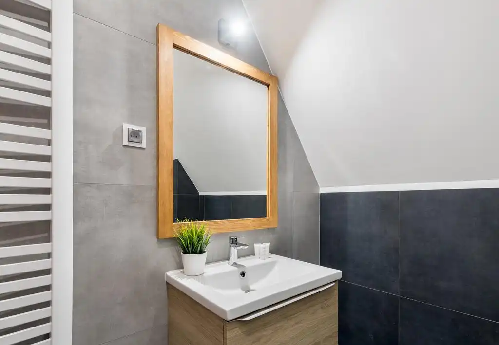 Łazienka: kabina prysznicowa, WC, umywalka, szafka na kosmetyki, lustro, grzejnik ręcznikowiec, suszarka do włosów.