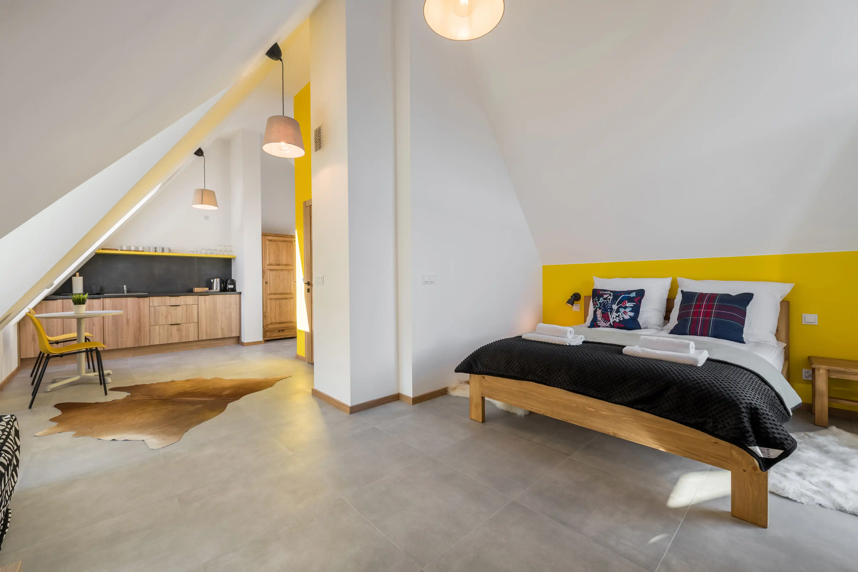 Wyjątkowa aranżacja wnętrza pomogła w stworzeniu klimatycznego miejsca. Połącznie nowoczesnego stylu oraz drewnianych dodatków sprawia, że apartament jest przytulny oraz funkcjonalny.