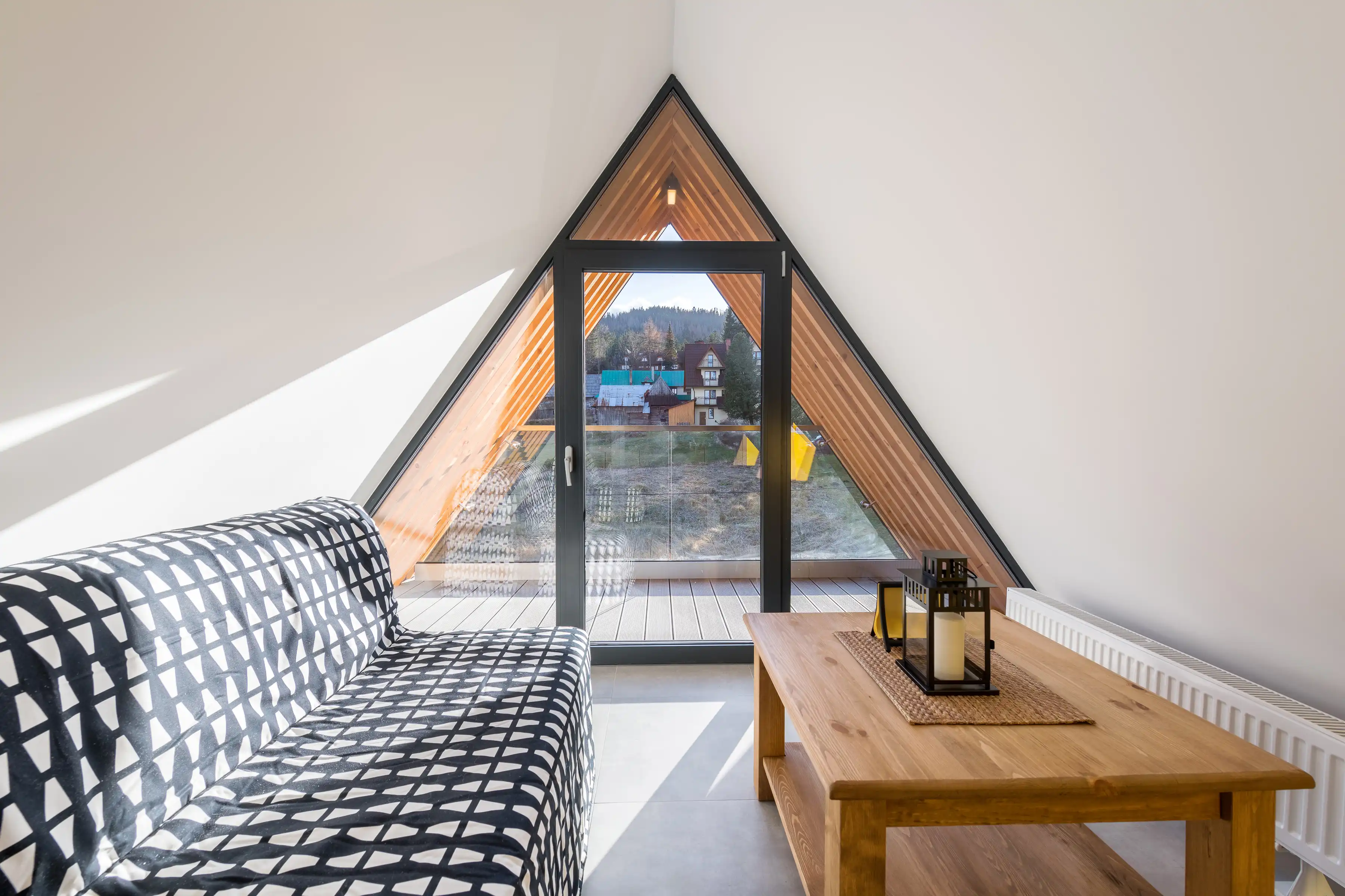 Salon: rozkładana 2 osobowa sofa, stolik kawowy, stół z 2 krzesłami, wyjście na balkon.