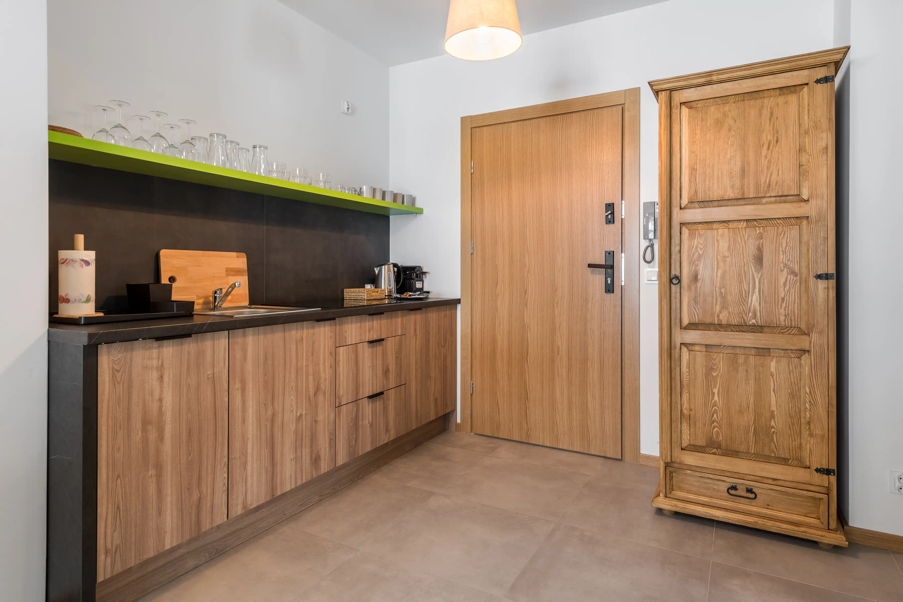 Kuchnia: zabudowa kuchenna, lodówka, ekspres do kawy, płyta indukcyjna, czajnik bezprzewodowy, zmywarka, zlewozmywak garnki i patelnie, zastawa stołowa dla 6 osób.