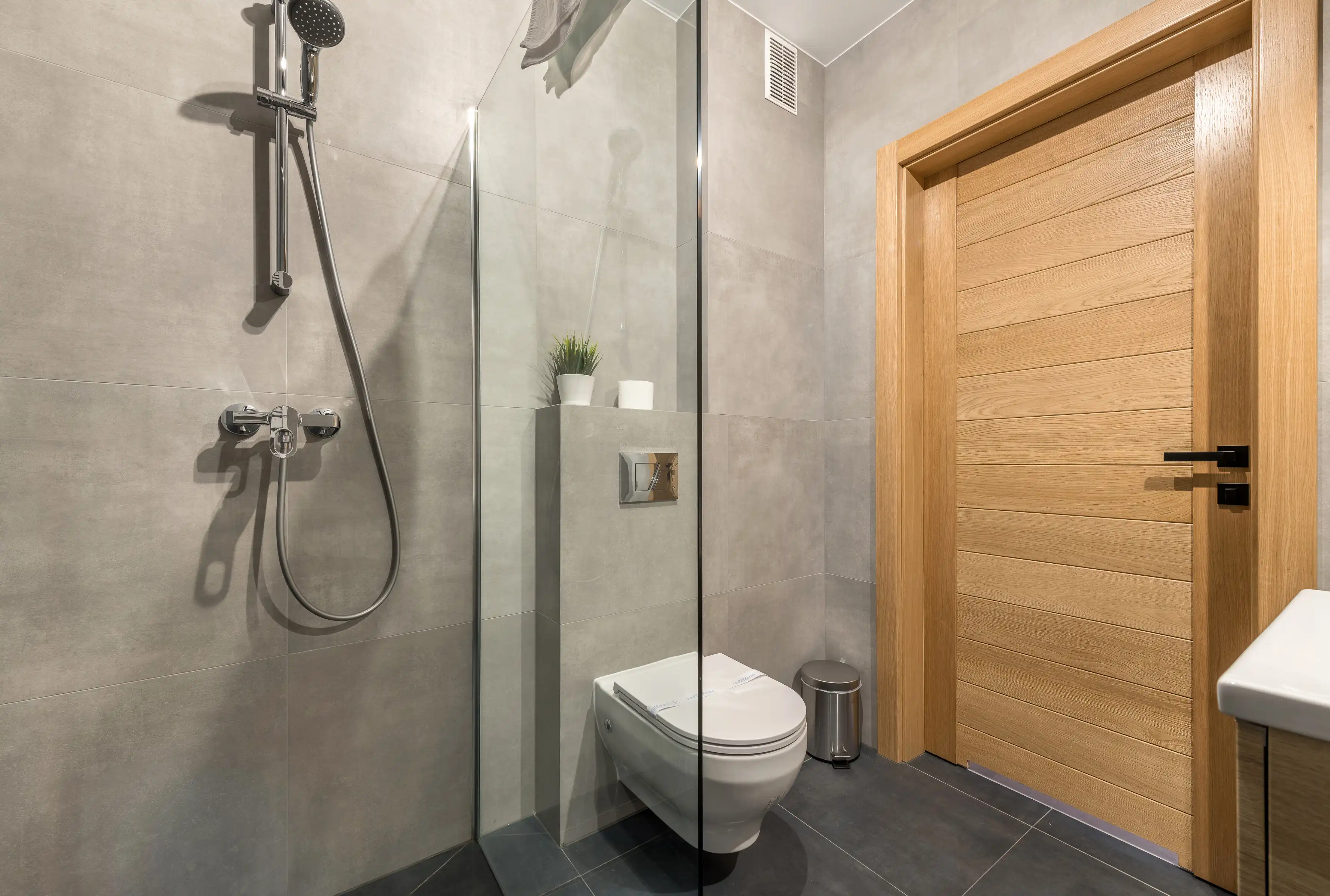 Łazienka: kabina prysznicowa, WC, umywalka, szafka na kosmetyki, lustro, grzejnik ręcznikowiec, suszarka do włosów.