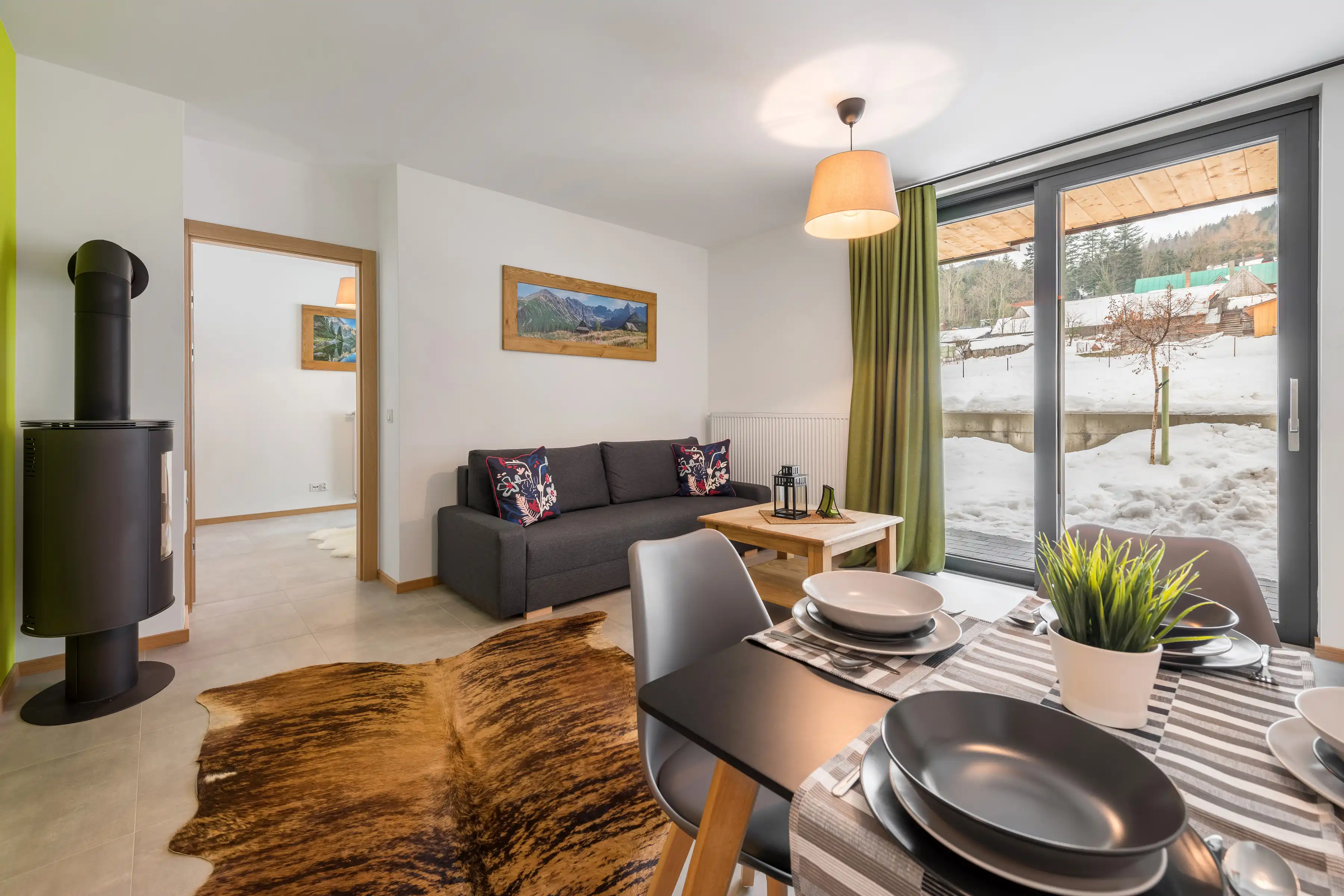 Apartament o powierzchni 58 m2 znajduje się na parterze. Składa z kuchni połączonej z przestronnym salonem z kominkiem, dwóch osobnych sypialni oraz łazienki z prysznicem. W salonie znajduje się wyjściem na taras.