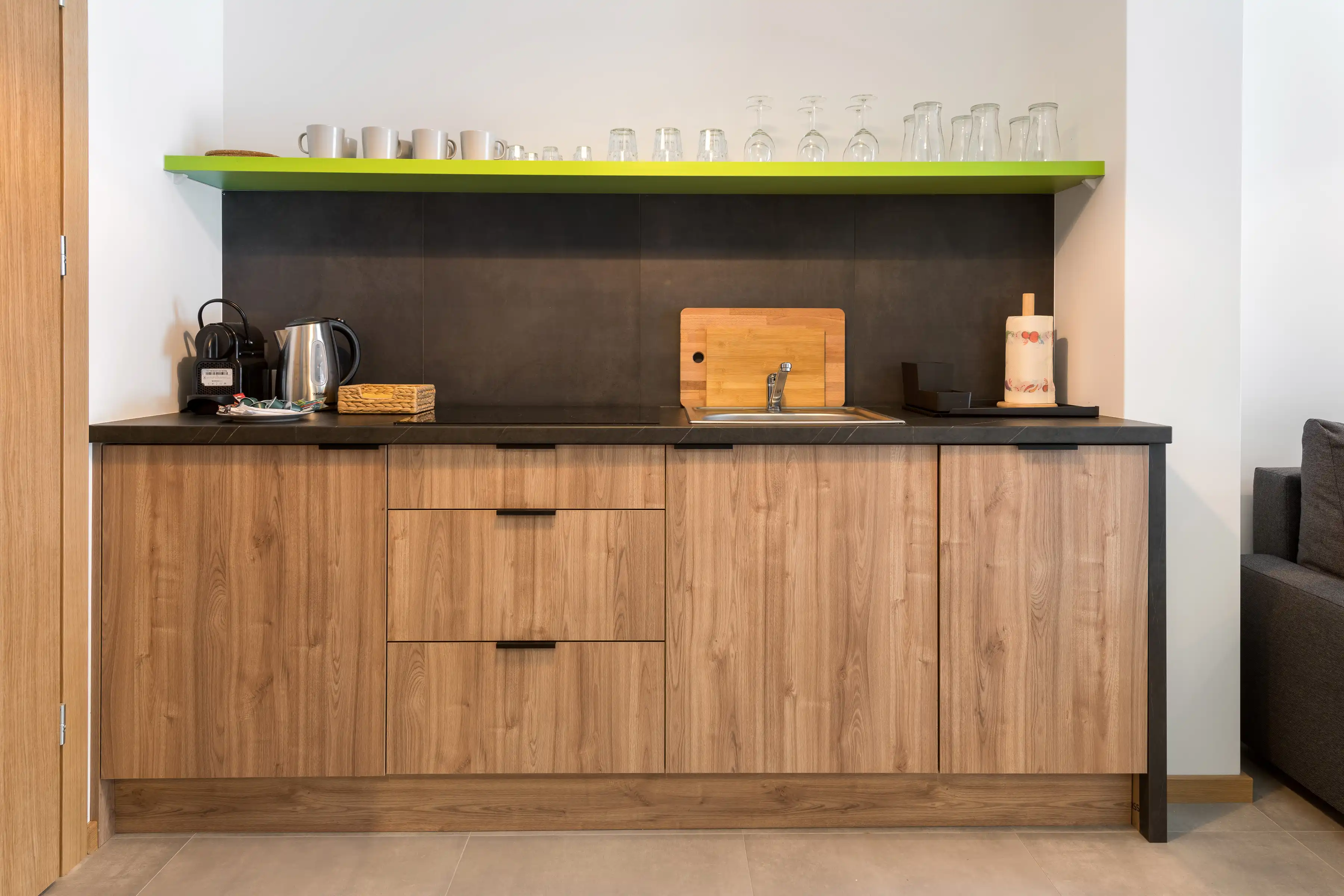 Kuchnia: zabudowa kuchenna, lodówka, ekspres do kawy, płyta indukcyjna, czajnik bezprzewodowy, zmywarka, zlewozmywak garnki i patelnie, zastawa stołowa dla 6 osób.
