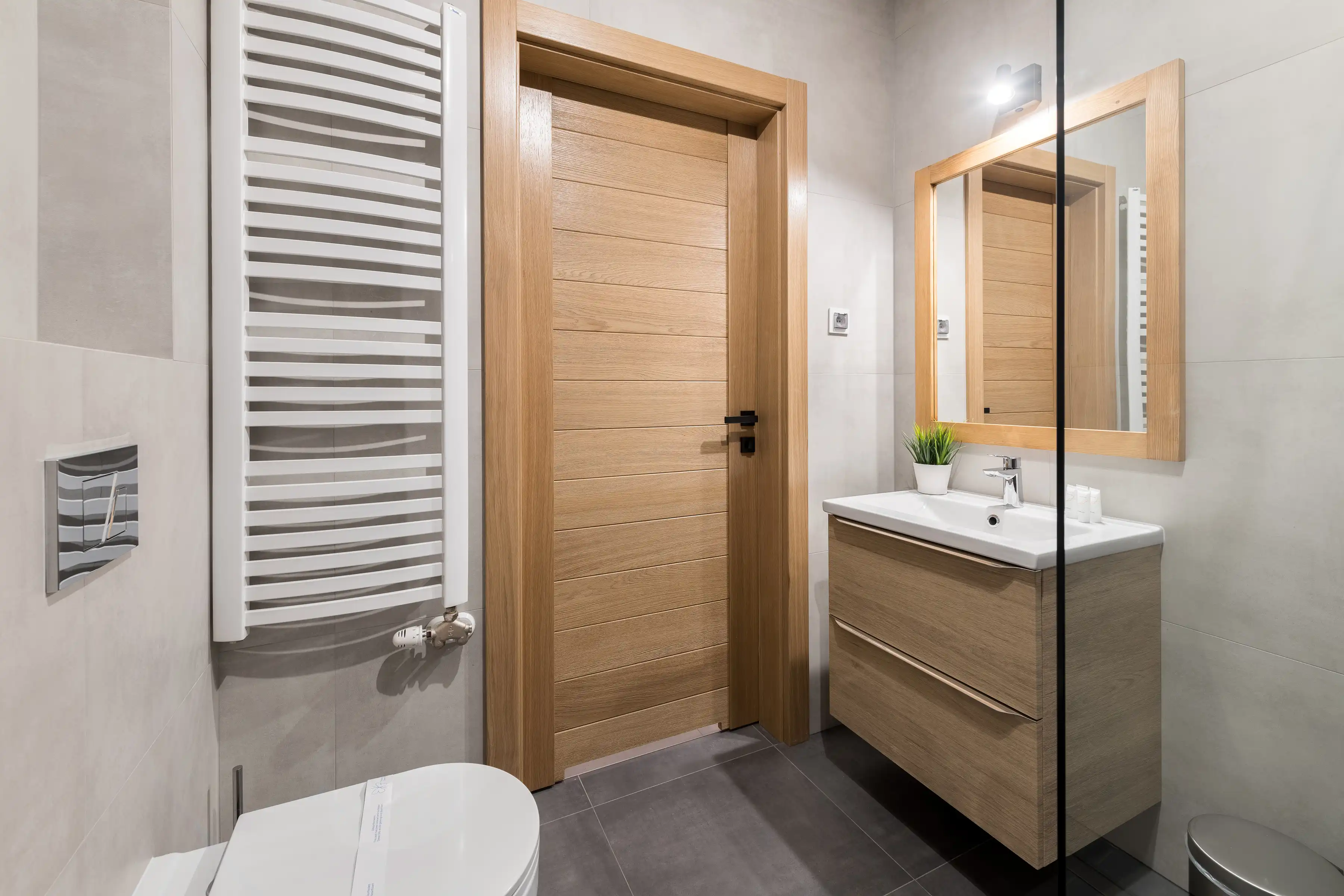 Łazienka: kabina prysznicowa, WC, umywalka, szafka na kosmetyki, lustro, grzejnik ręcznikowiec, suszarka do włosów.