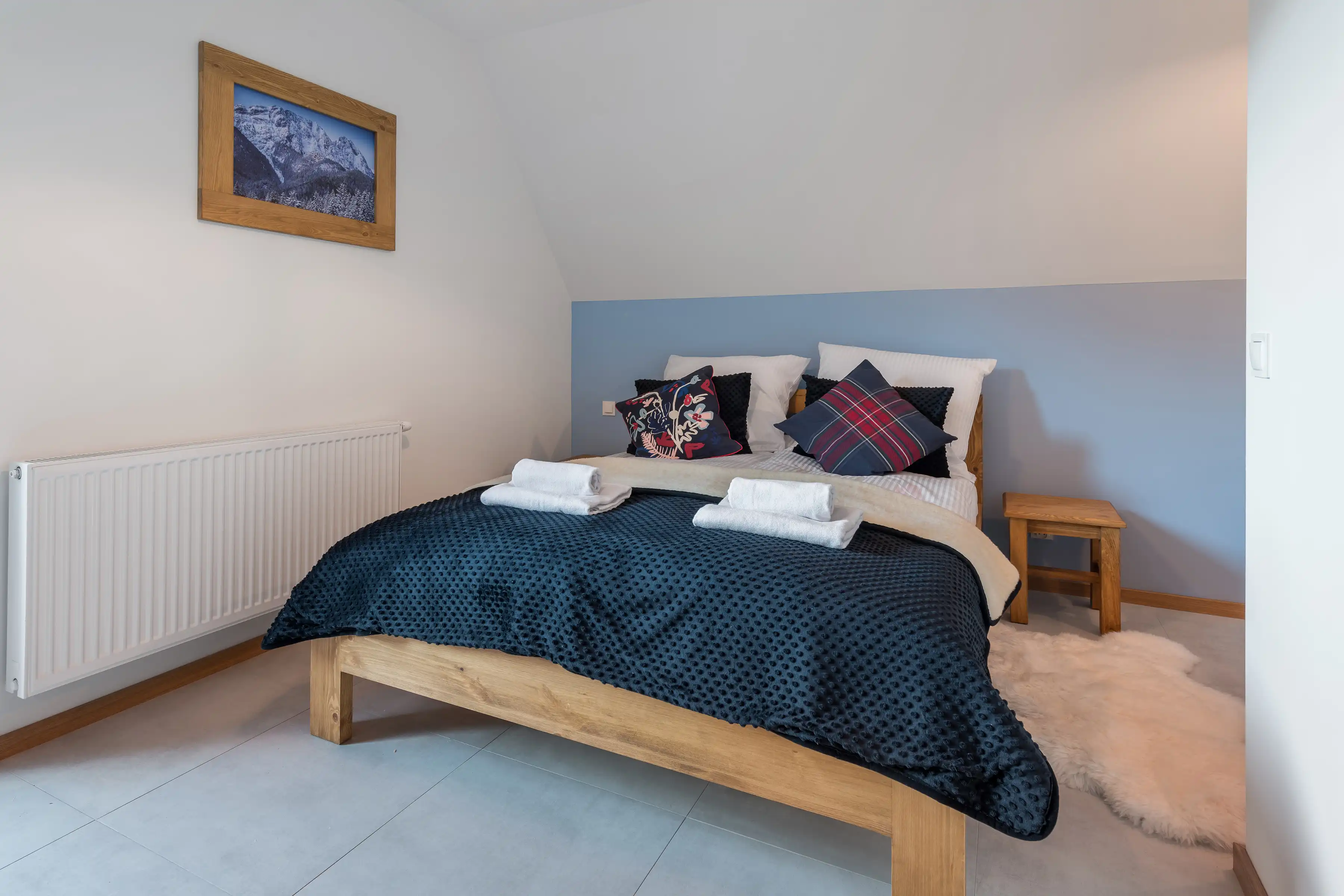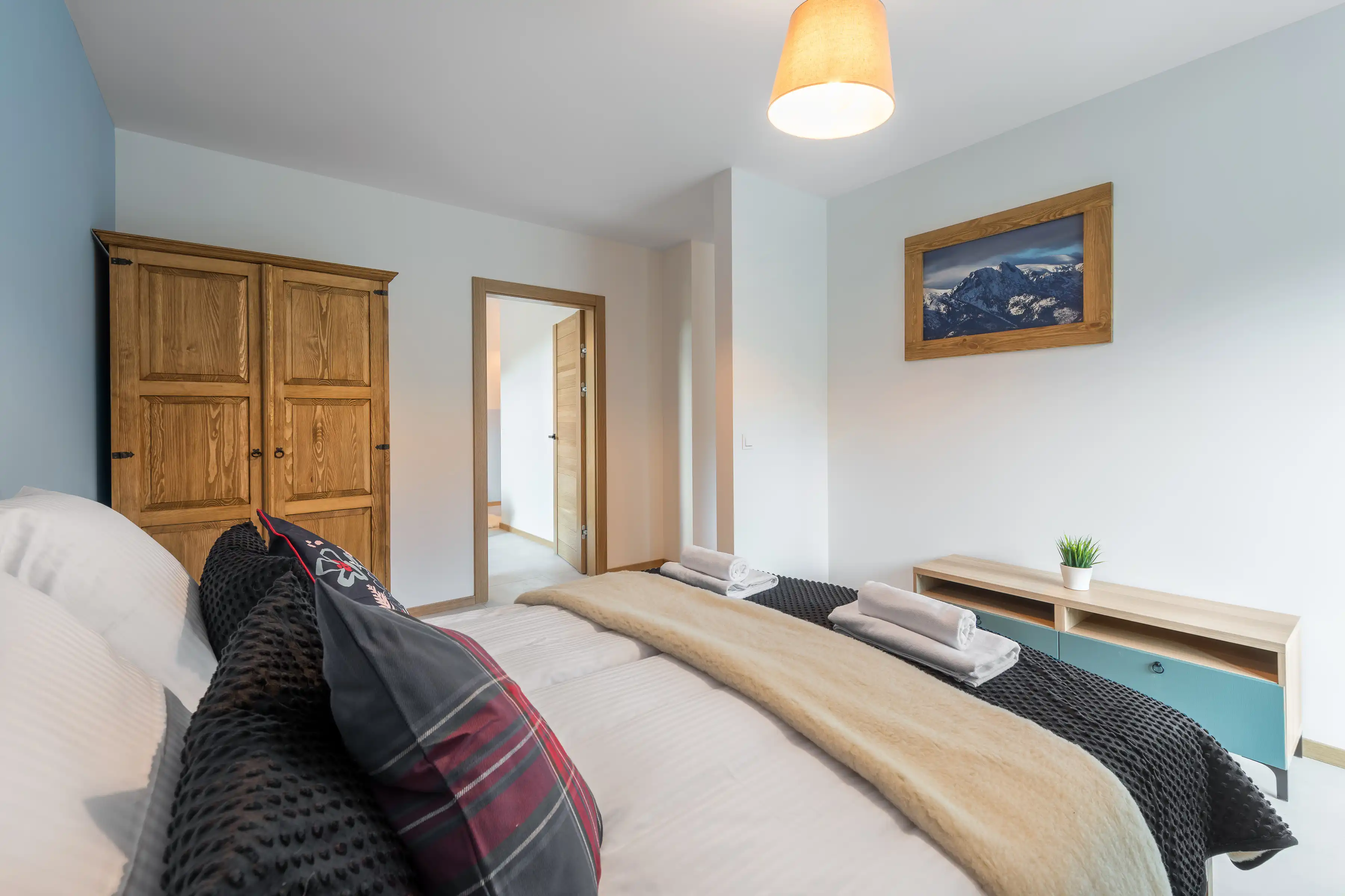 Sypialnia II: łoże małżeńskie, dwa stoliki nocne, komoda.