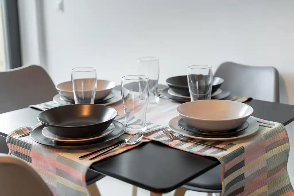 Kuchnia: zabudowa kuchenna, lodówka, ekspres do kawy, płyta indukcyjna, czajnik bezprzewodowy, zmywarka, zlewozmywak garnki i patelnie, zastawa stołowa dla 6 osób, szafa.