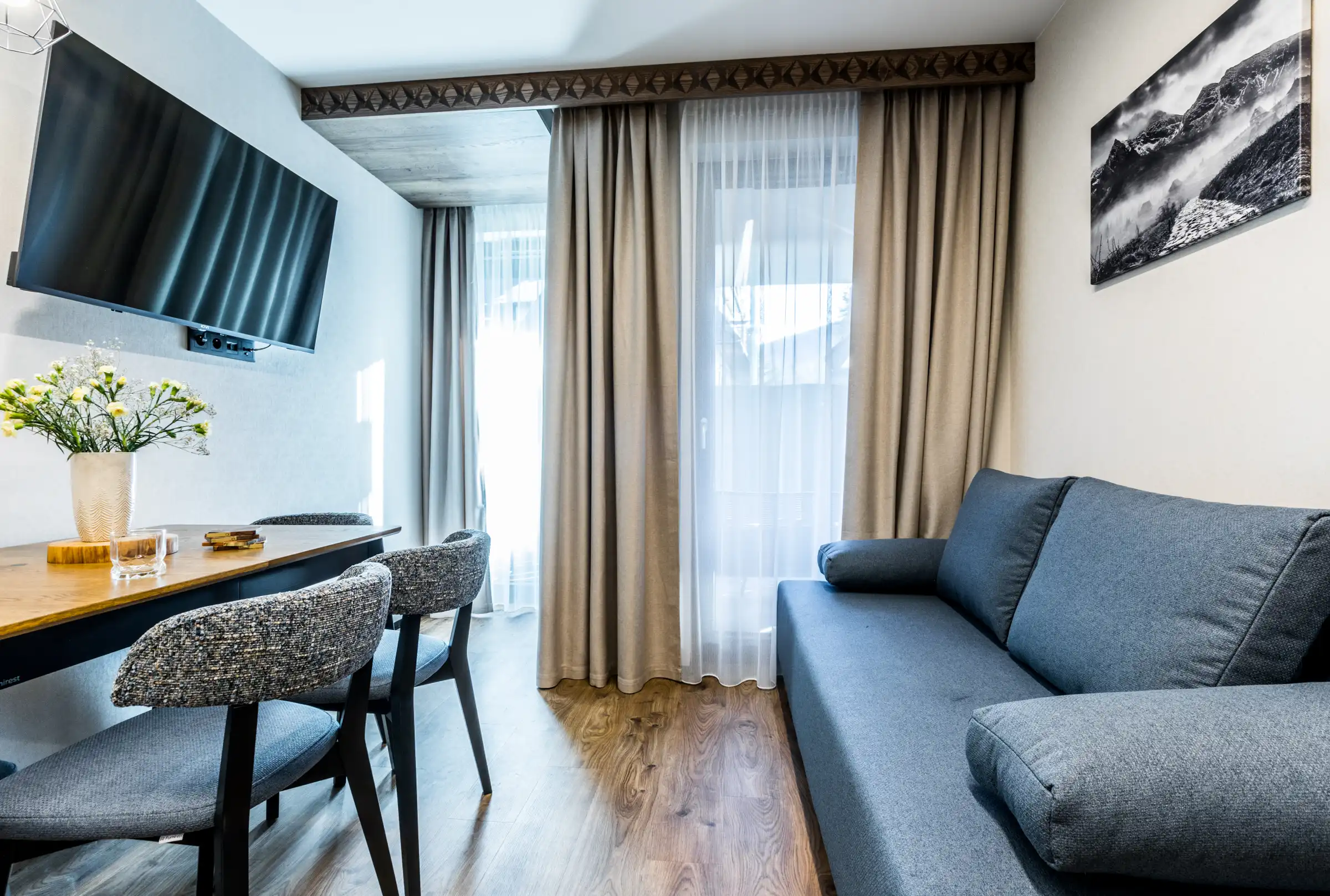 Wytworny apartament znajduje się na parterze. Składa się z przedpokoju, kuchni połączonej z salonem w którym znajduje się rozkładana sofa dla 2 osób, osobnej sypialni z łożem małżeńskim i łazienki z prysznicem. W salonie jest wyjście na taras.