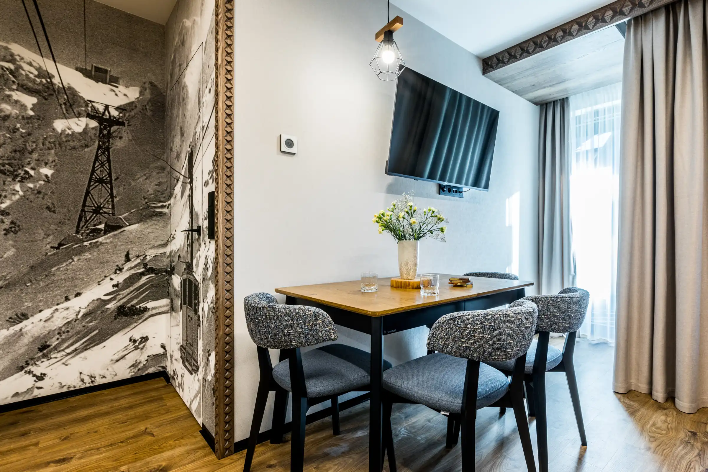 Nietuzinkowa aranżacja wnętrza pomogła w stworzeniu klimatycznego miejsca. Połącznie nowoczesnych dodatków oraz drewna sprawia, że apartament jest przytulny. Atmosferę mieszkania tworzą bowiem nietuzinkowe przepiękne meble i dodatki.