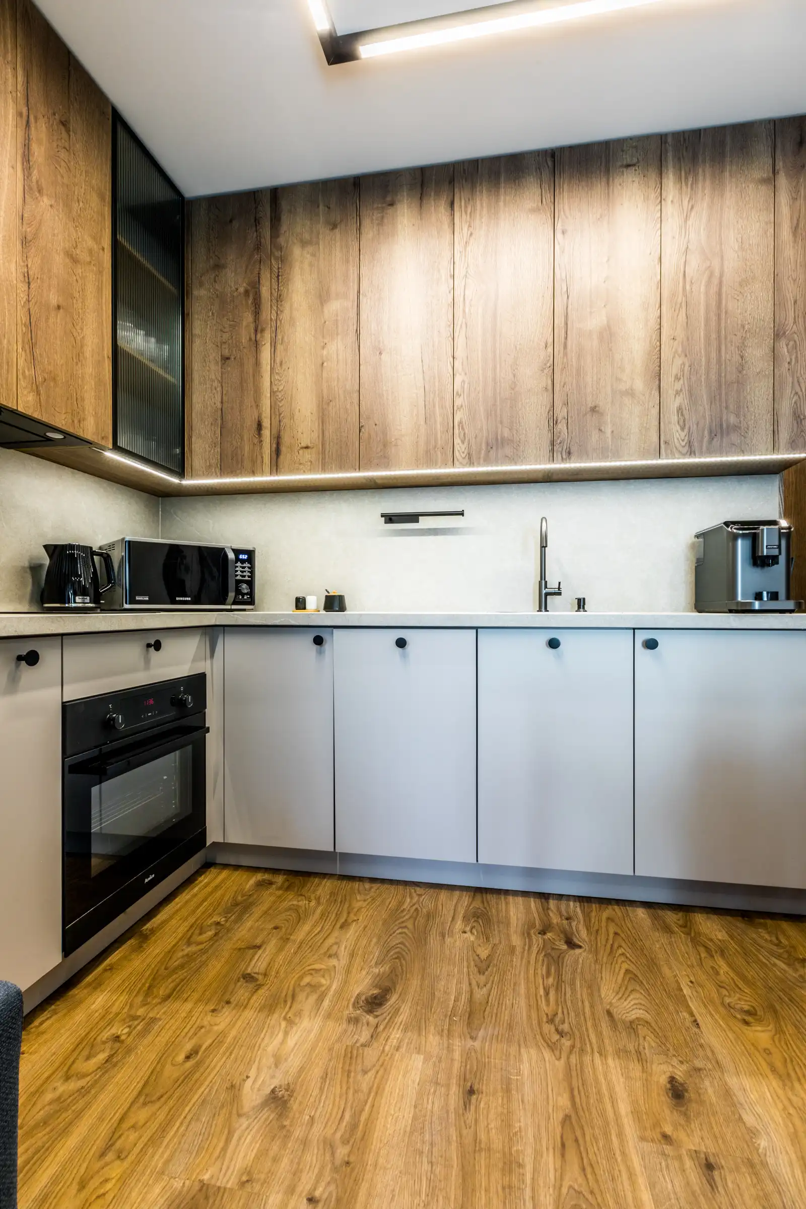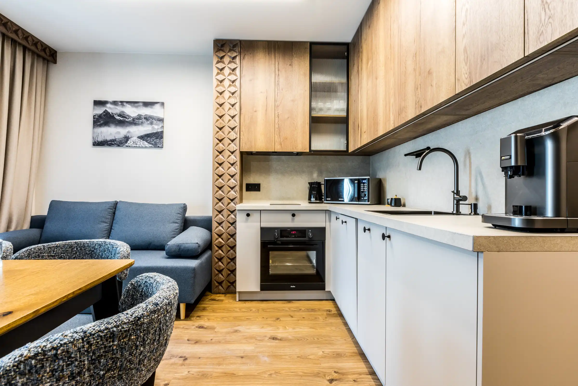 Aneks kuchenny: zabudowa kuchenna z lodówką, płytą indukcyjną, zmywarką, piekarnikiem, mikrofalą i zlewozmywakiem. Wyposażony jest w czajnik, expres do kawy, garnki i patelnie, zastawę stołową dla 4 osób.