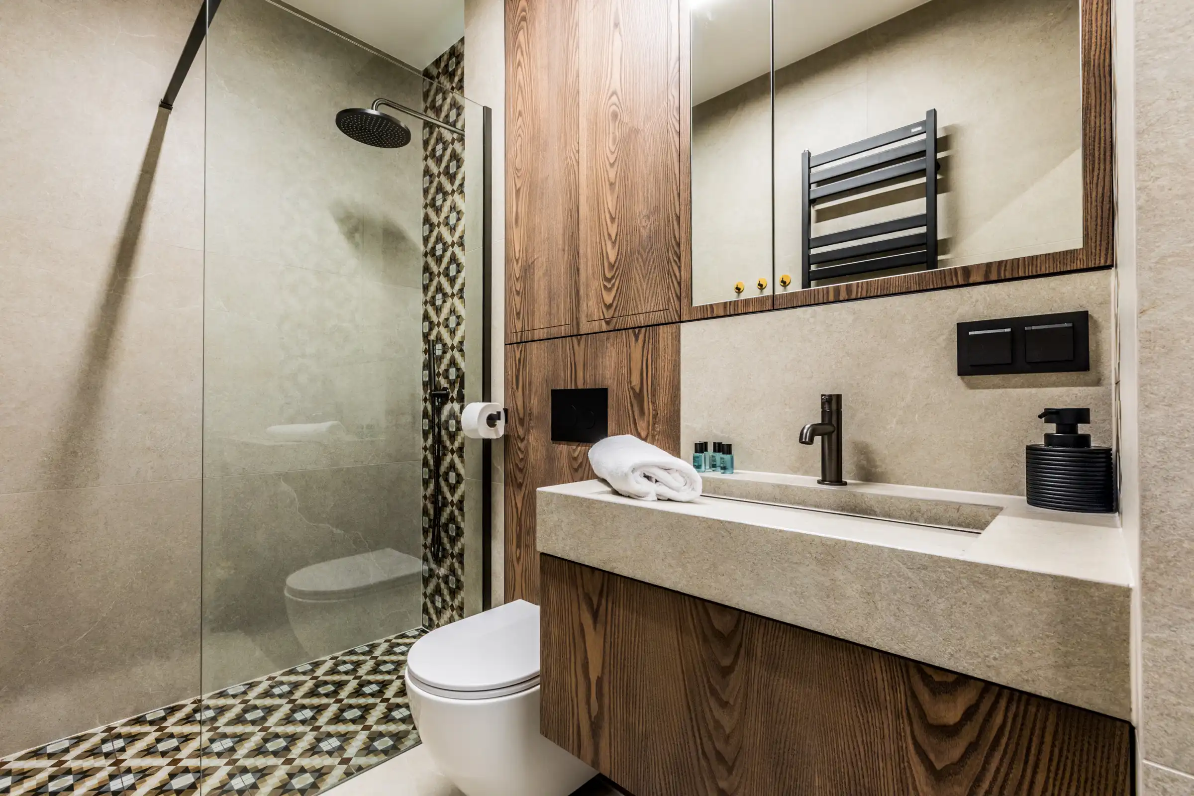 Łazienka: prysznic, toaleta, umywalka, szafka, lustro, grzejnik łazienkowy, suszarka, ręczniki.