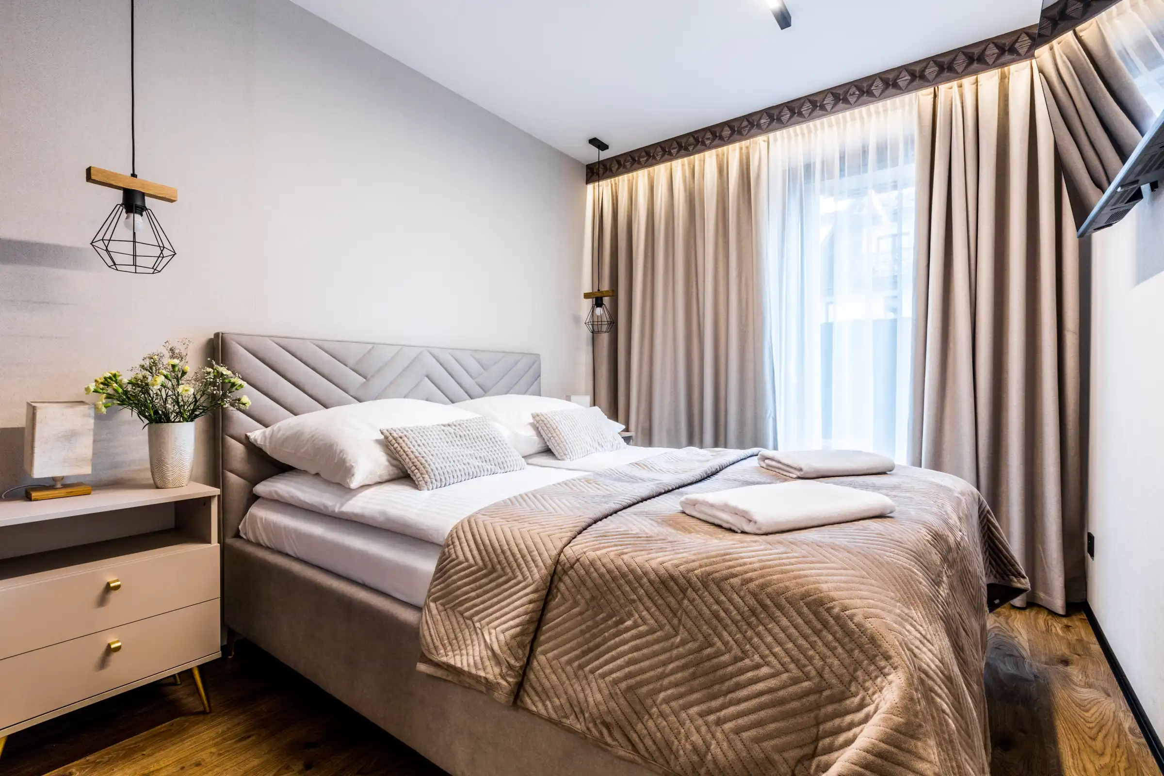 Sypialnia : łoże małżeńskie, dwa stoliki nocne wraz z oświetleniem, TV, pojemna szafa.