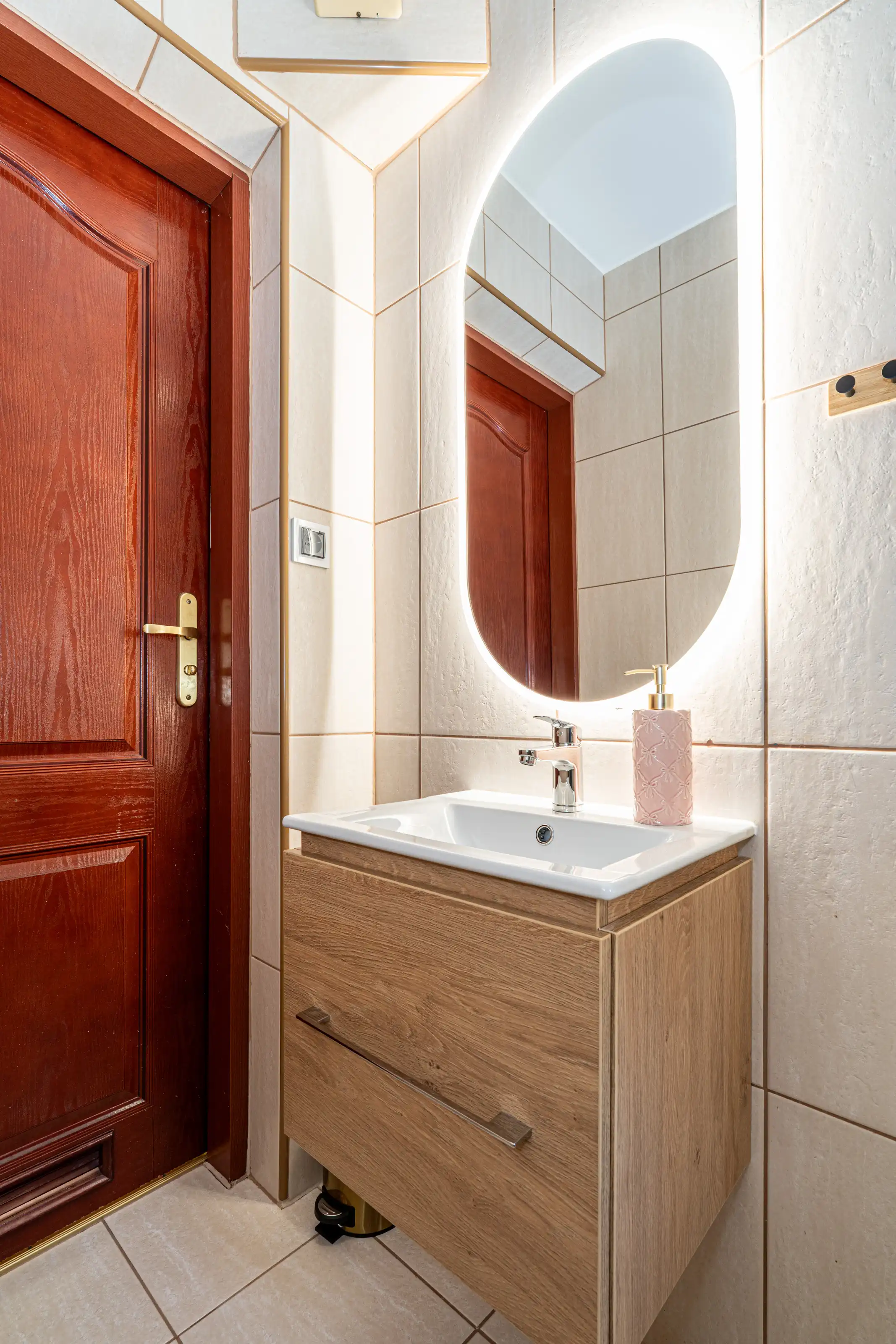 Łazienka I: wanna, WC, umywalka, lustro, suszarka do włosów.