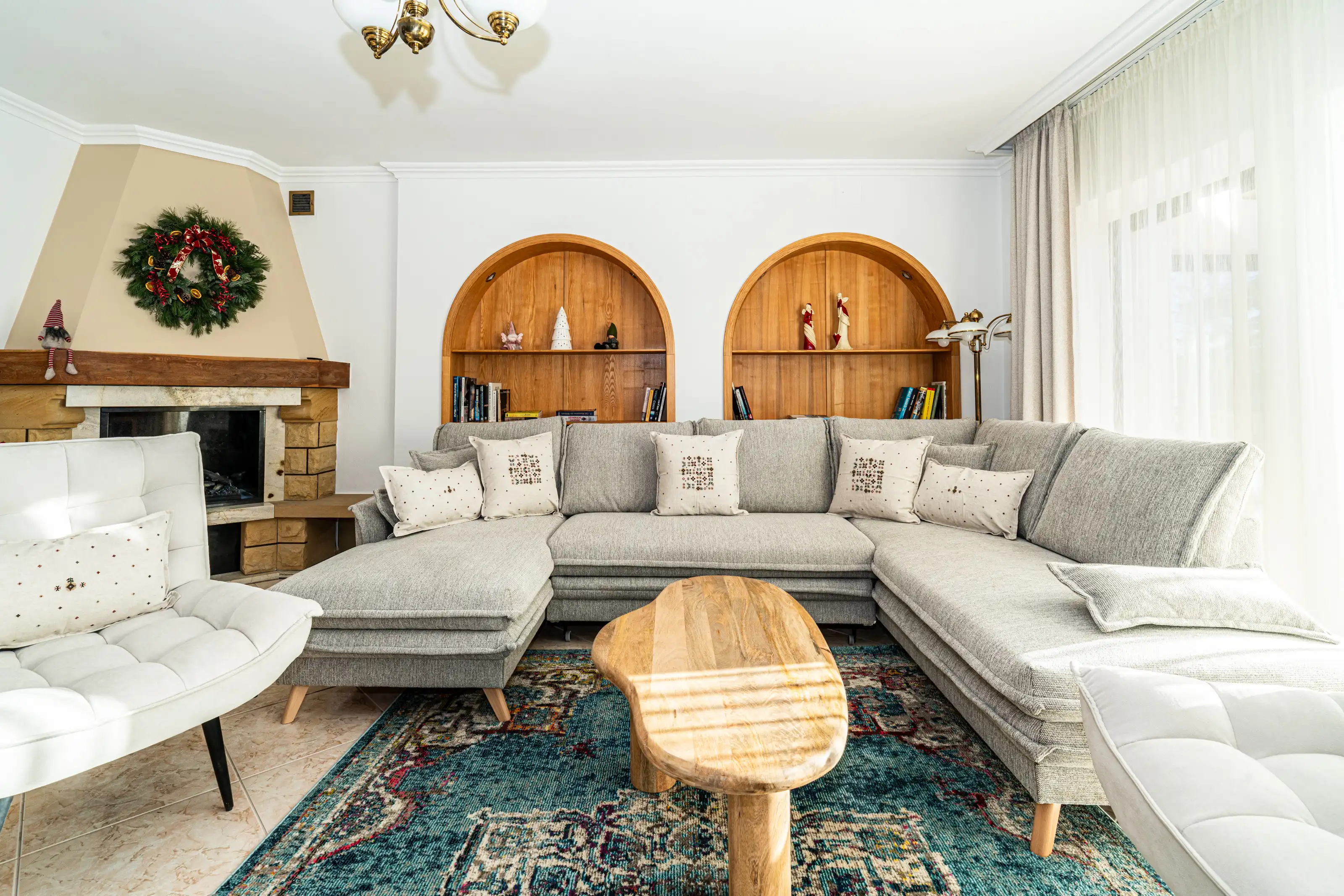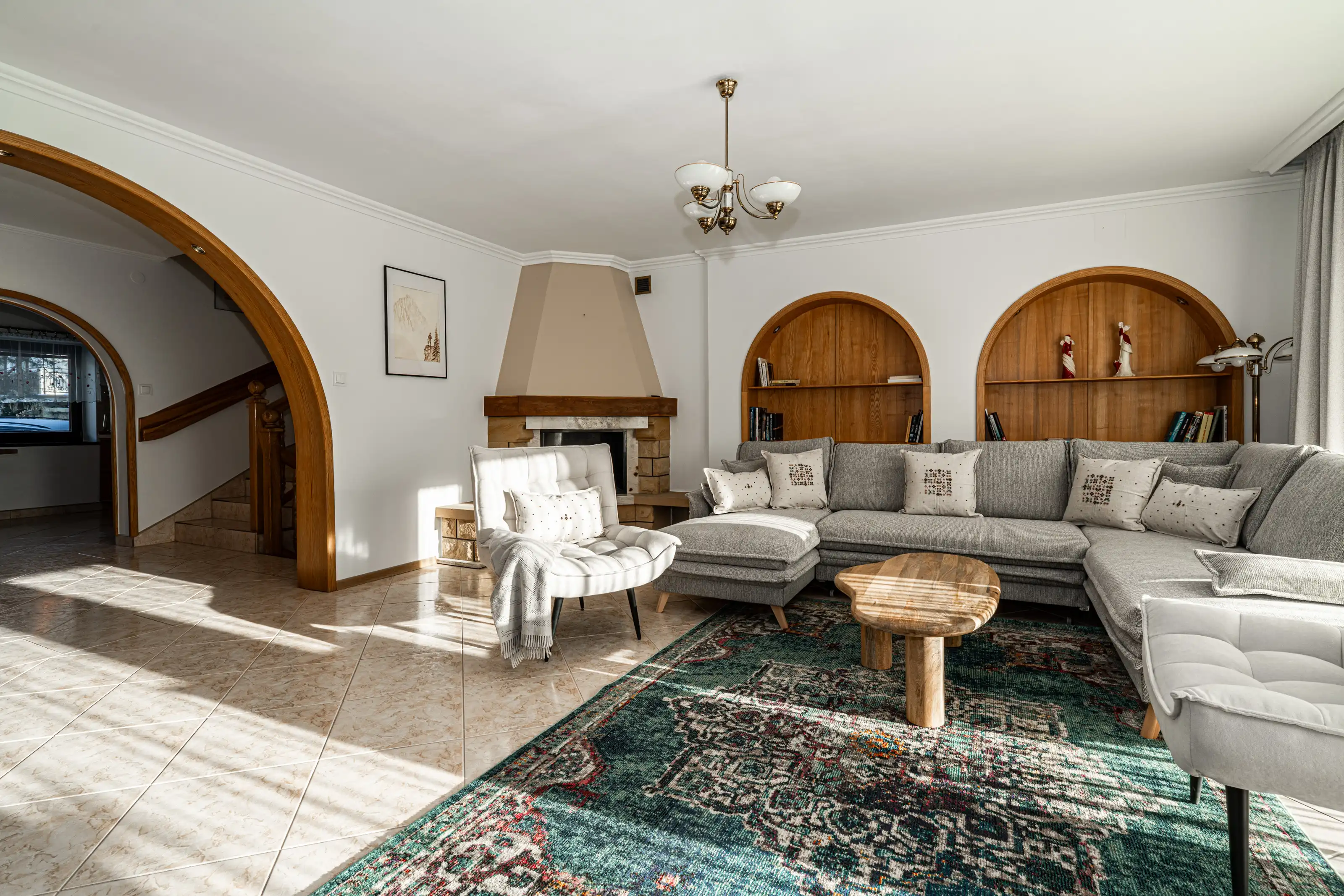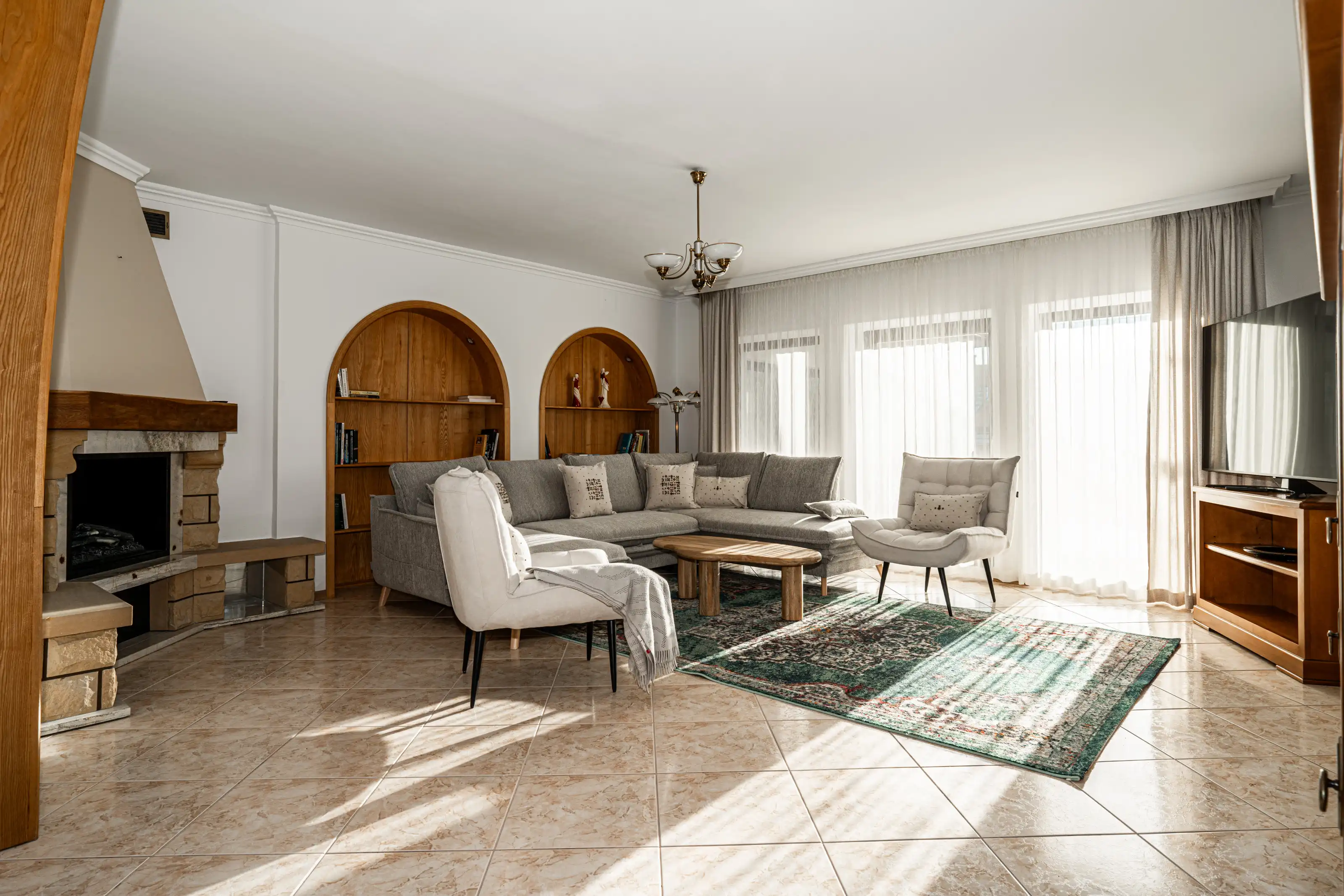 Salon: komoda, rozkładany dwuosobowy narożnik, dwa fotele, stolik kawowy, TV, kominek elektryczny , wyjście na taras.