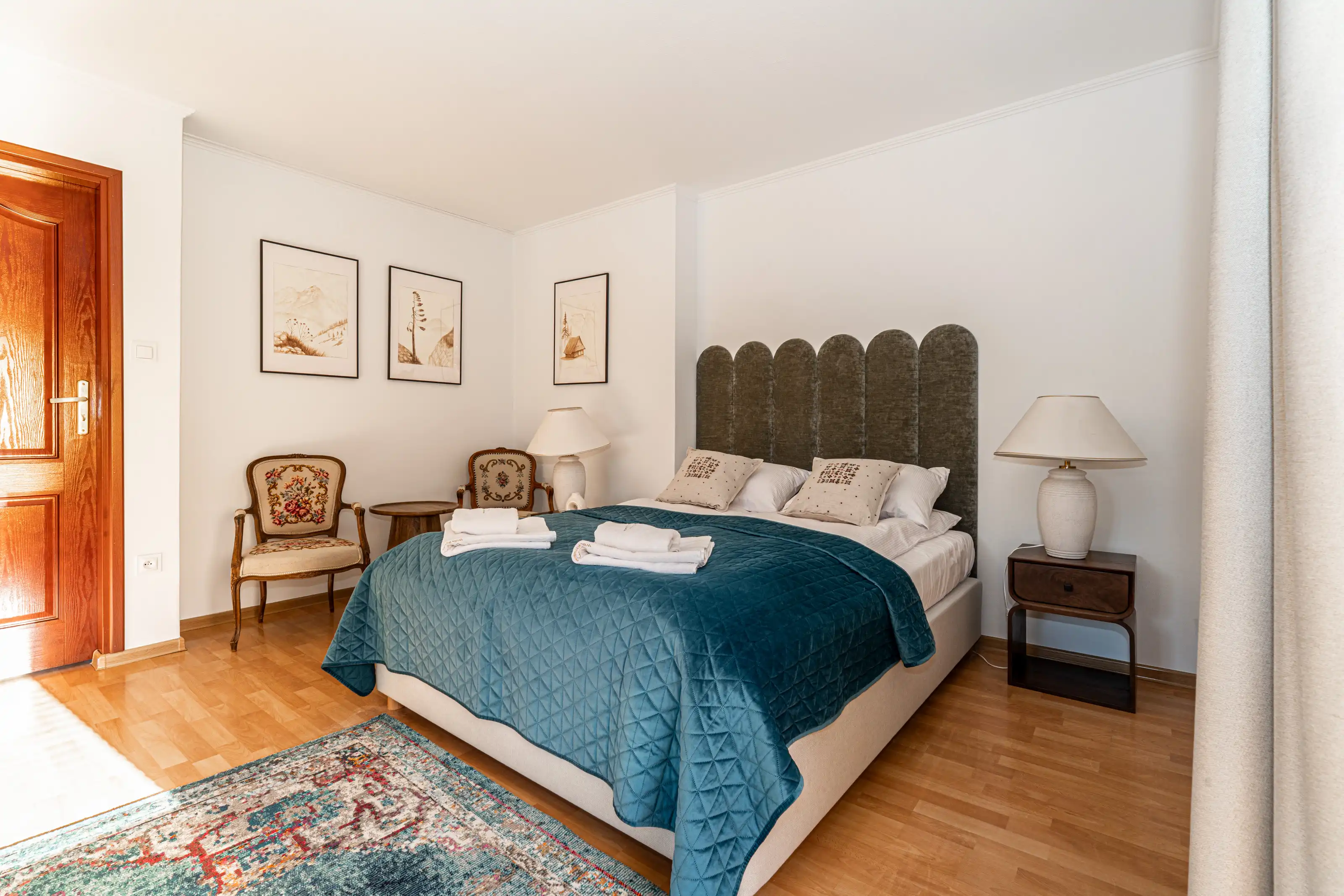 Sypialnia I: łoże małżeńskie, stoliki nocne z oświetleniem, szafy, dwa krzesła z stolikiem, toaletka, wyjście na balkon.