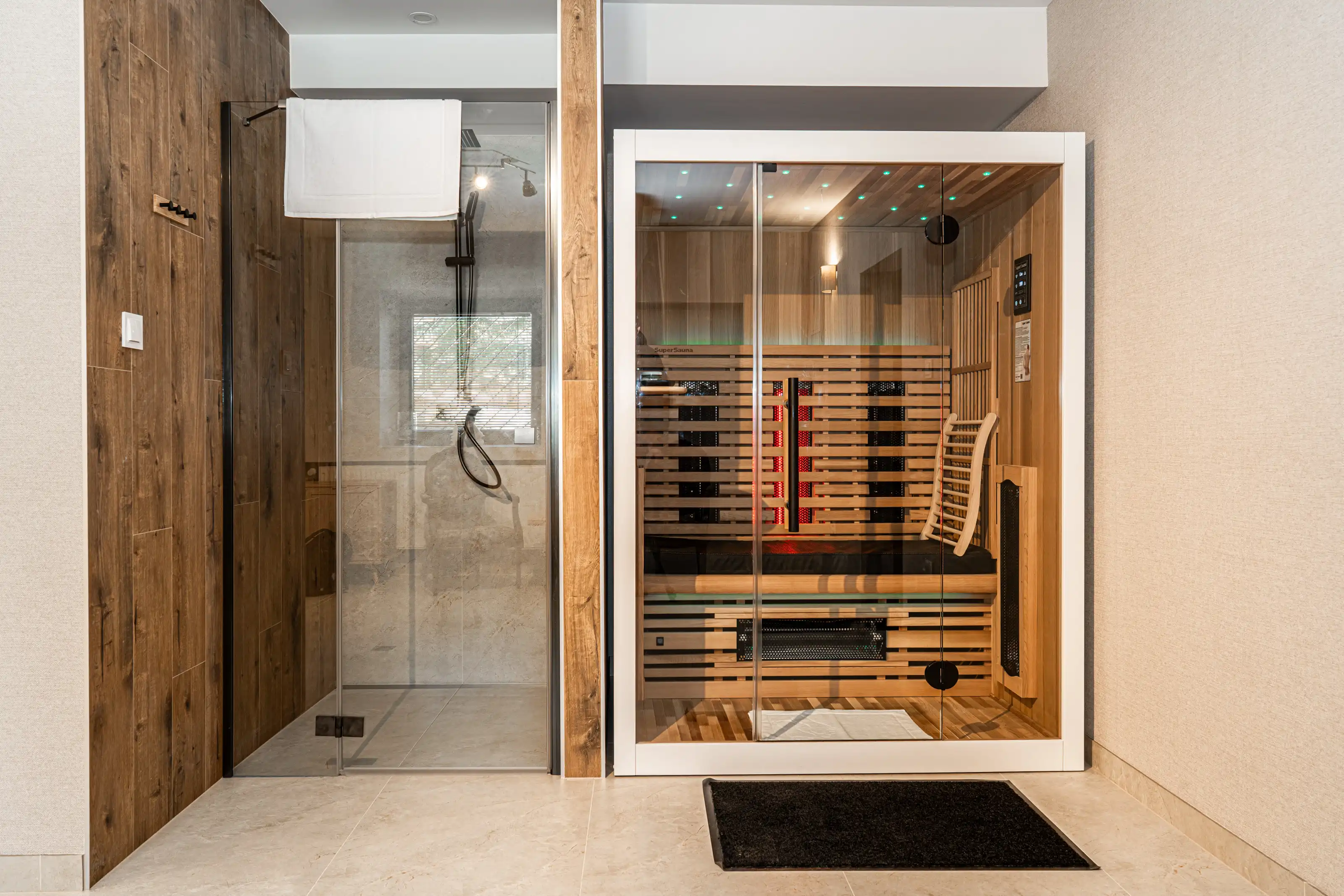 Sauna na podczerwień, TV, kabina prysznicowa.
