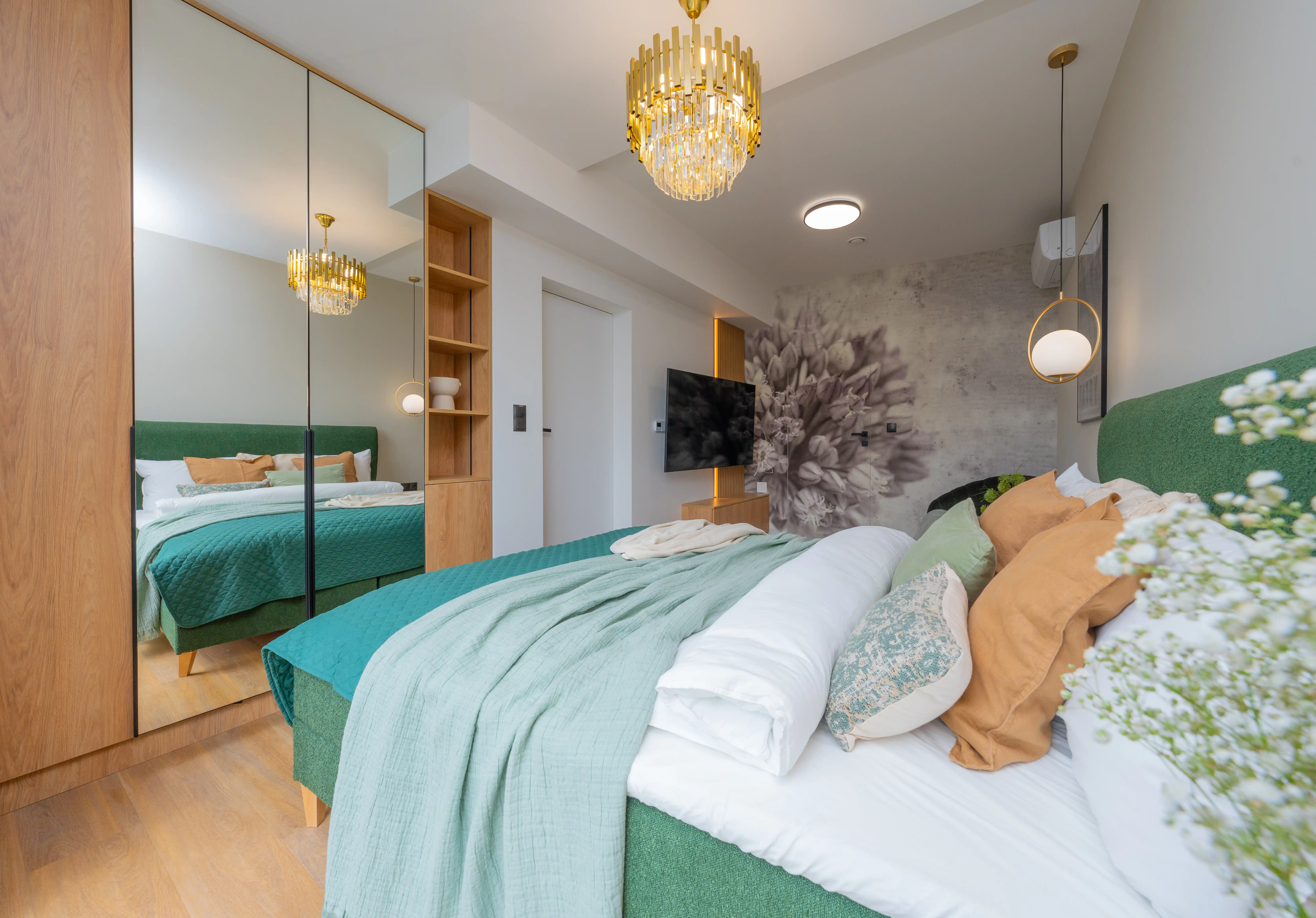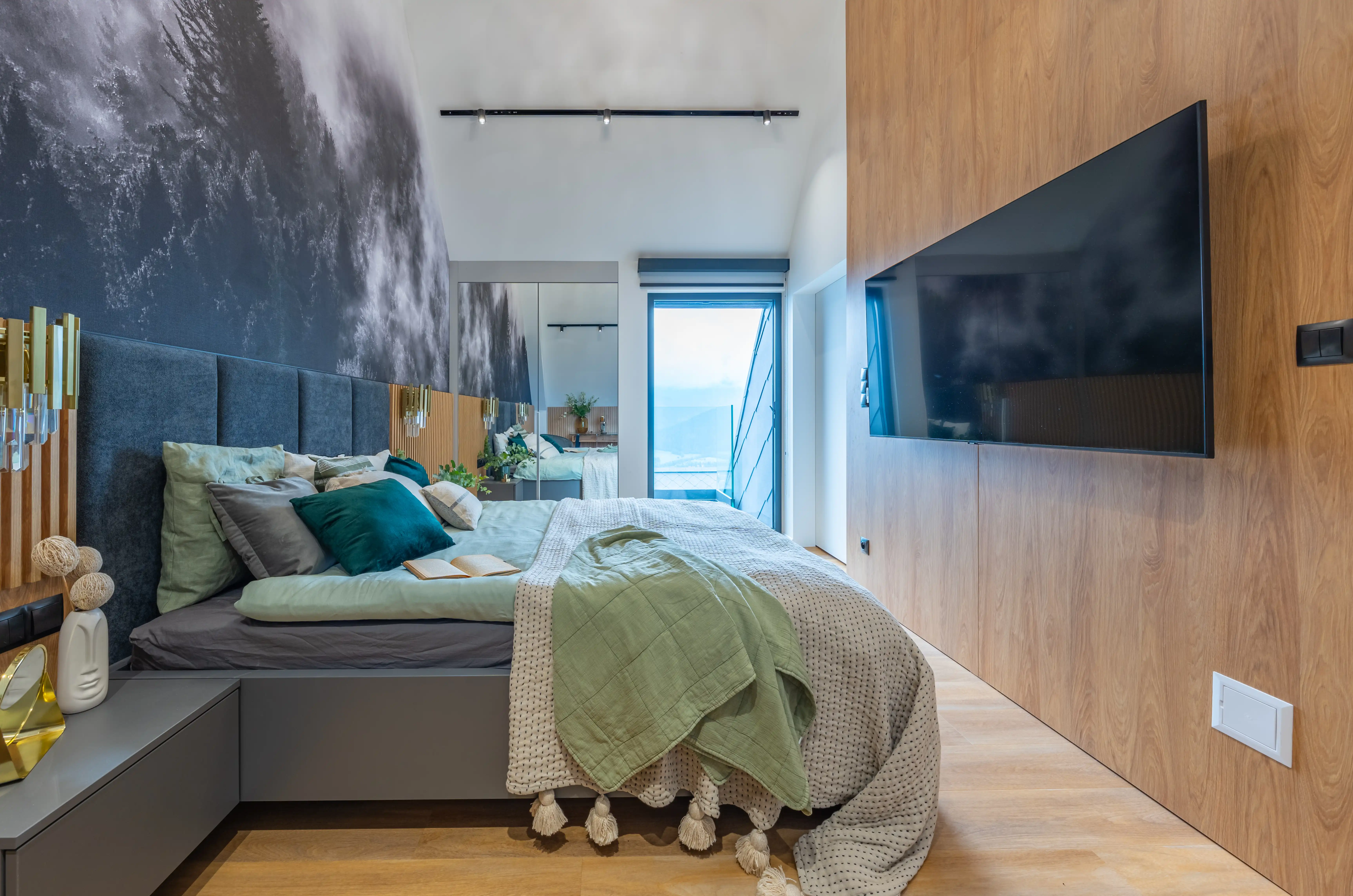 Sypialnia IV: łoże małżeńskie, dwa stoliki nocne z oświetleniem, biurko z krzesłem, pojemna szafa, TV, wyjście na balkon.