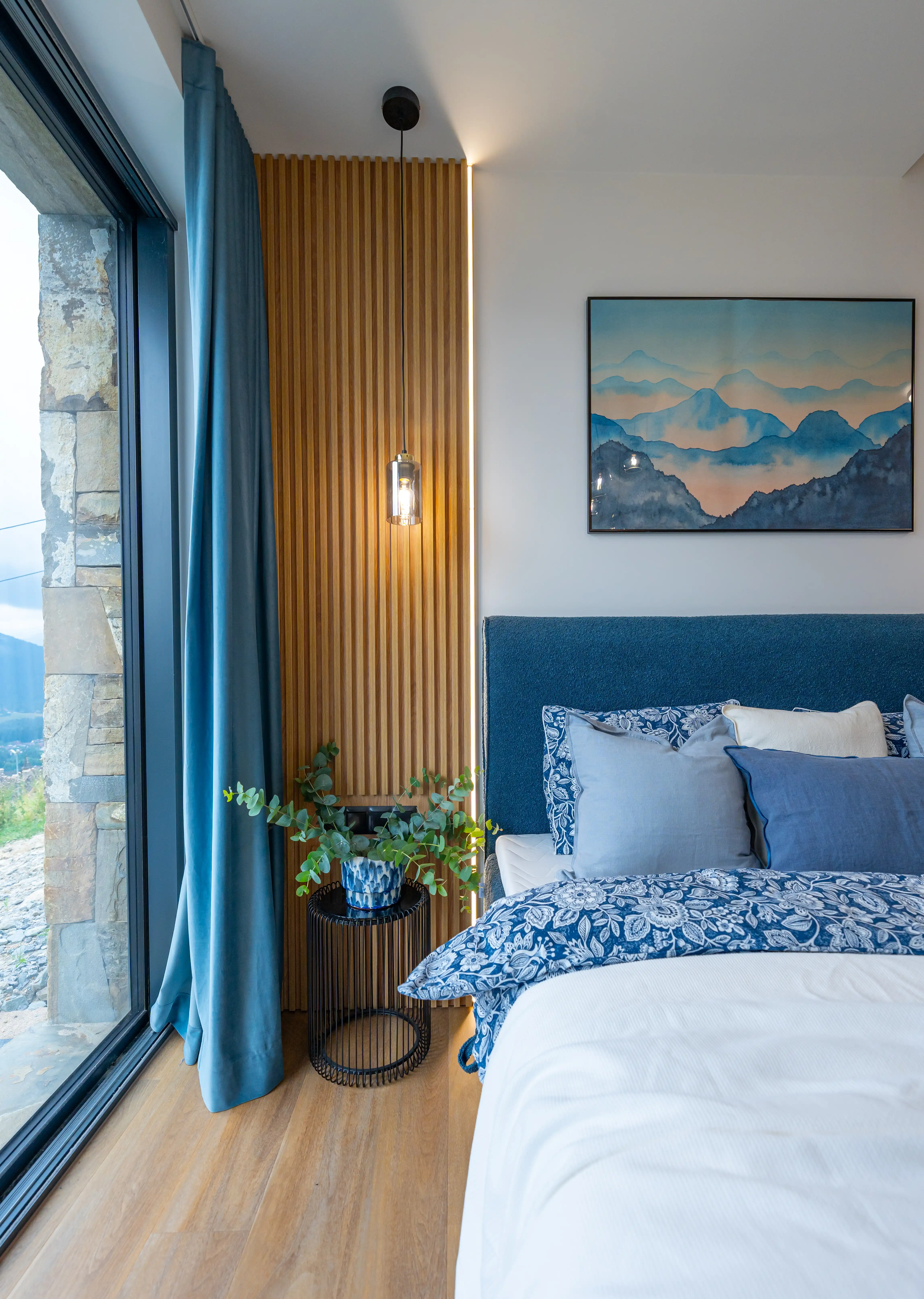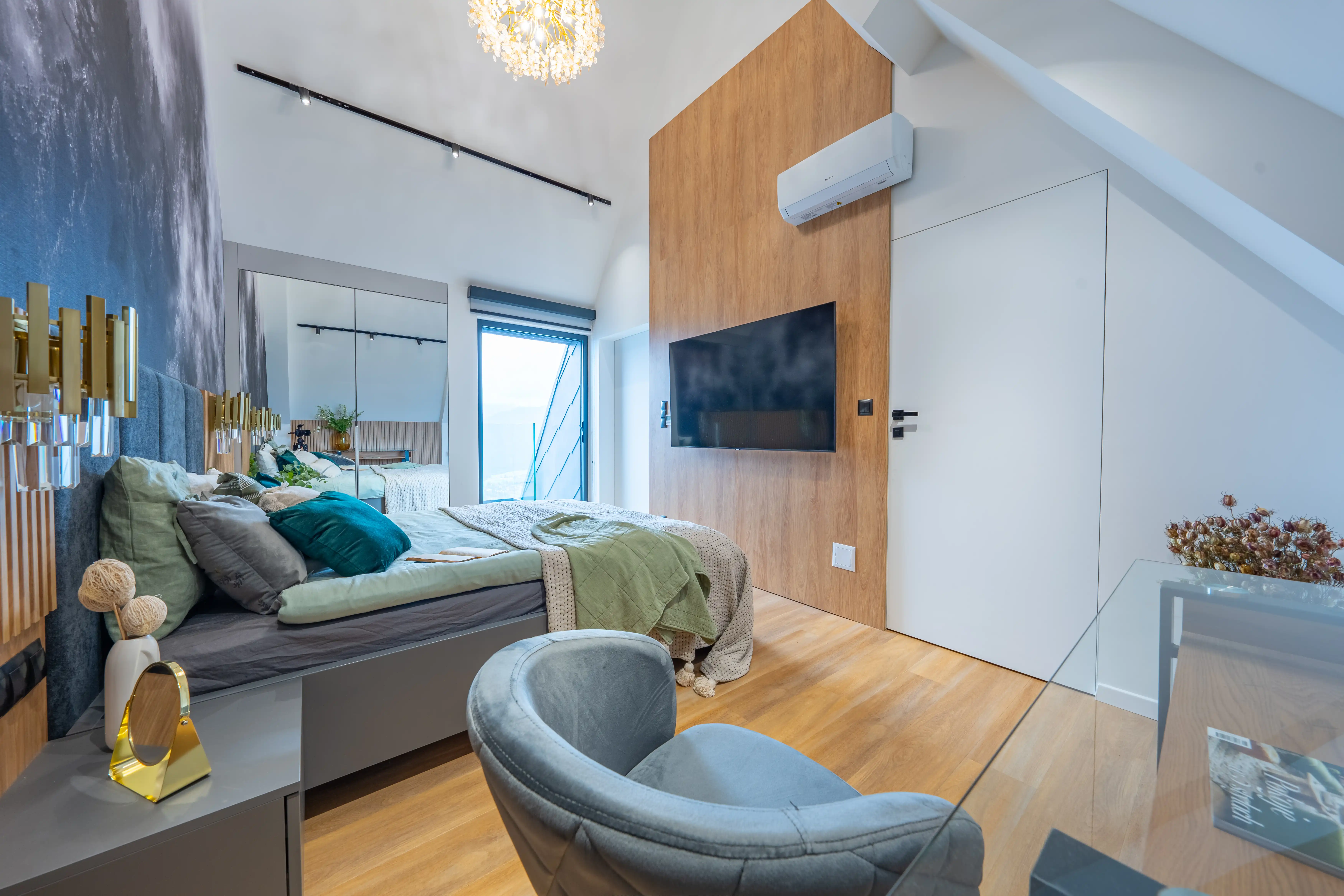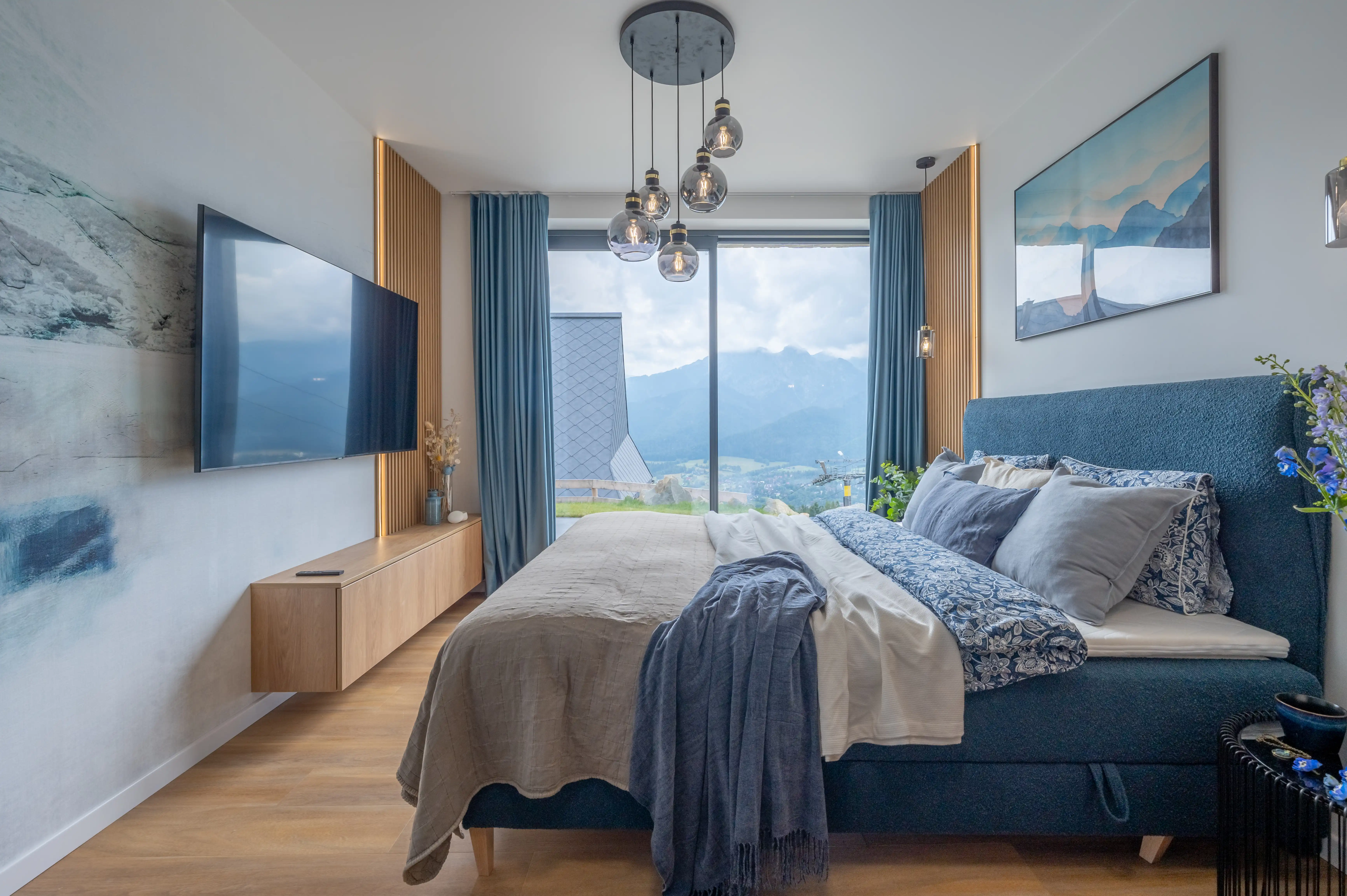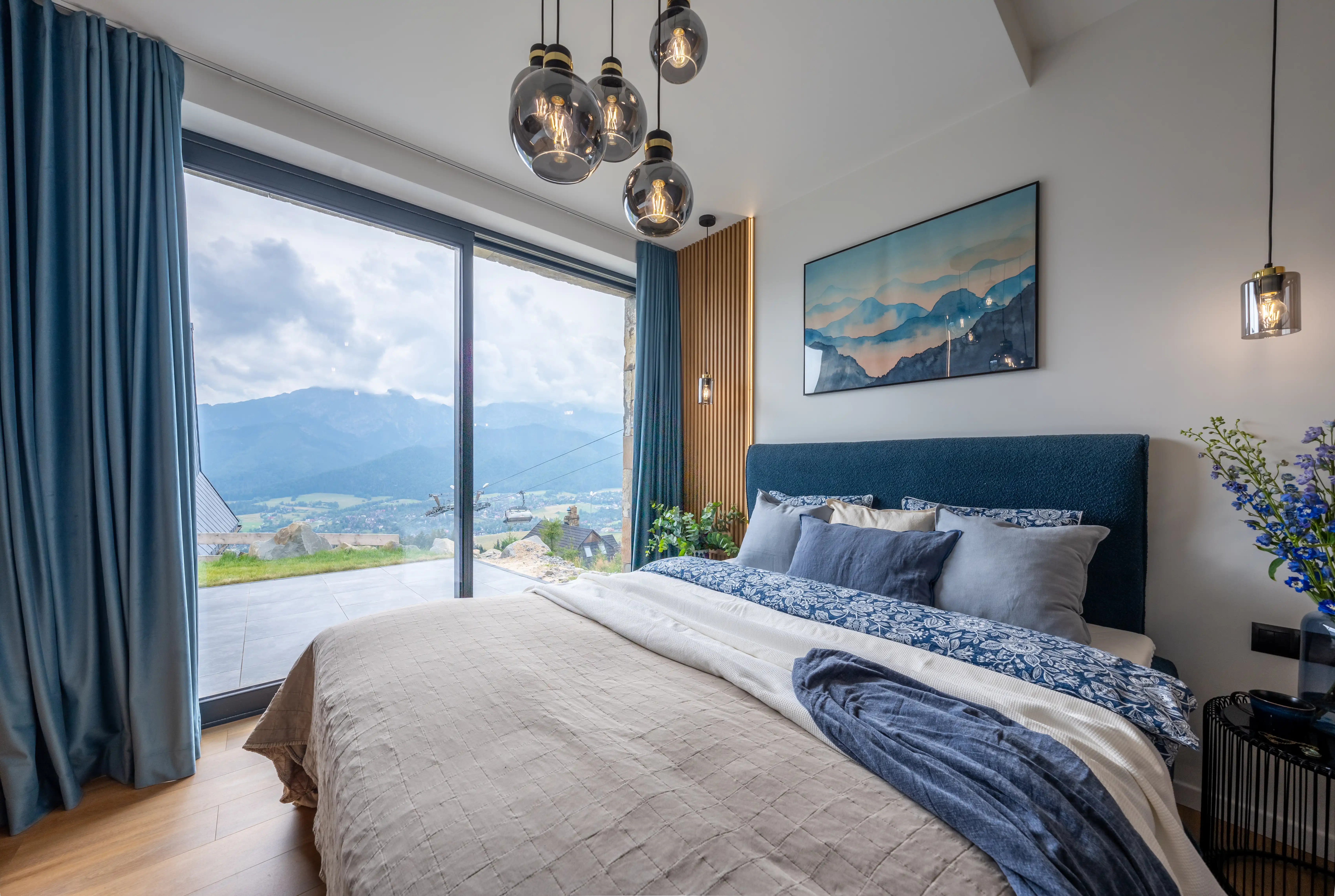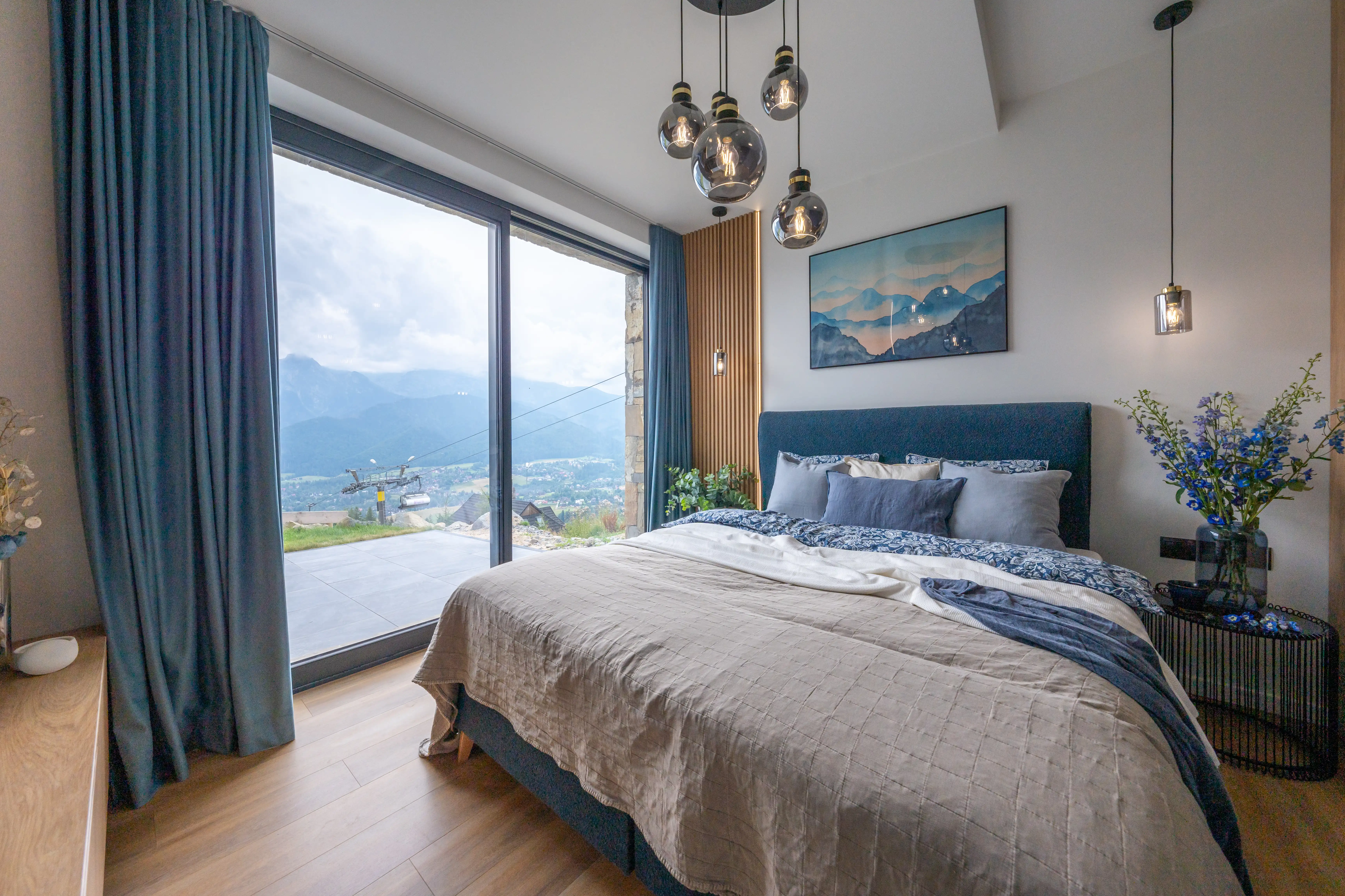 Trzy poziomowy dom składa się z kuchni z przestronną jadalnią z ogromnymi panoramicznymi oknami, z których rozpościera się niepowtarzalny widok na panoramę Tatr i kominkiem oraz 5 sypialni - każda z prywatną łazienką i Smart TV. Każda z pięciu sypialni zapewnia komfort, prywatność i wyjątkowy widok.