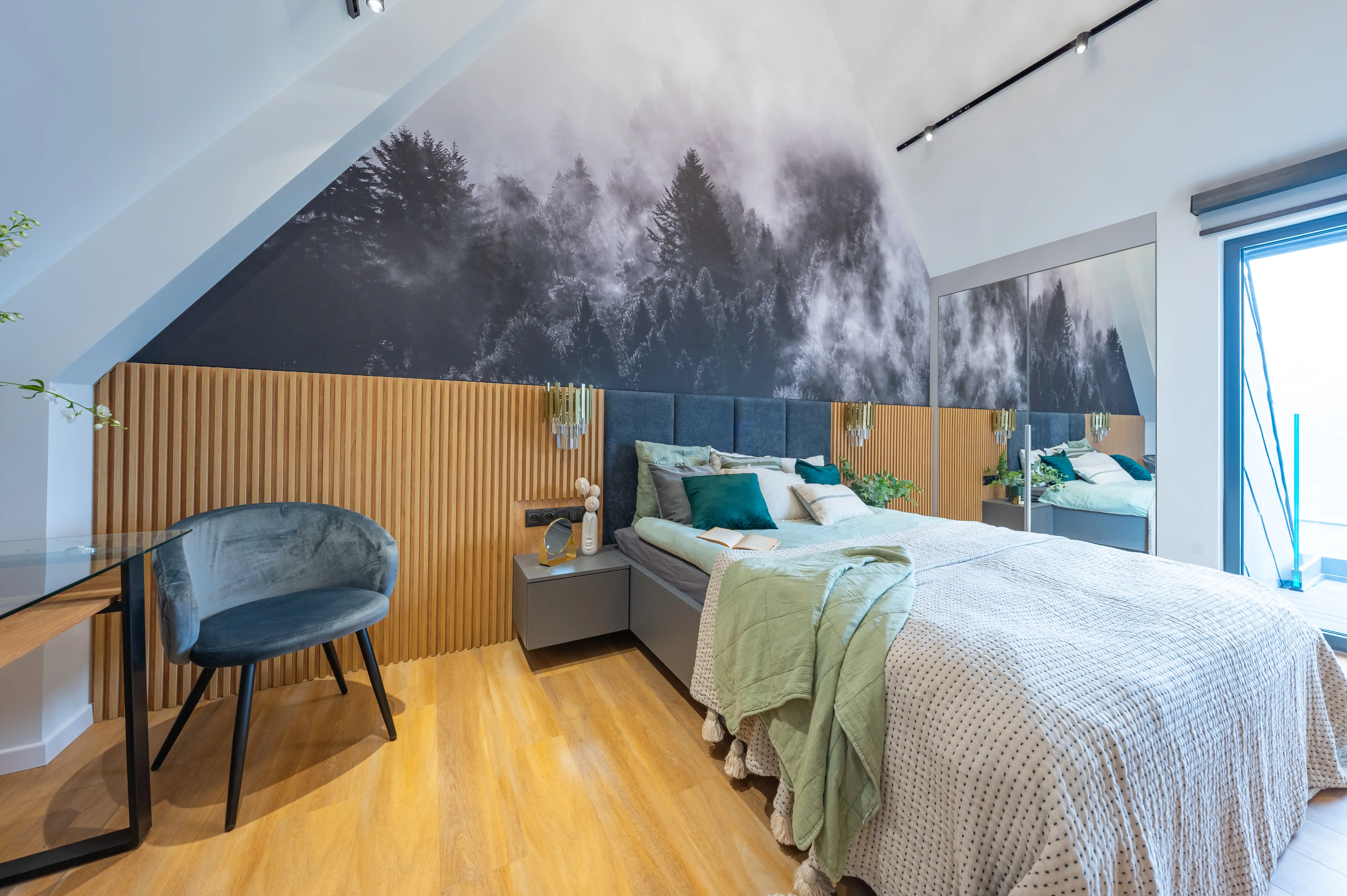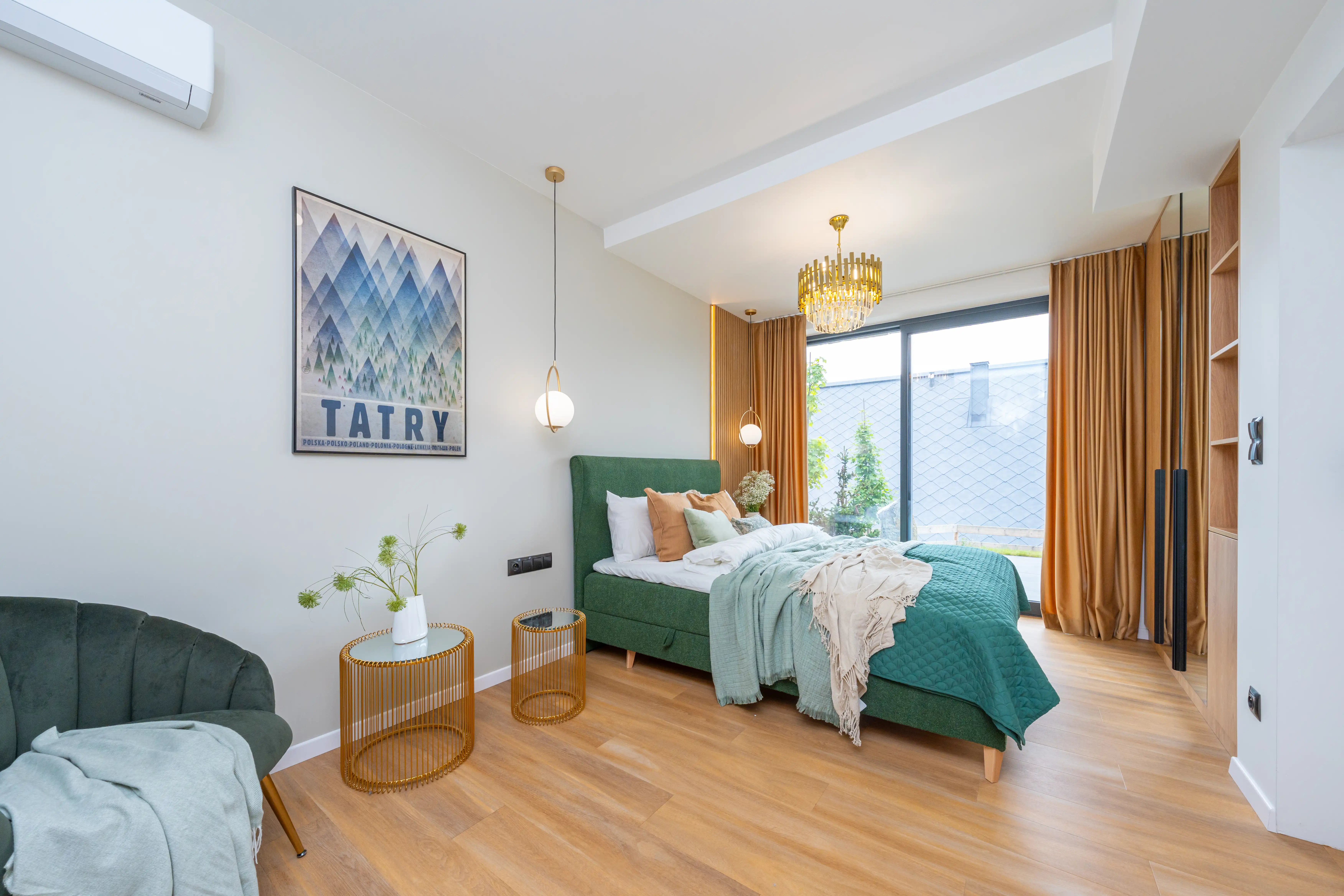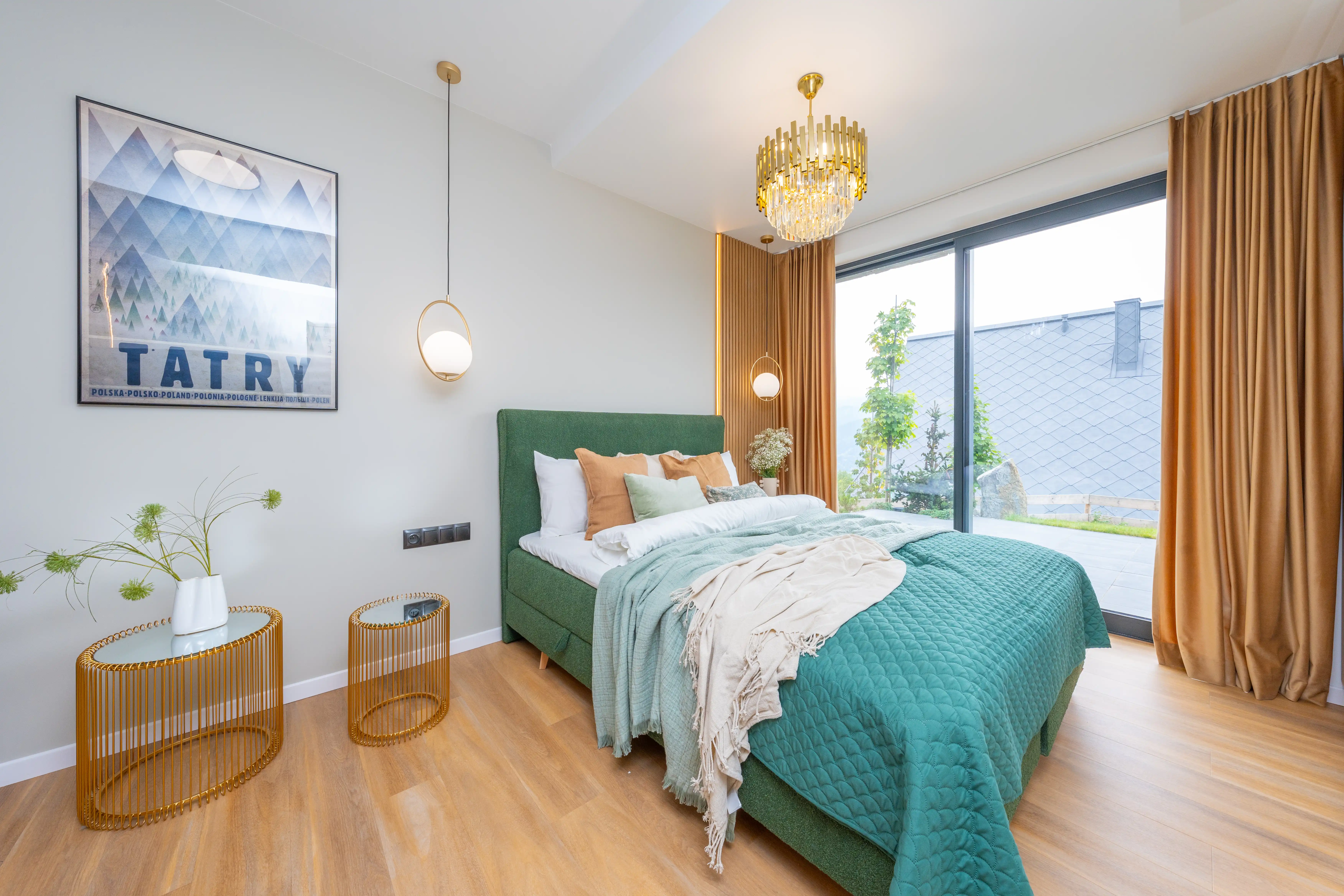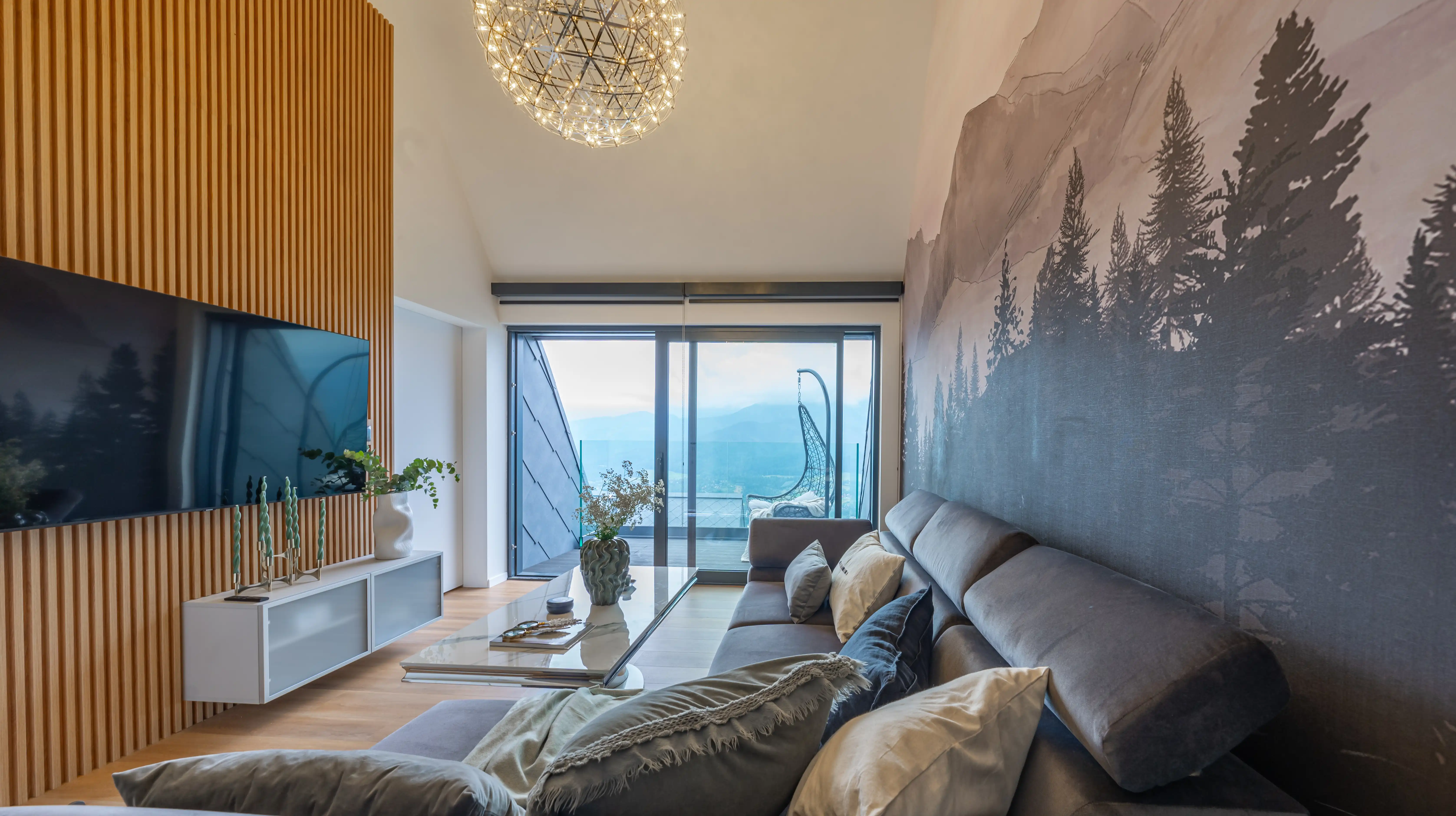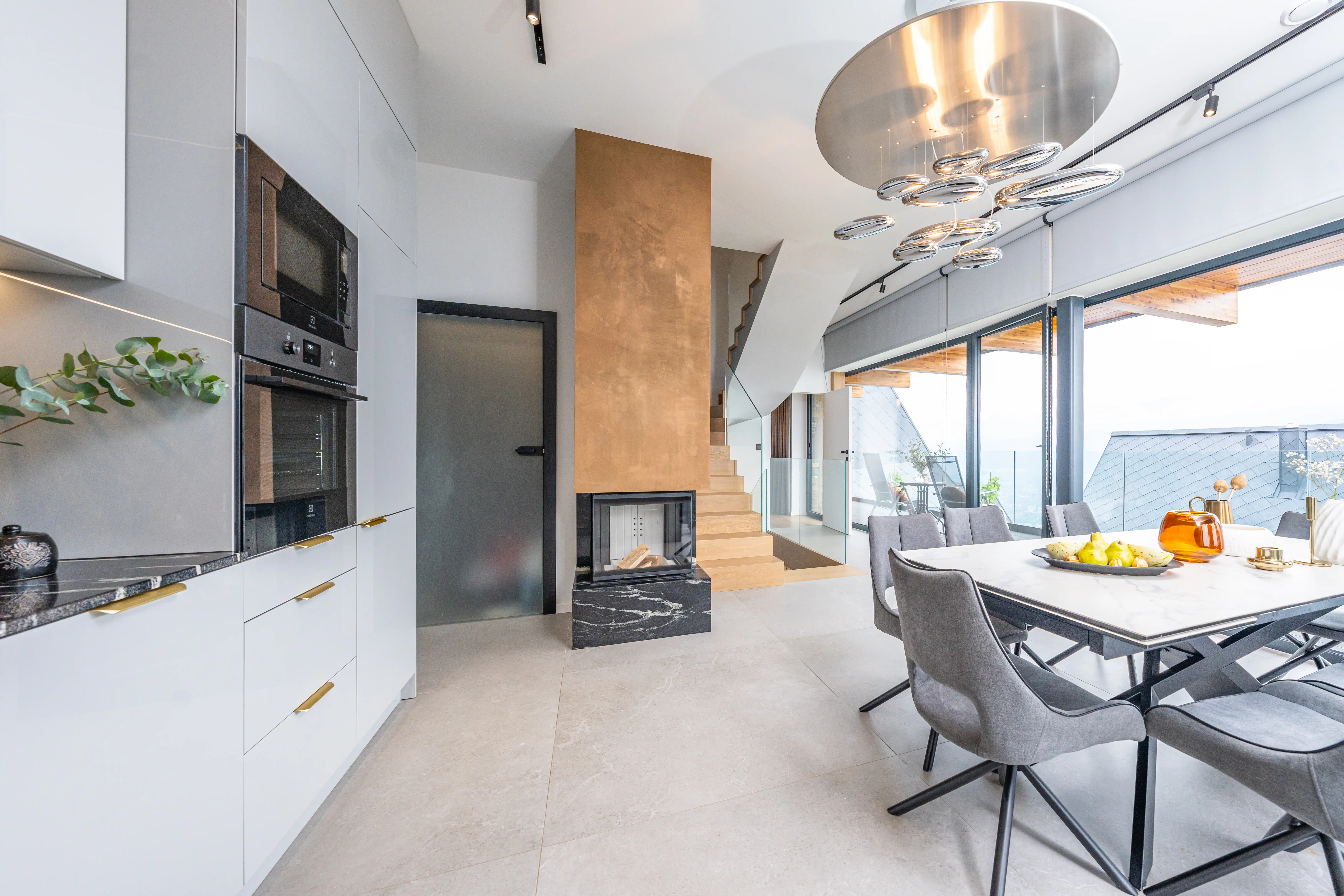 Trzy poziomowy dom składa się z kuchni z przestronną jadalnią z ogromnymi panoramicznymi oknami, z których rozpościera się niepowtarzalny widok na panoramę Tatr i kominkiem oraz 5 sypialni - każda z prywatną łazienką i Smart TV. Każda z pięciu sypialni zapewnia komfort, prywatność i wyjątkowy widok.