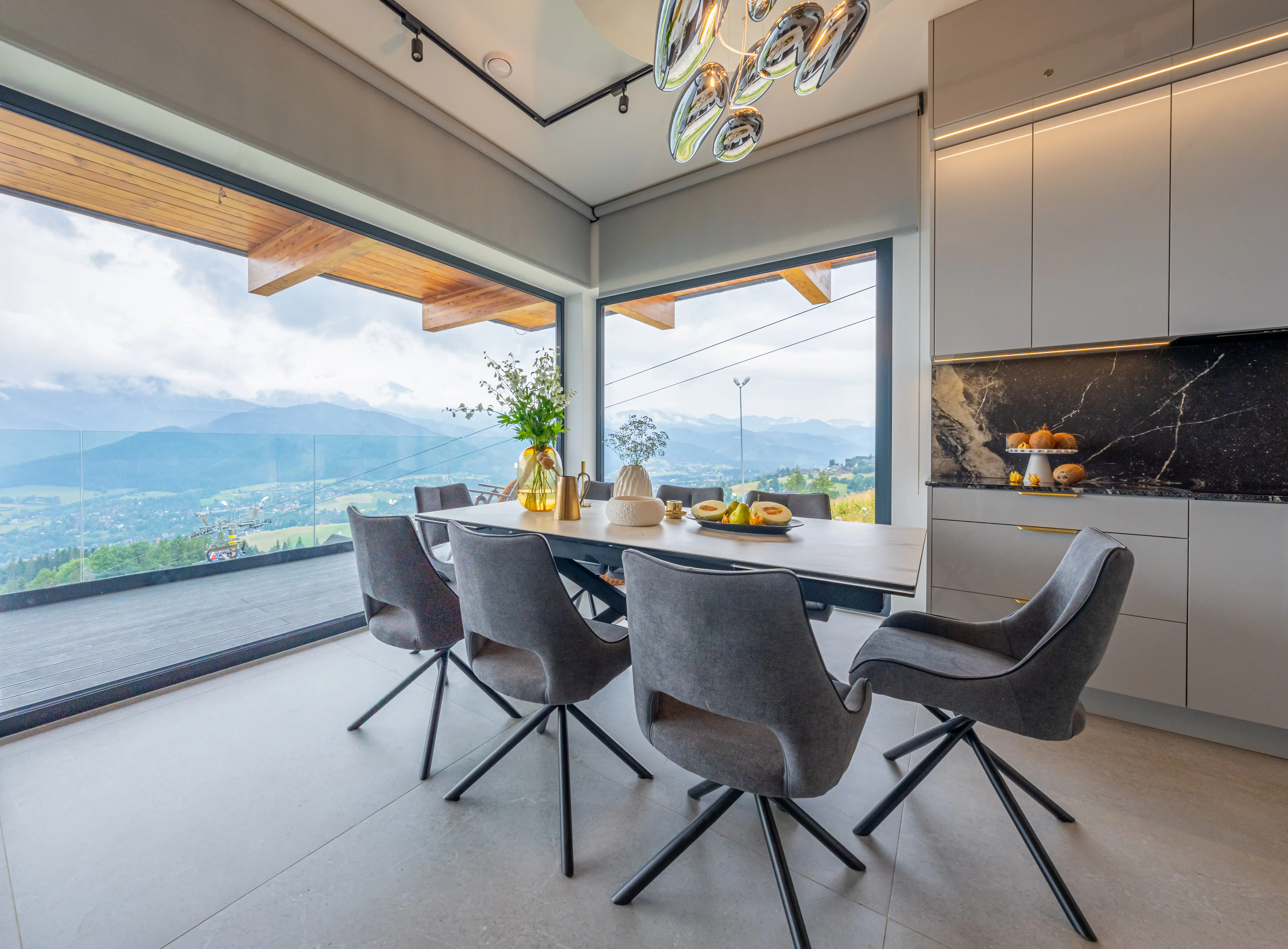 Jadalnia: duży stół jadalniany, 8 krzeseł, wyjście na taras z pięknymi widokami na całą panoramę tatr.