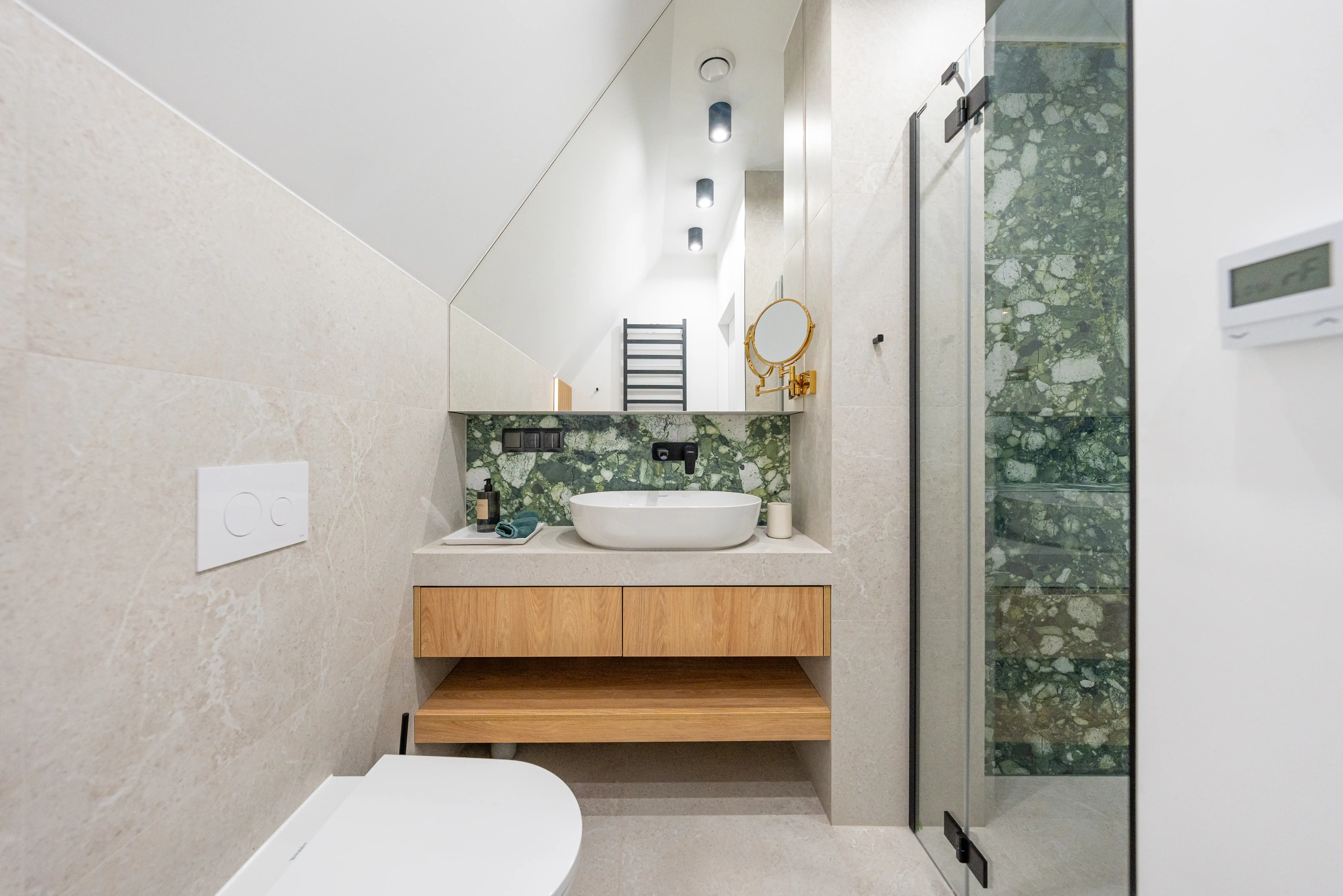 Łazienka V: kabina prysznicowa, WC, umywalka, szafka na kosmetyki, lustro, grzejnik ręcznikowiec, suszarka do włosów.