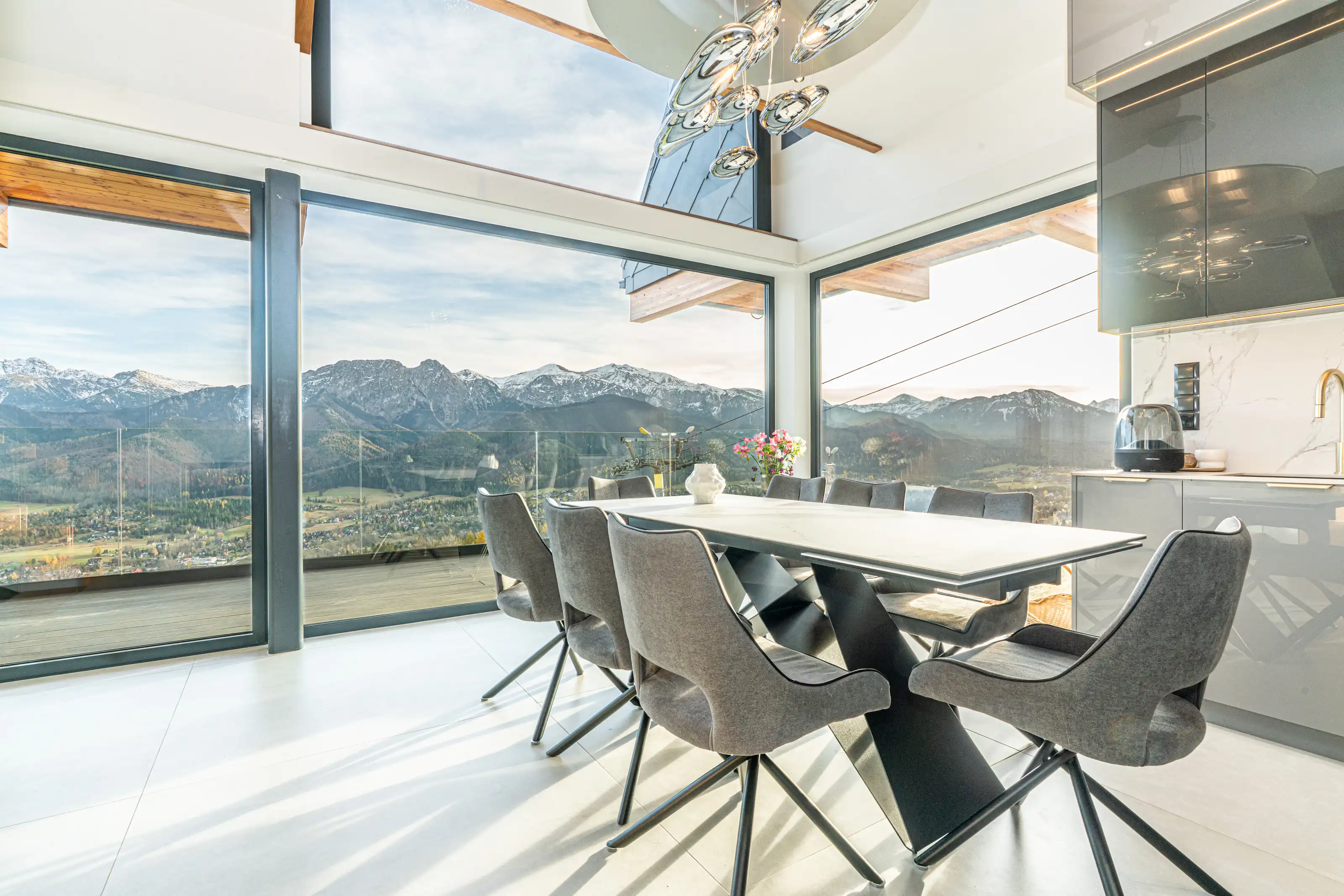 Jadalnia: duży stół jadalniany, 8 krzeseł, wyjście na taras z pięknymi widokami na całą panoramę tatr.