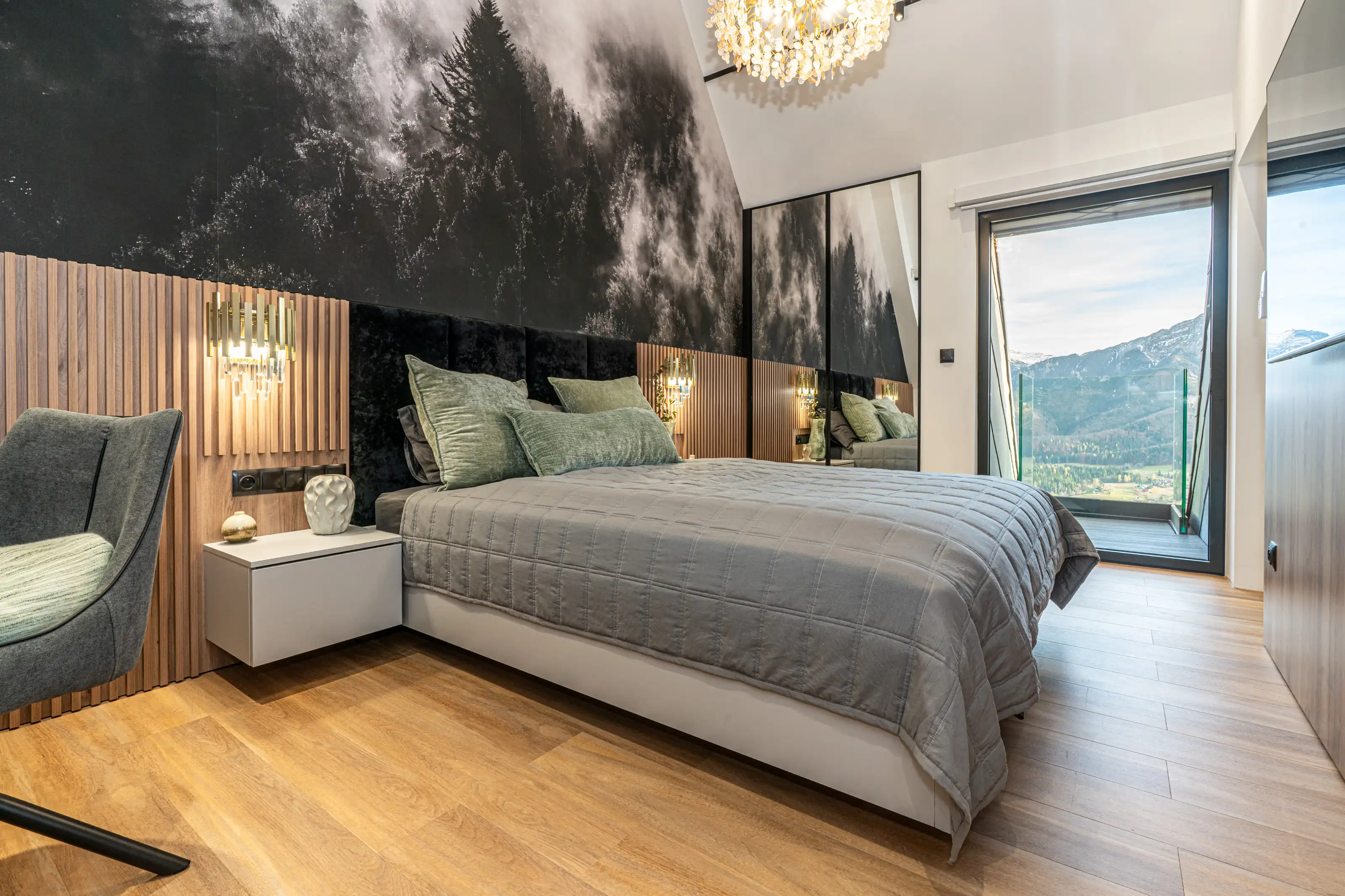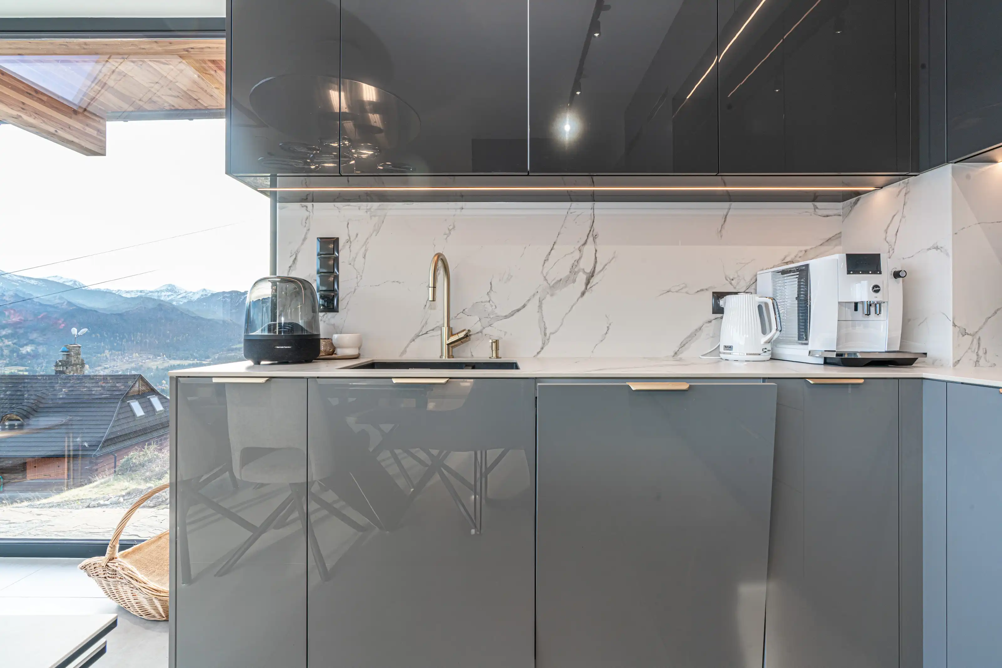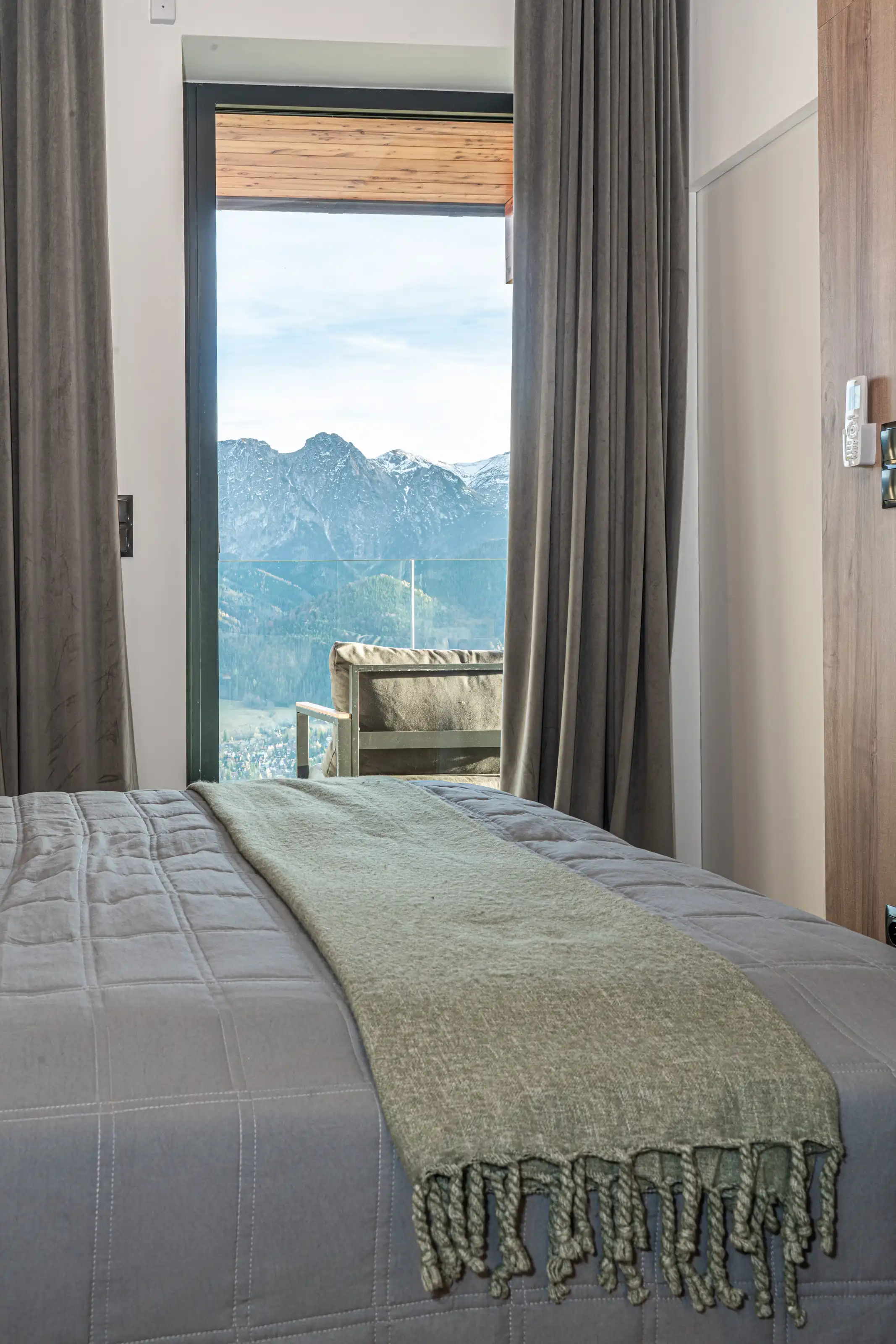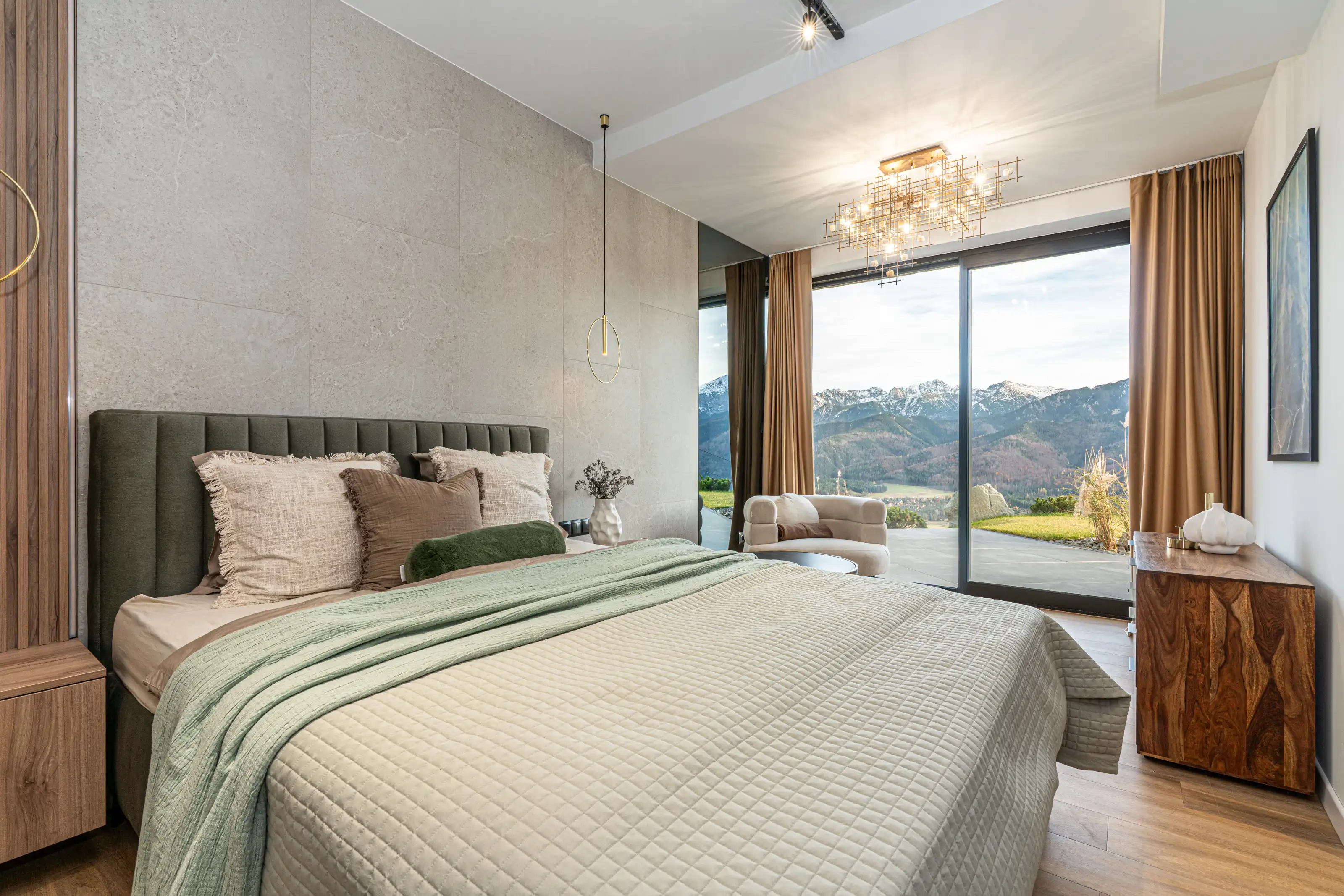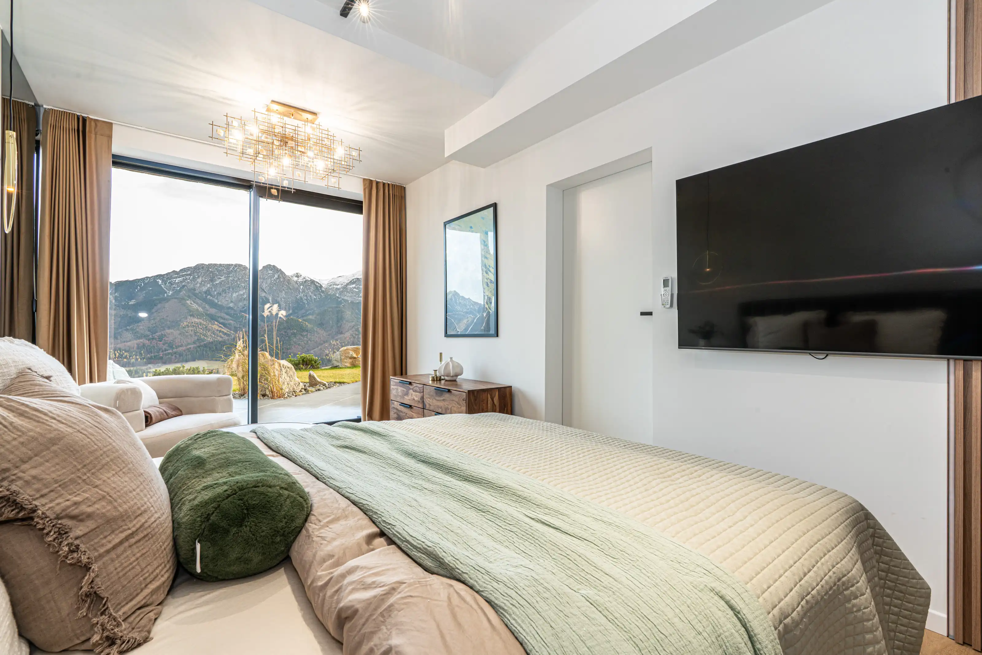 Trzy poziomowy dom składa się z kuchni z przestronną jadalnią z ogromnymi panoramicznymi oknami, z których rozpościera się niepowtarzalny widok na panoramę Tatr i kominkiem, 4 sypialni - każda z prywatną łazienką i Smart TV oraz salon z rozkładanym narożnikiem. Każda z 4 sypialni sypialni zapewnia komfort, prywatność i wyjątkowy widok.
