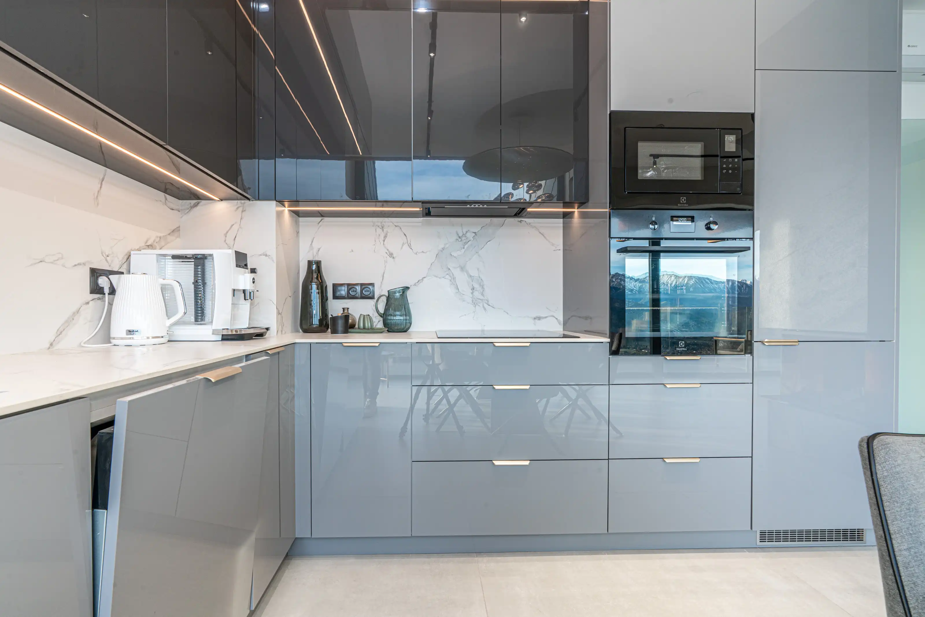 Kuchnia: zabudowa kuchenna, lodówka, piekarnik, płyta indukcyjna, mikrofalówka, czajnik bezprzewodowy, ekspres do kawy, zmywarka, zlewozmywak, komplet garnków i akcesoriów kuchennych, zastawa stołowa dla 10 osób.