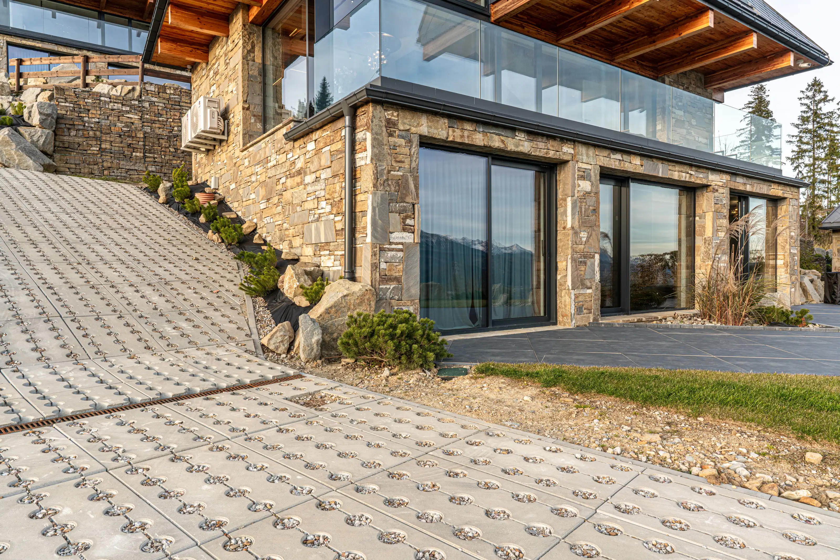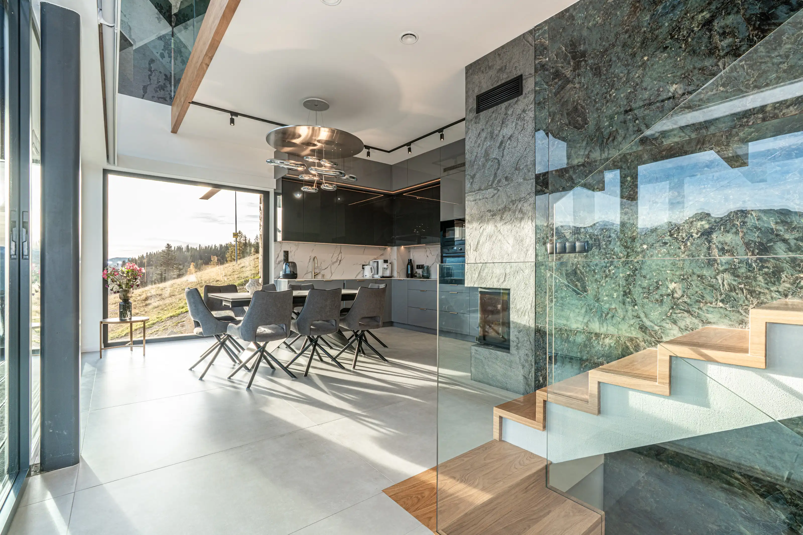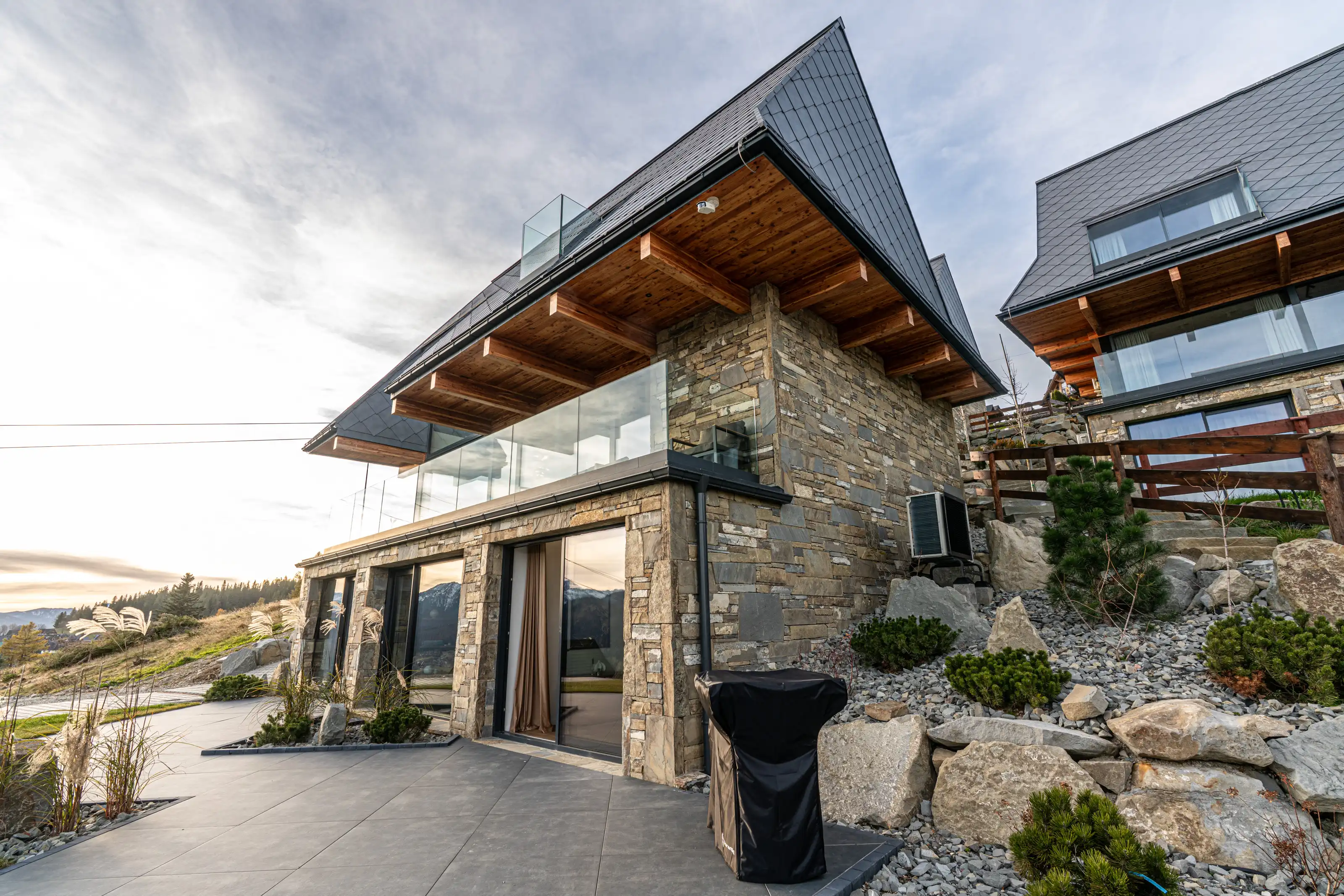 Szymoszkowa Ski Residence to nowy, luksusowy dom wykonany w najwyższym standardzie, wyposażony w nowoczesne systemy, takie jak klimatyzacja i elektryczne rolety, z ogromnymi przeszkleniami podkreślającymi widok o każdej porze dnia.