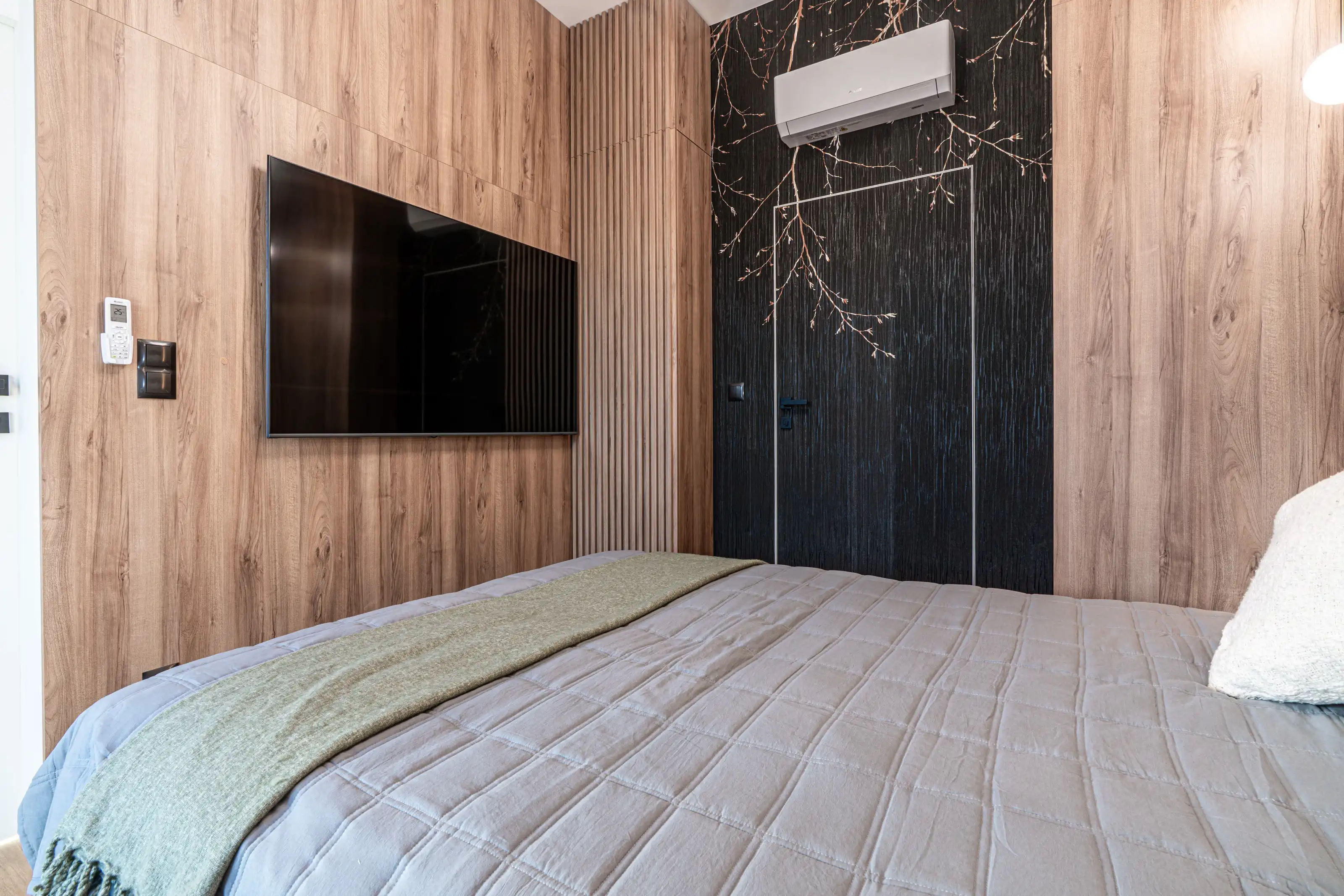 Sypialnia IV: łoże małżeńskie, dwa stoliki nocne z oświetleniem, biurko z krzesłem, pojemna szafa, TV, wyjście na balkon.