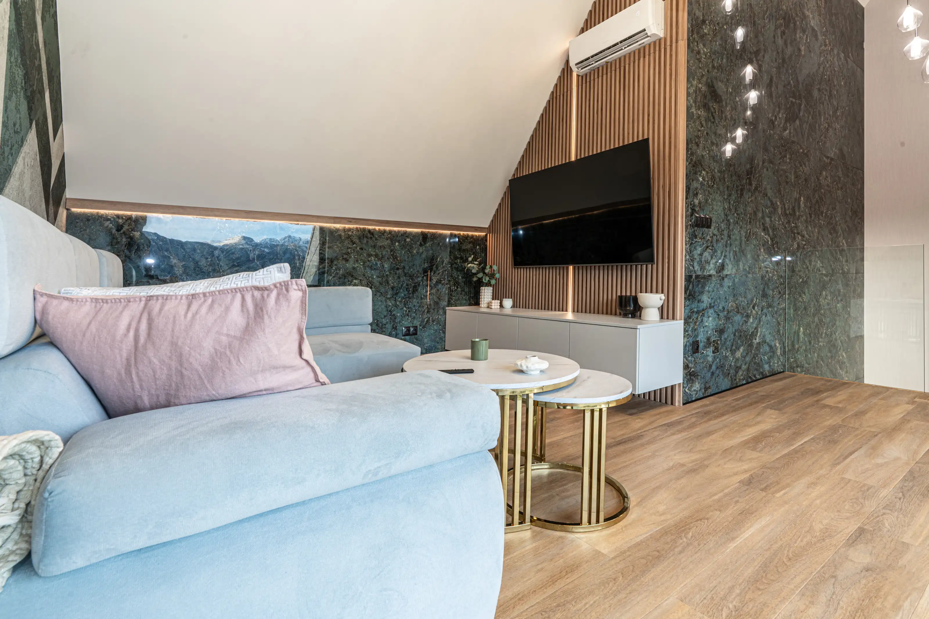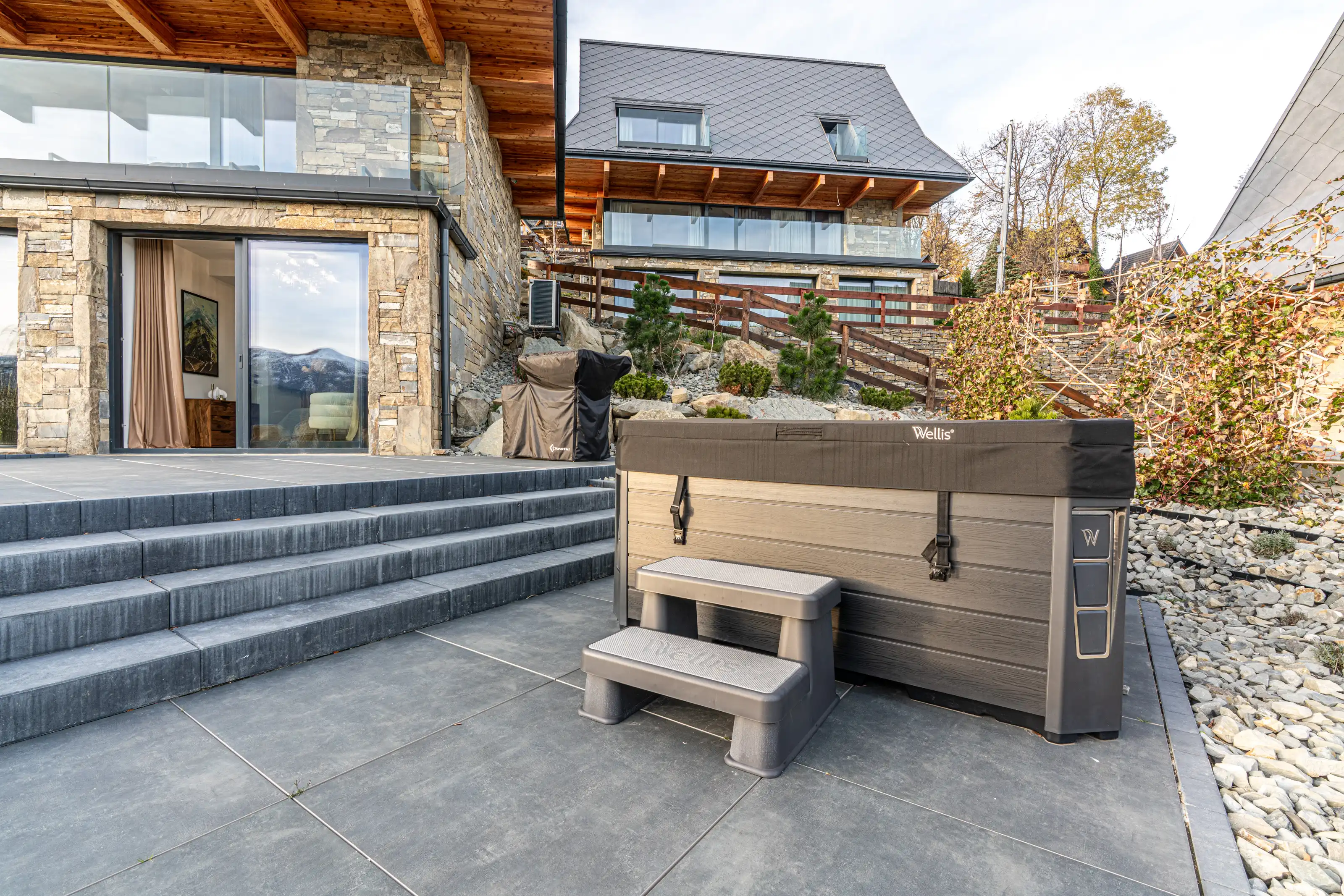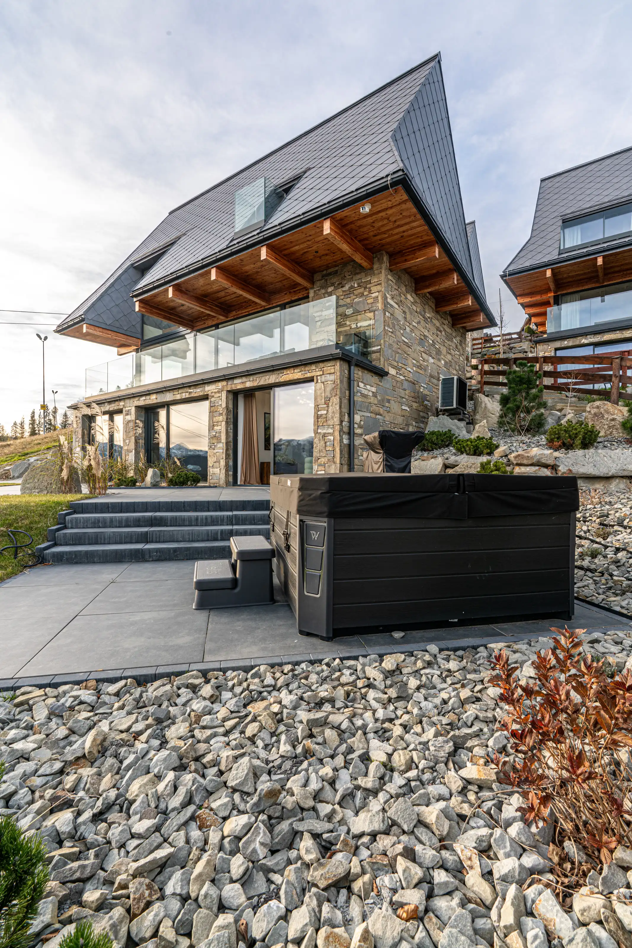 Wyjątkową atrakcją obiektu jest prywatne zewnętrzne jacuzzi oraz sauna z panoramicznym widokiem na Tatry - idealne na wieczorny relaks, regenerację po nartach lub romantyczne chwile.