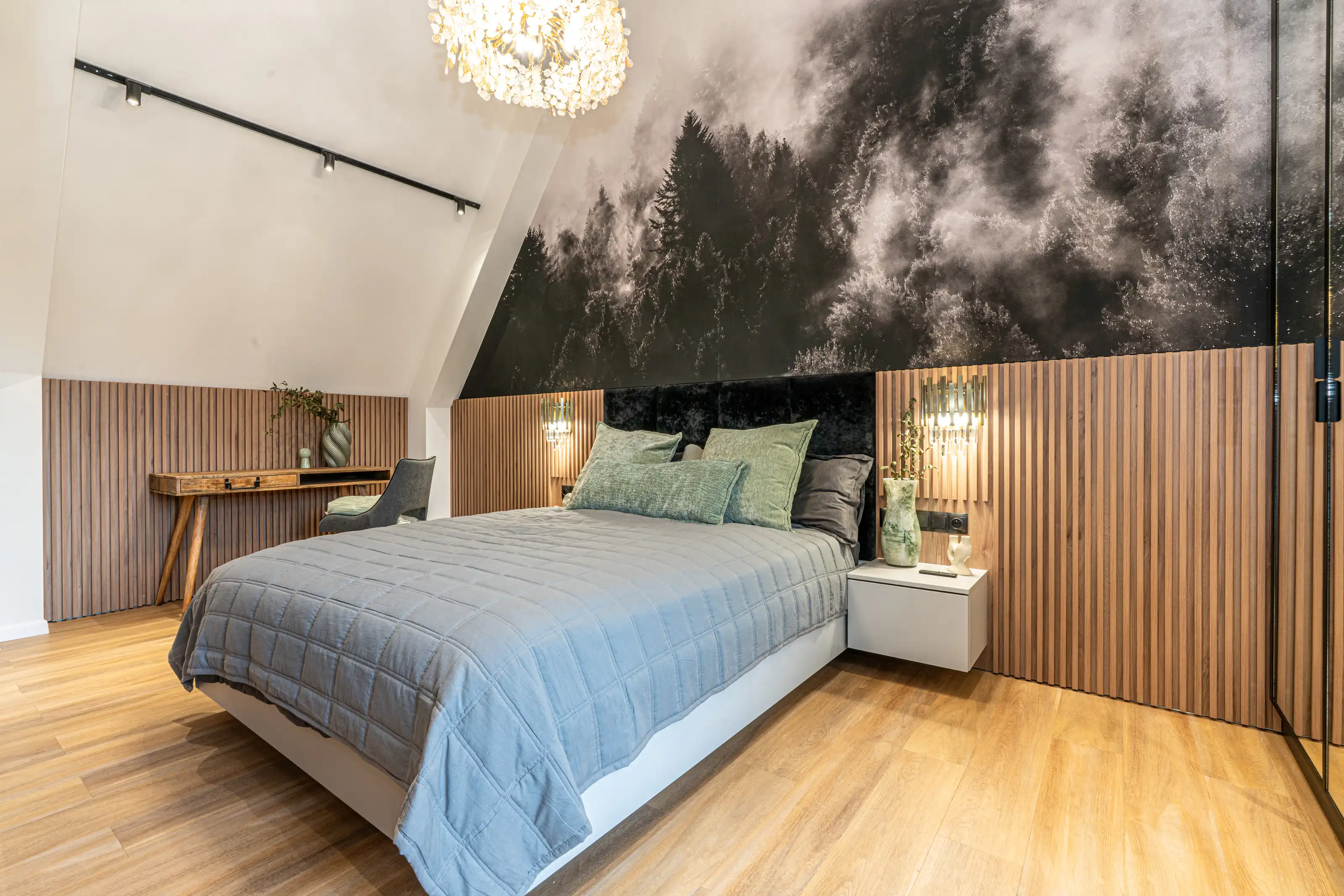 Sypialnia: łoże małżeńskie, dwa stoliki nocne wraz z oświetleniem.