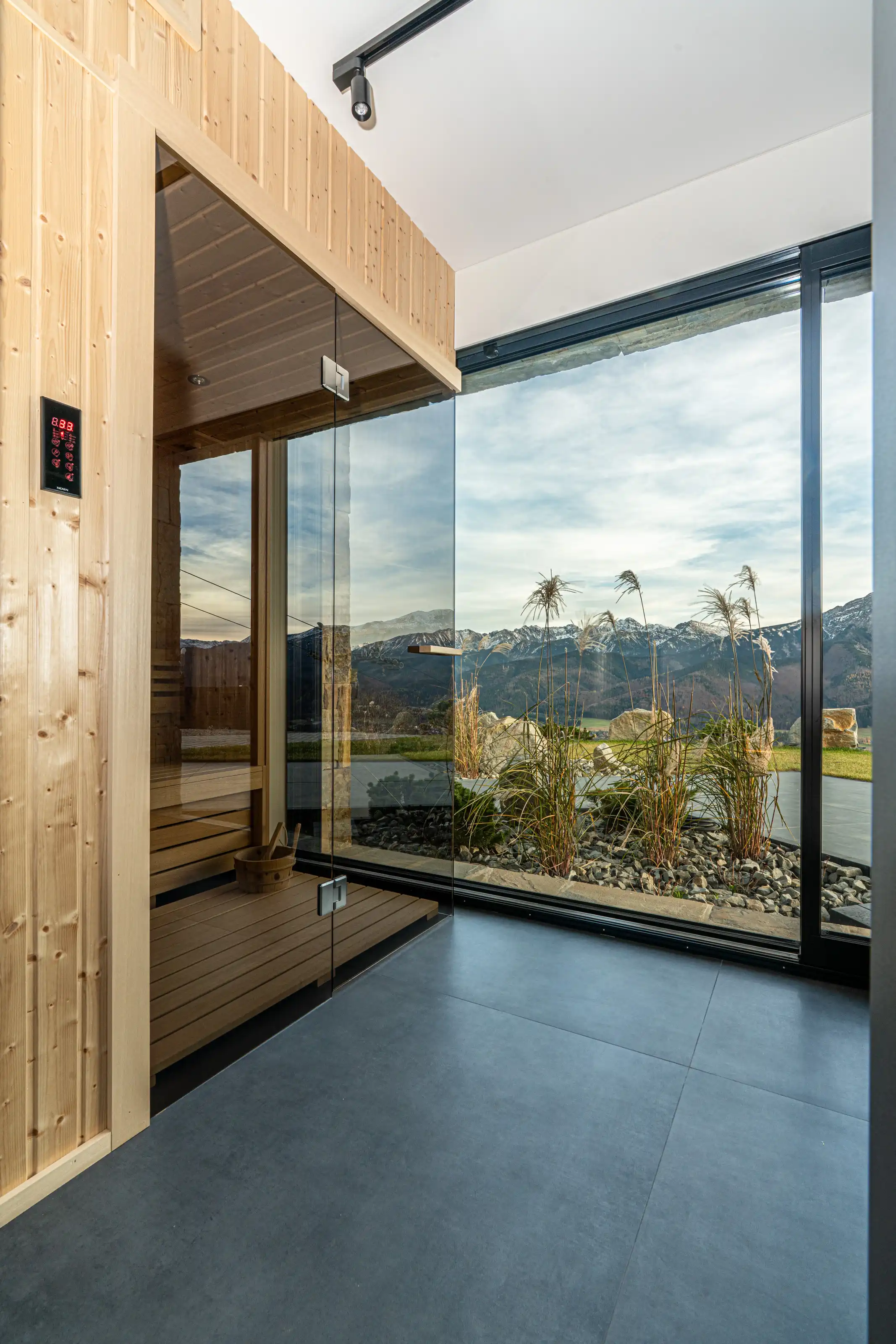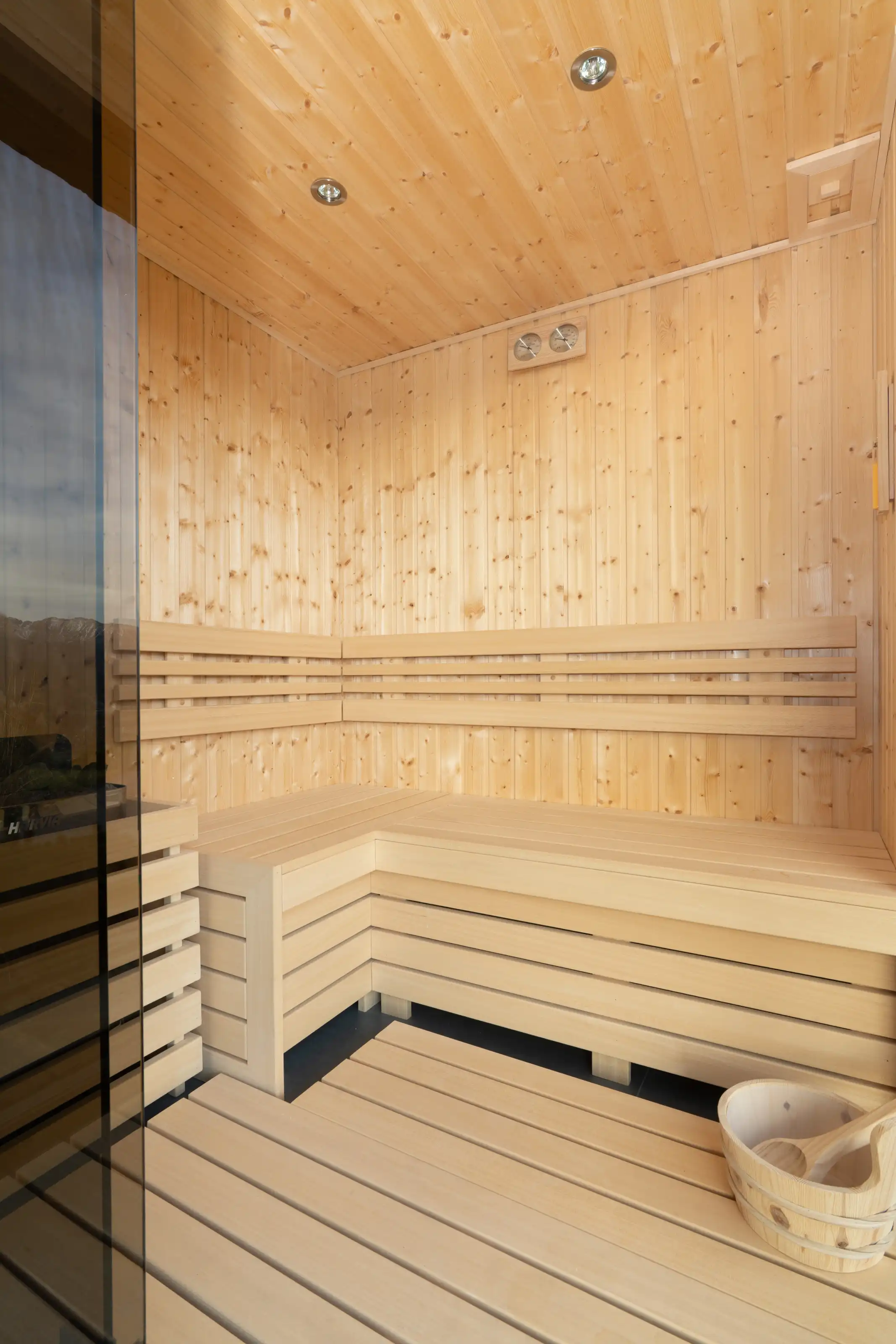 Strefa relaksu: wewnętrzna sauna oraz zewnętrzne jacuzzi.