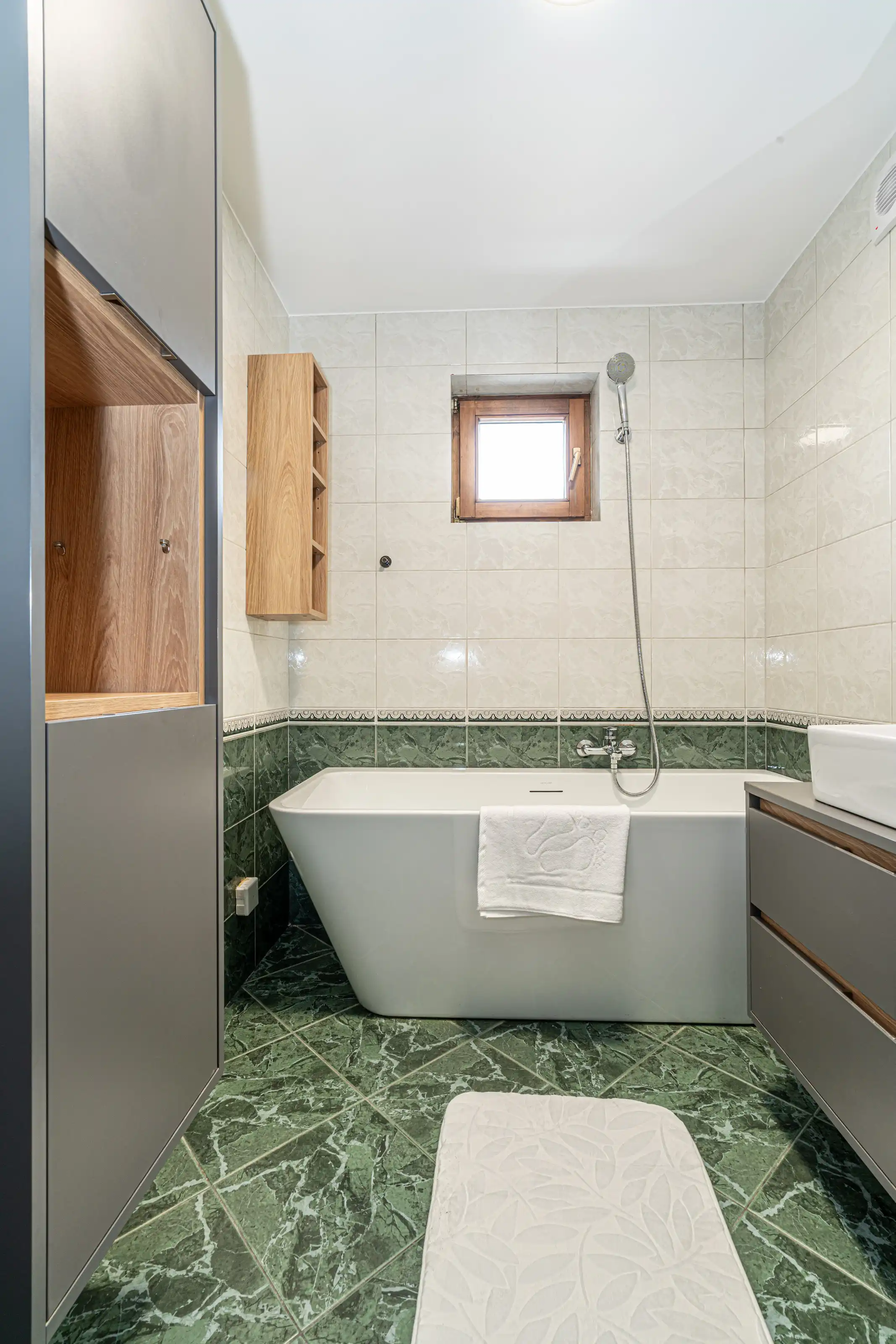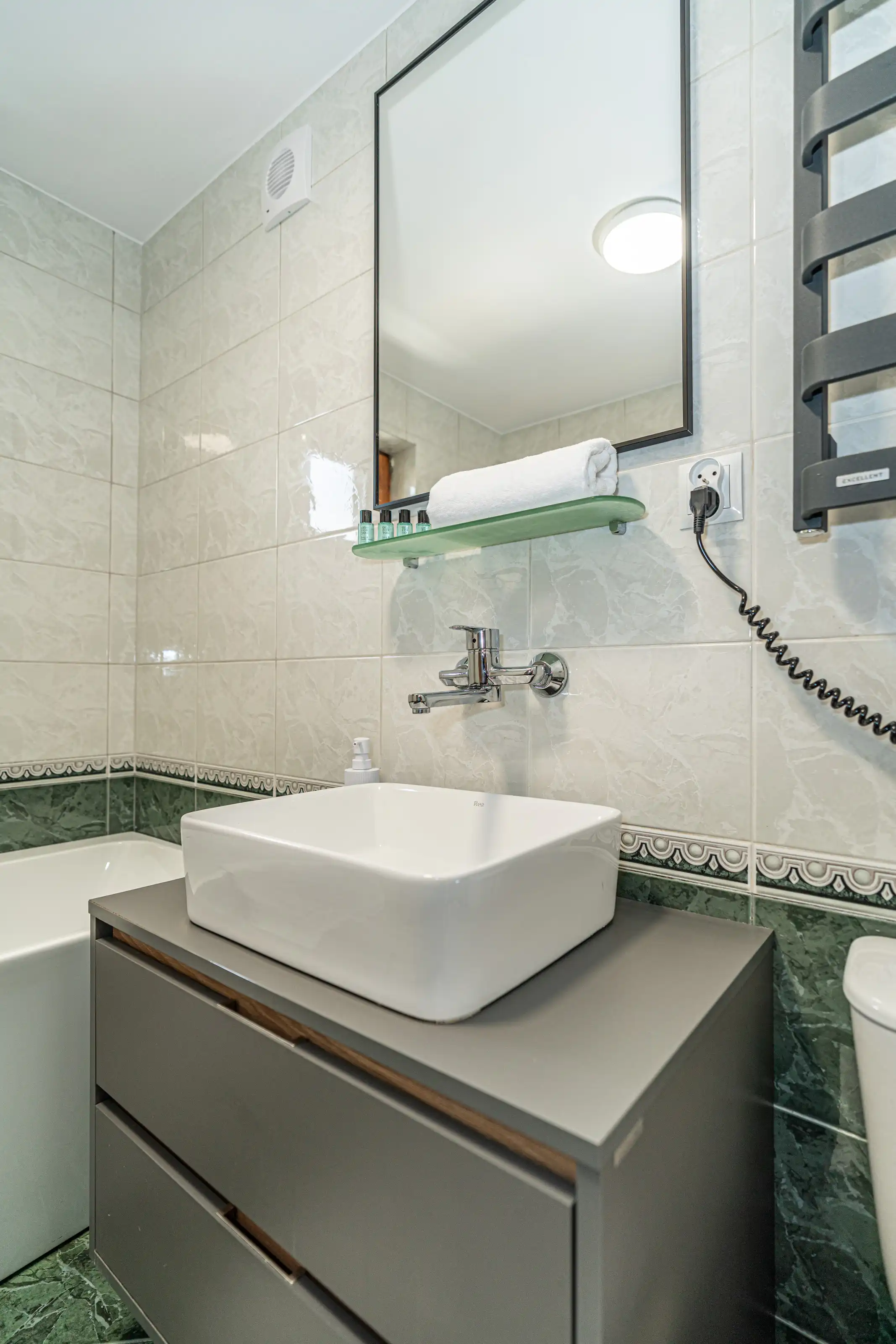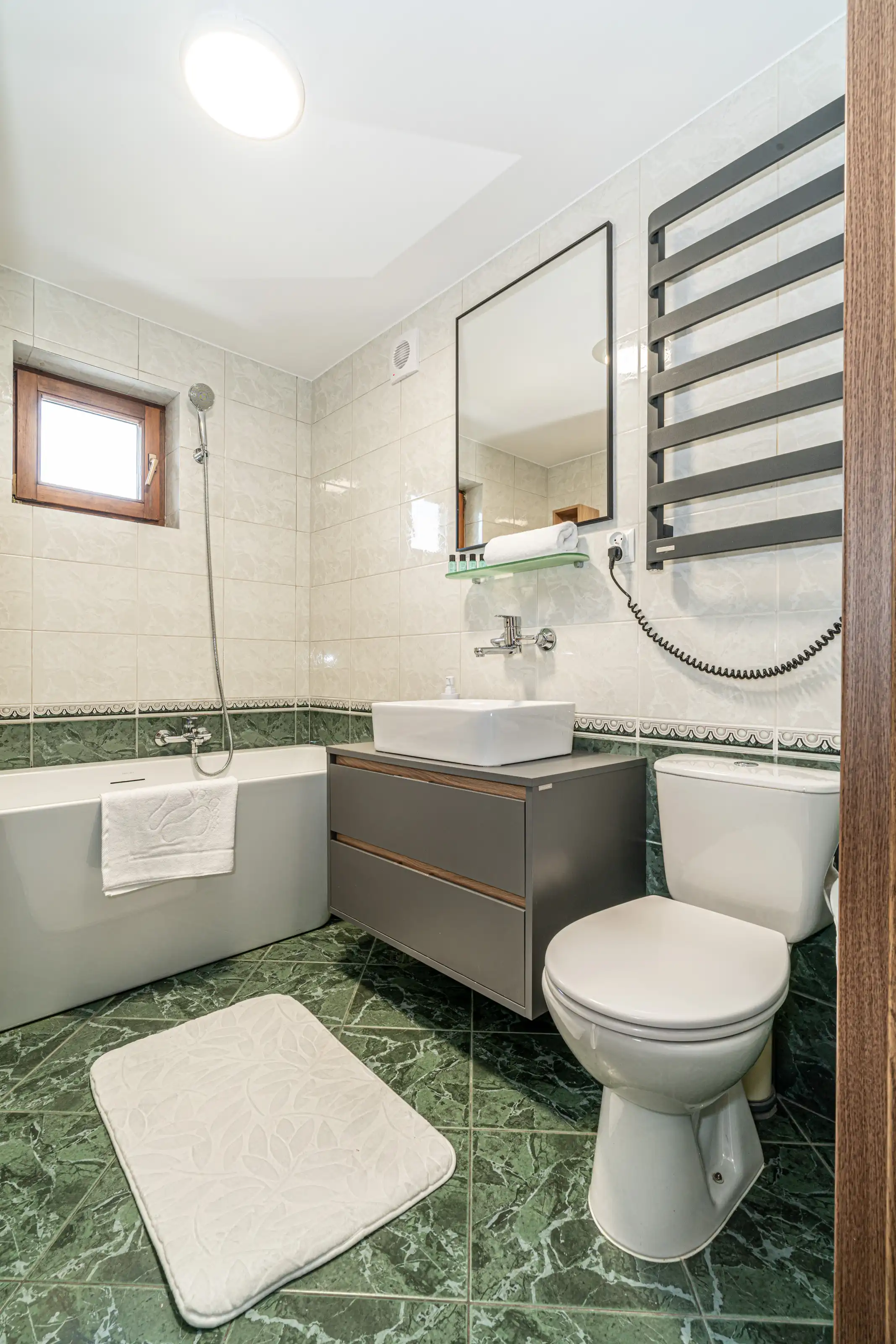 Łazienka III: toaleta, wanna, umywalka, szafka, lustro, grzejnik łazienkowy, suszarka, ręczniki.
