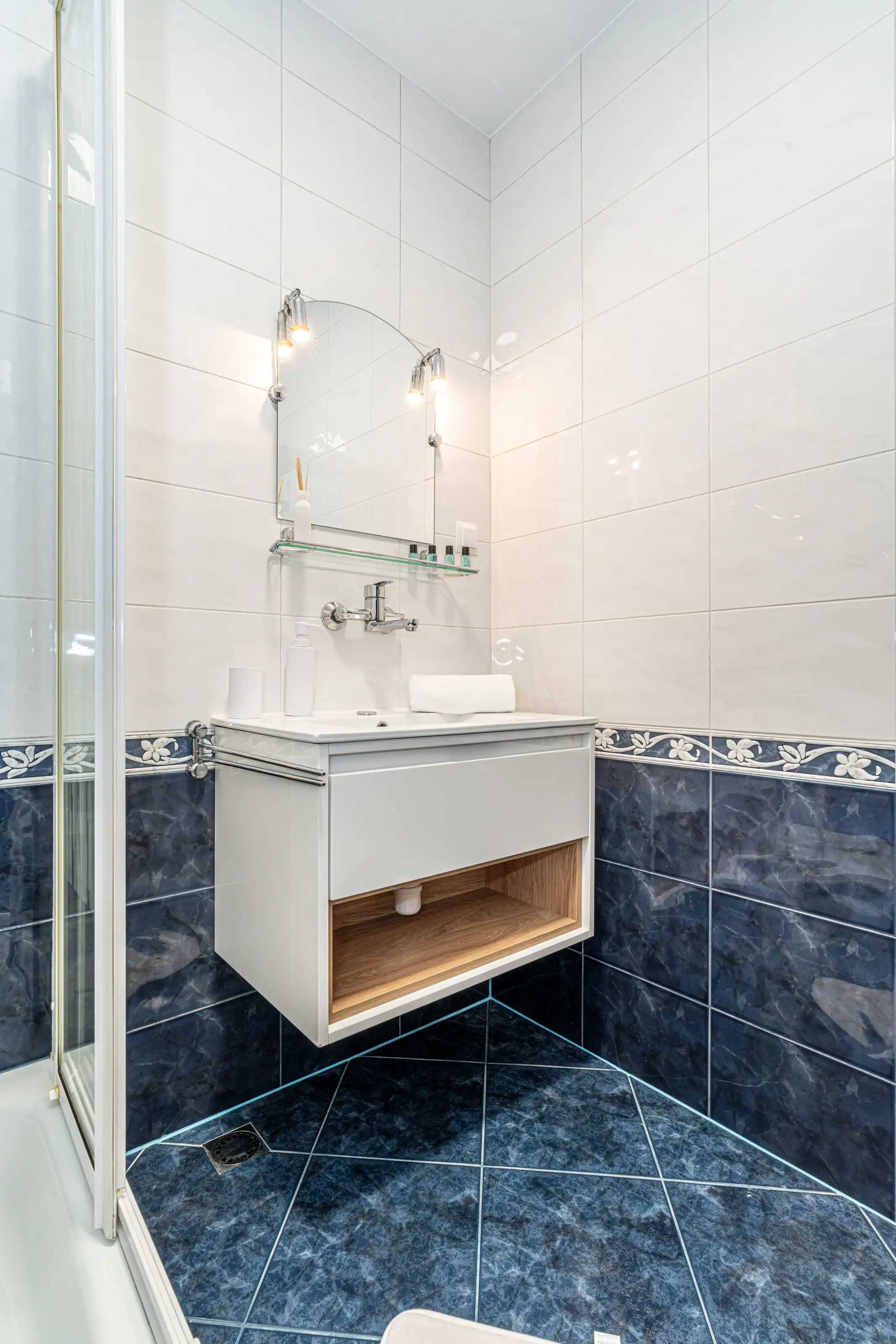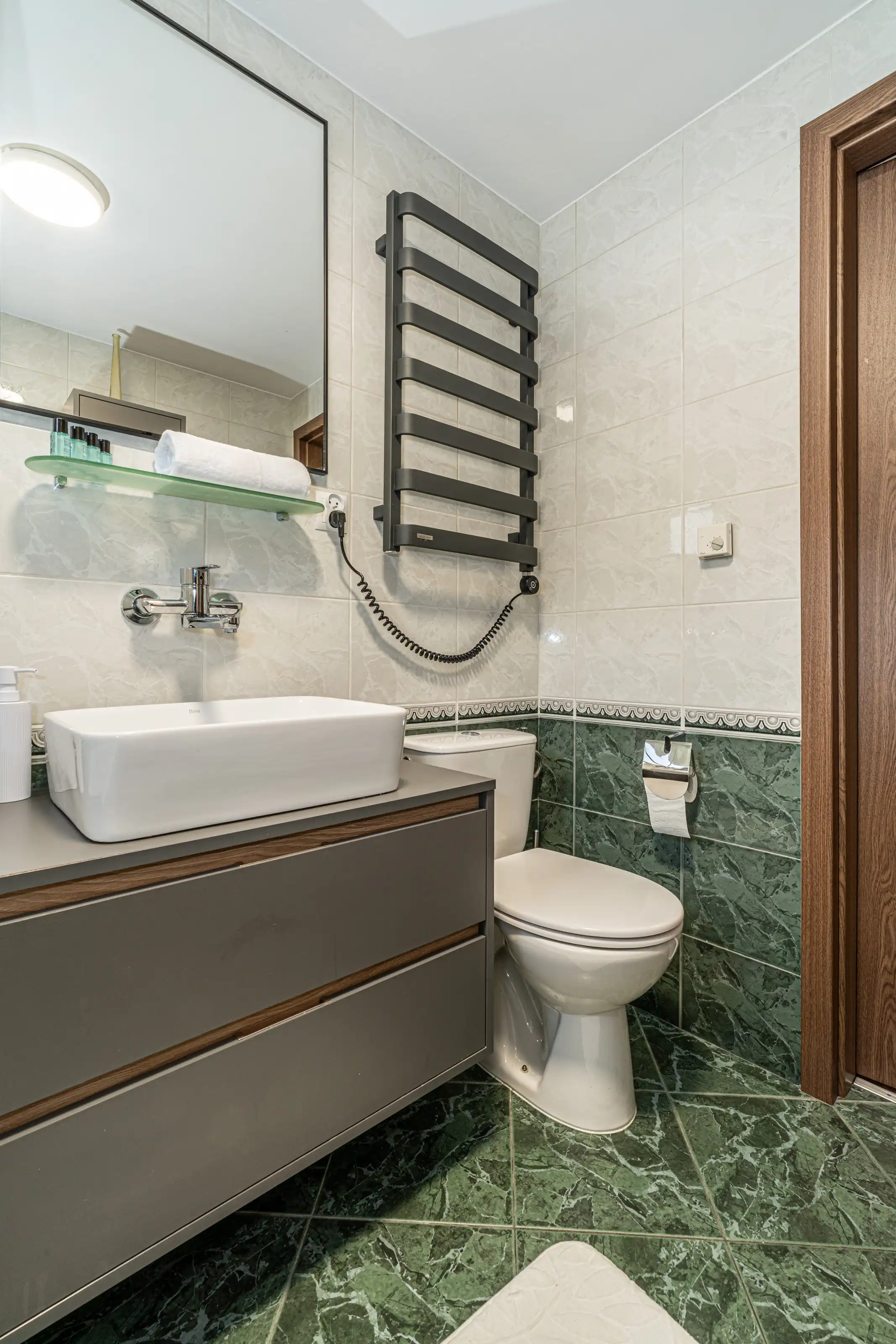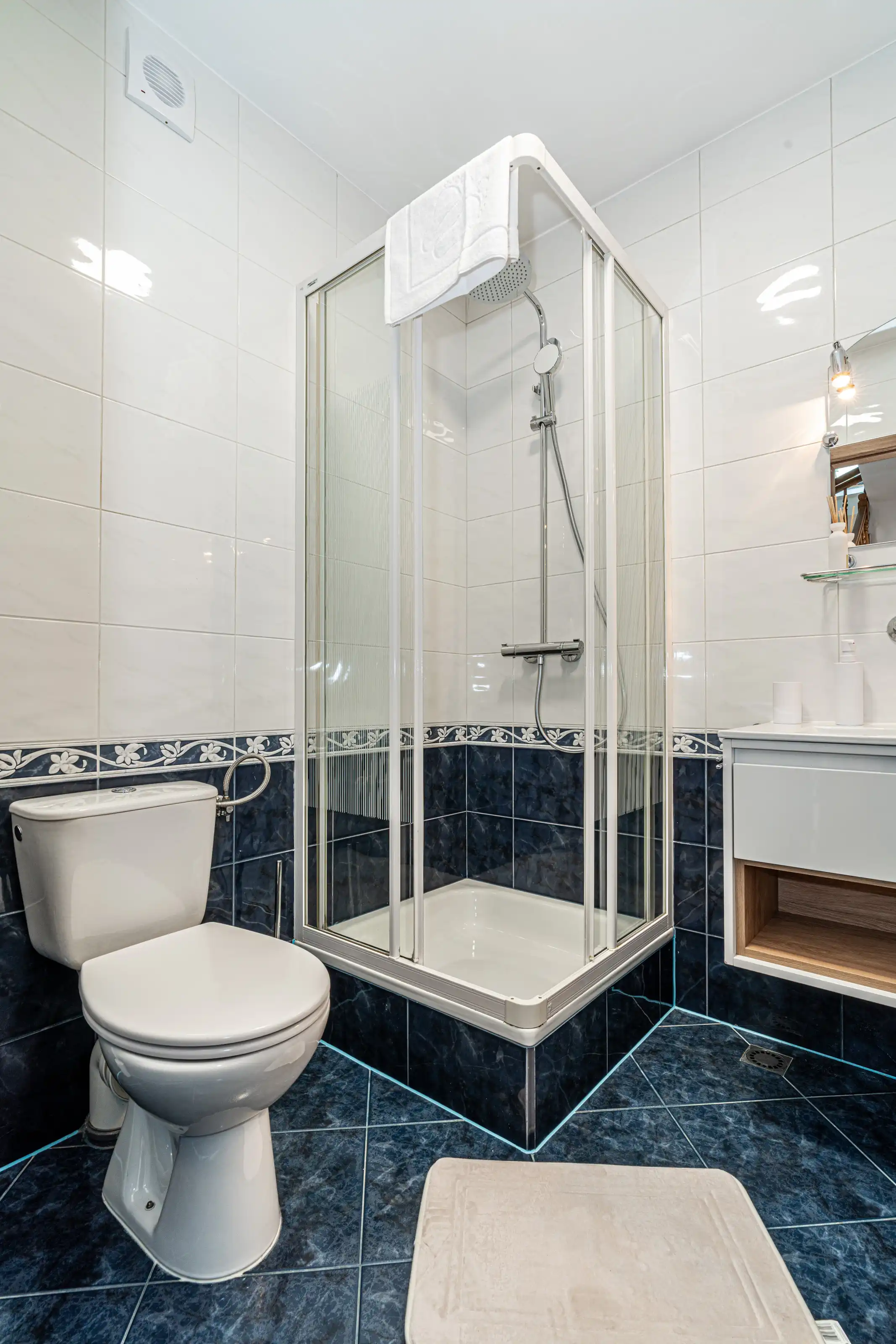 Łazienka II: toaleta, prysznic, umywalka, szafka, lustro, grzejnik łazienkowy, suszarka, ręczniki.