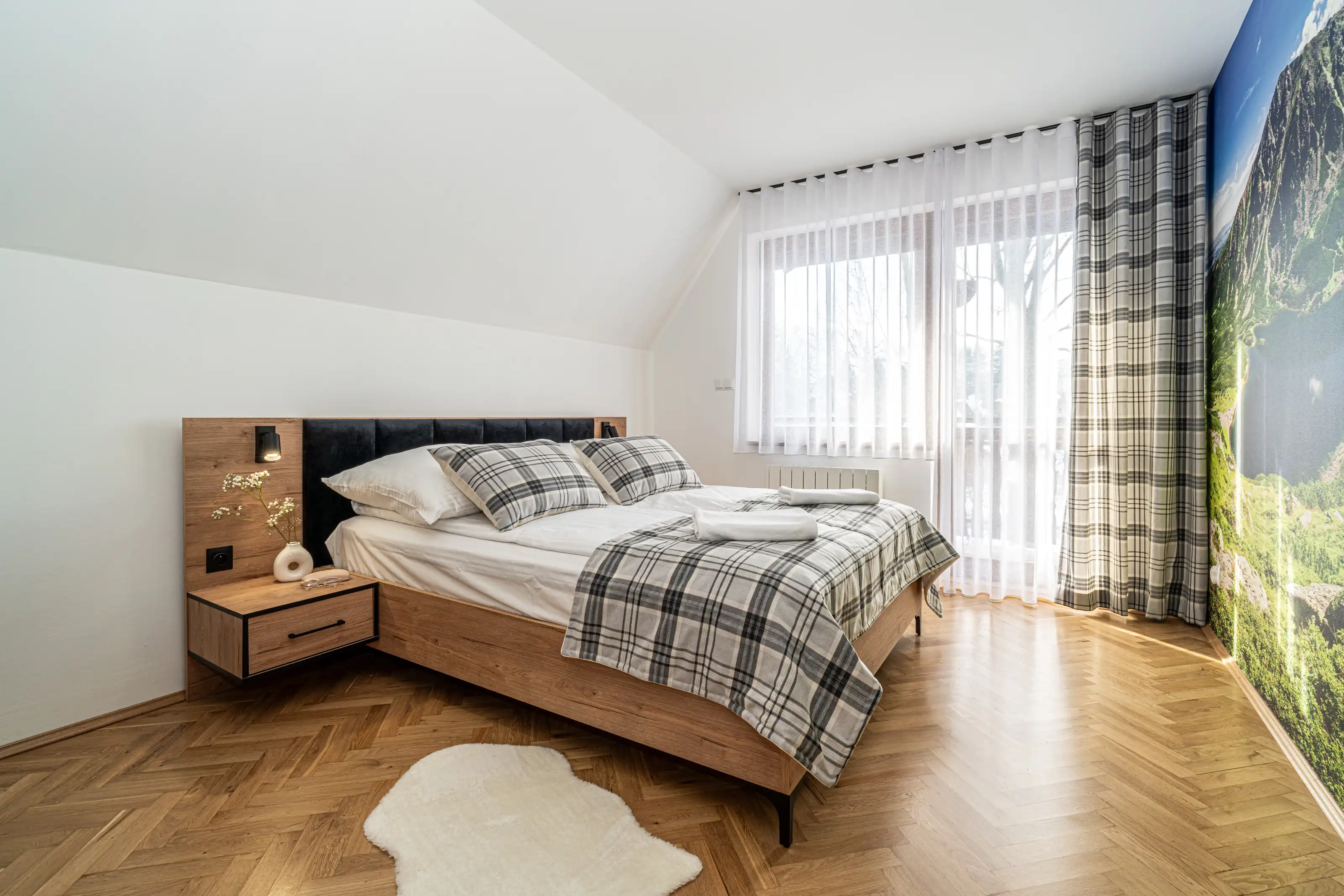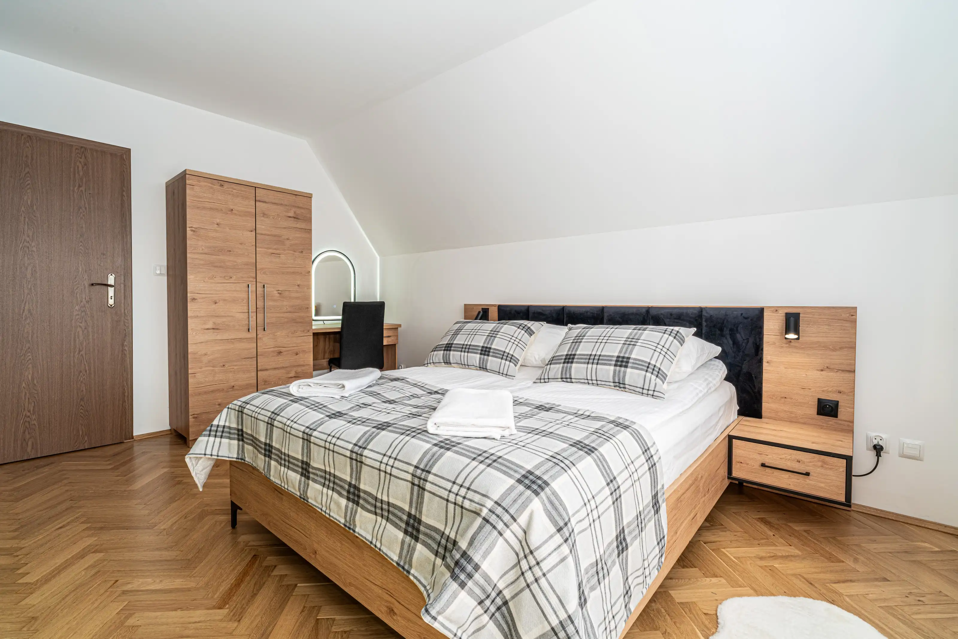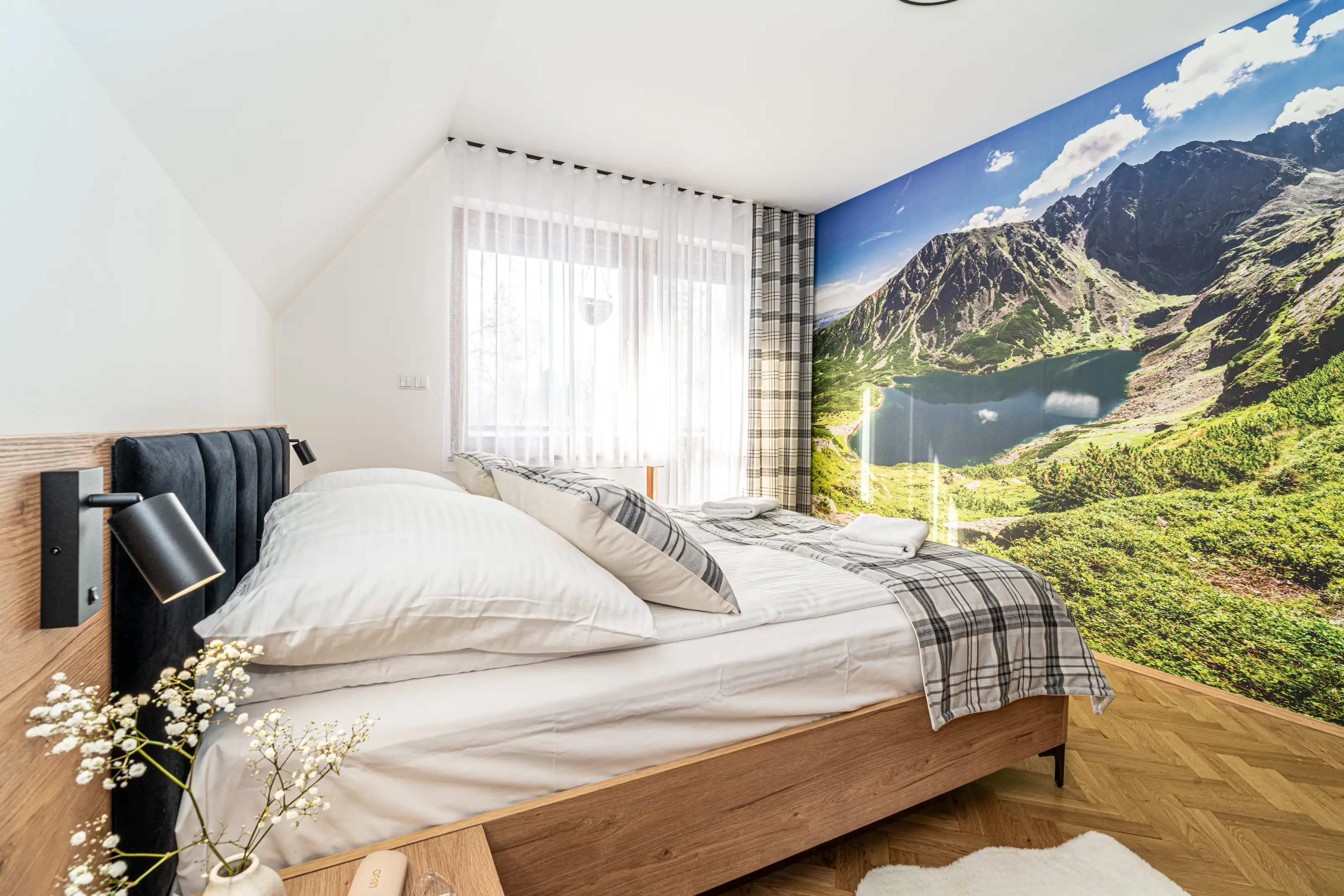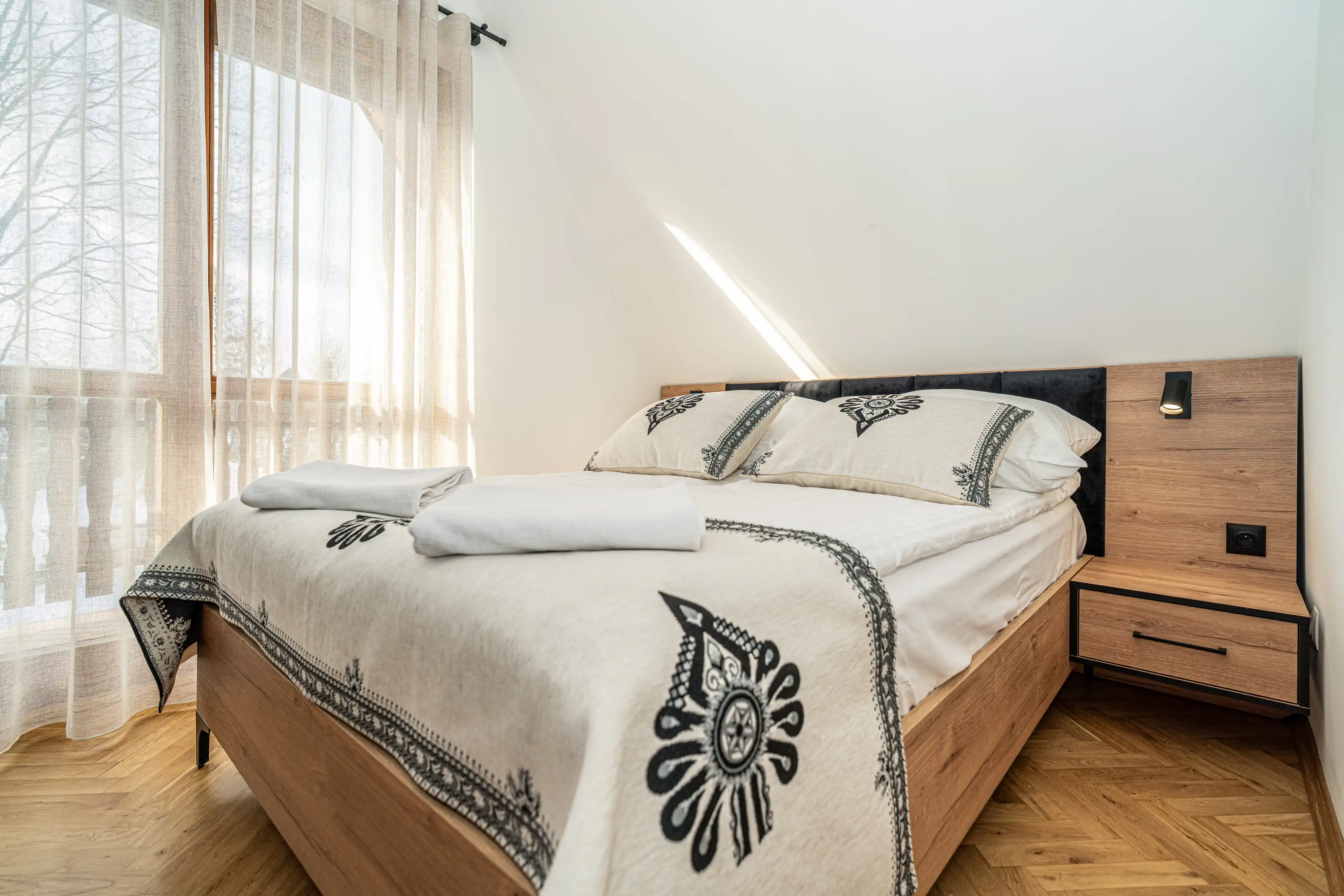 Sypialnia II: łoże małżeńskie, dwa stoliki nocne z oświetleniem, szafa, biurko z krzesłem, wyjście na balkon.