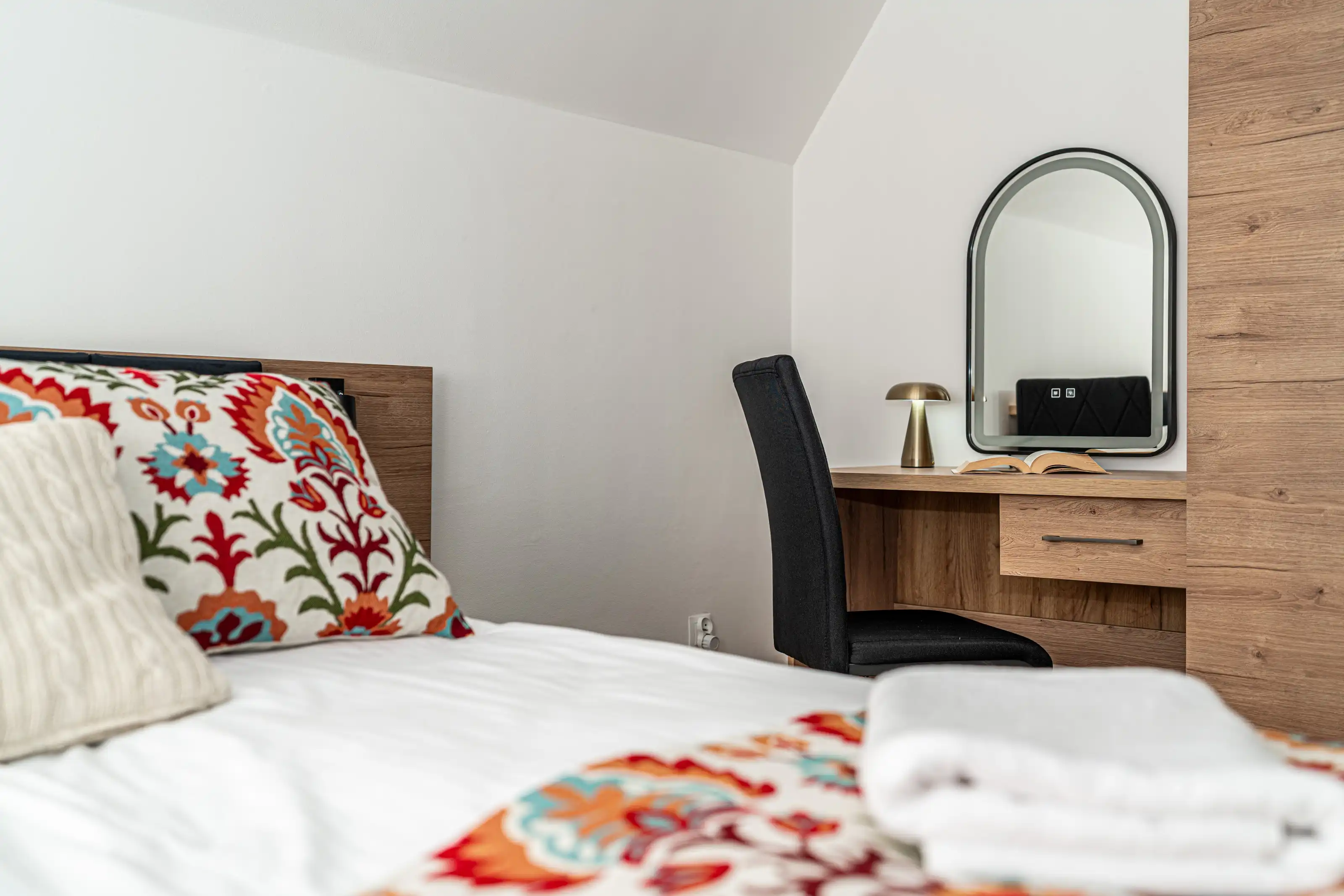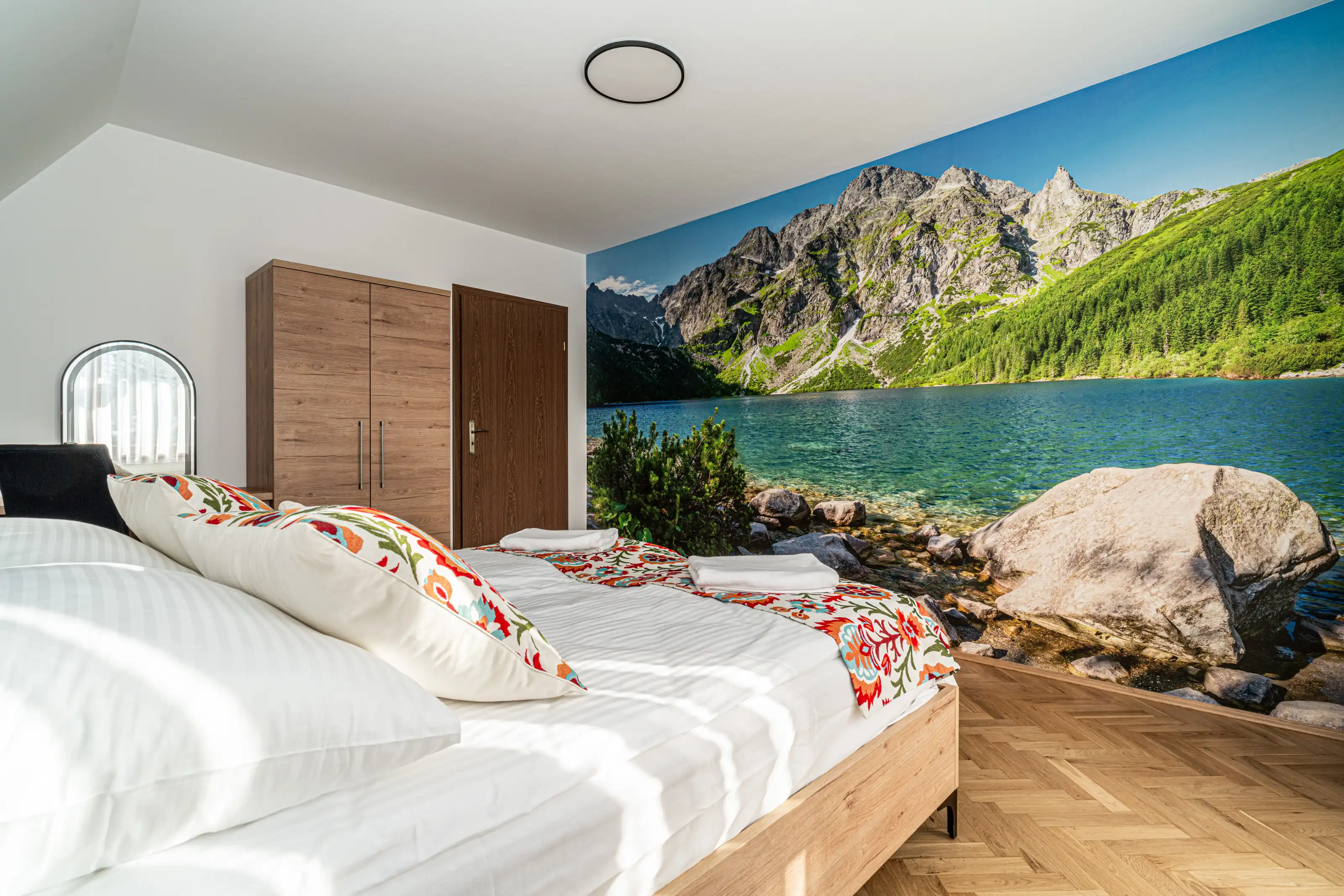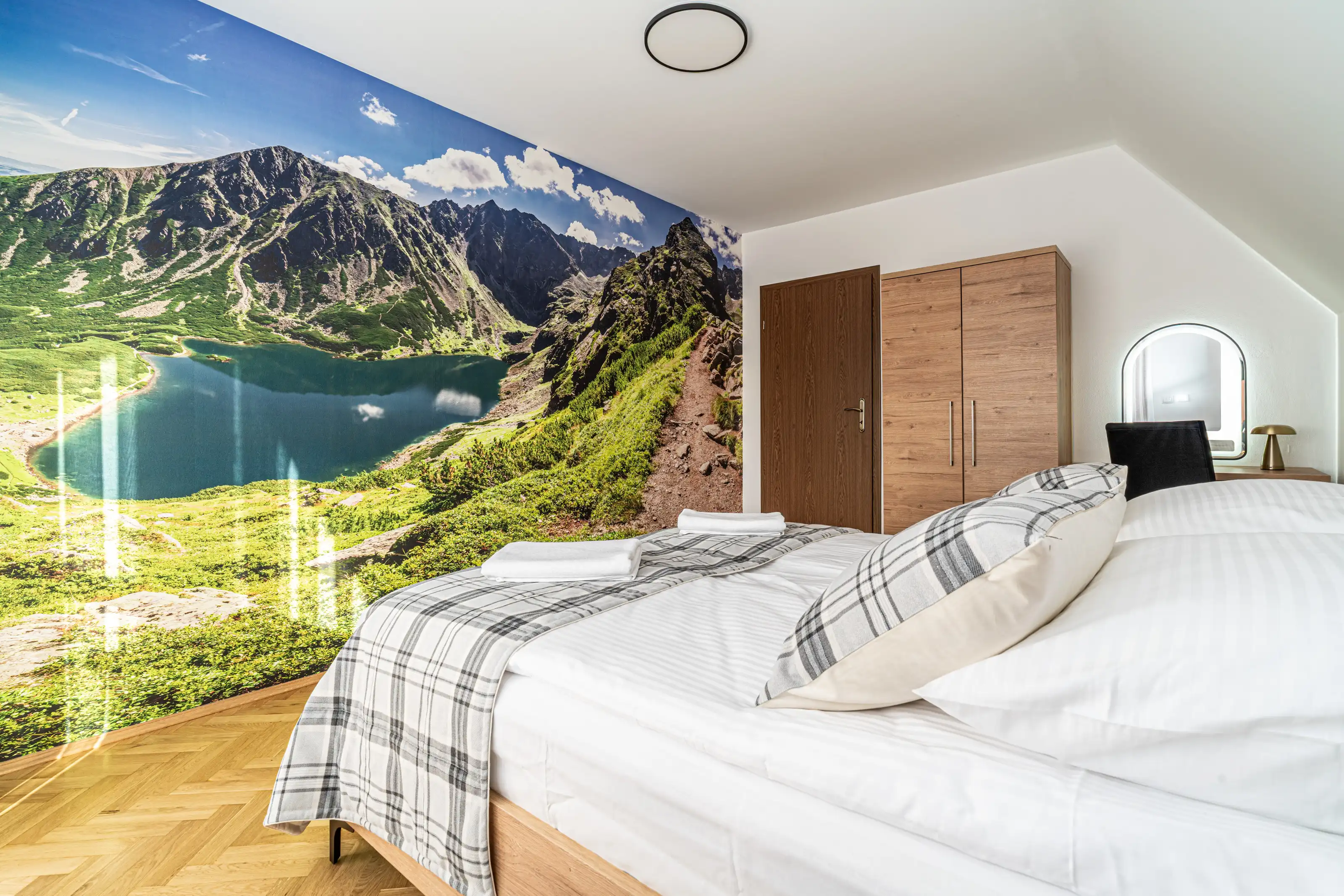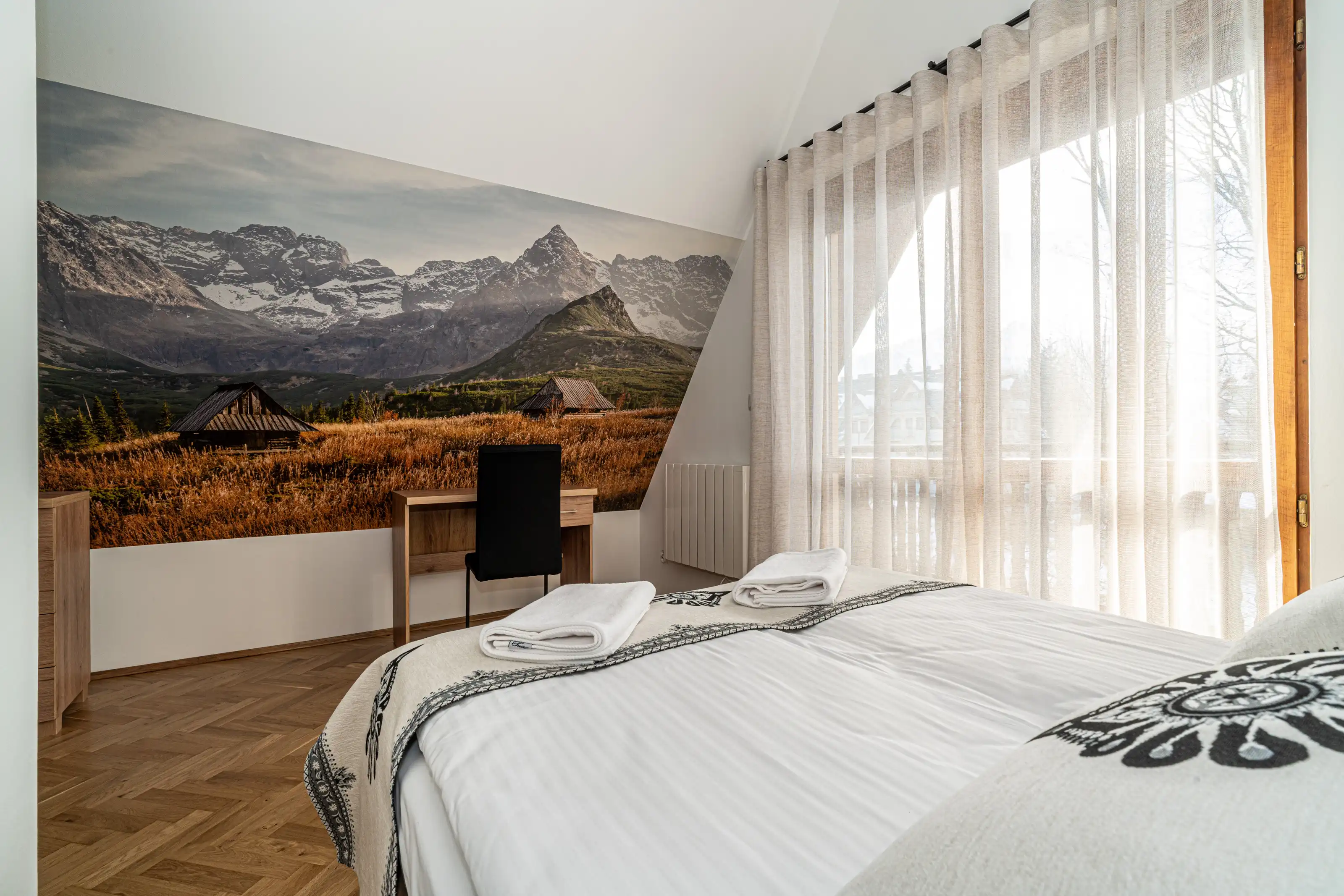 Sypialnia II: łoże małżeńskie, dwa stoliki nocne z oświetleniem, szafa, biurko z krzesłem, wyjście na balkon.
