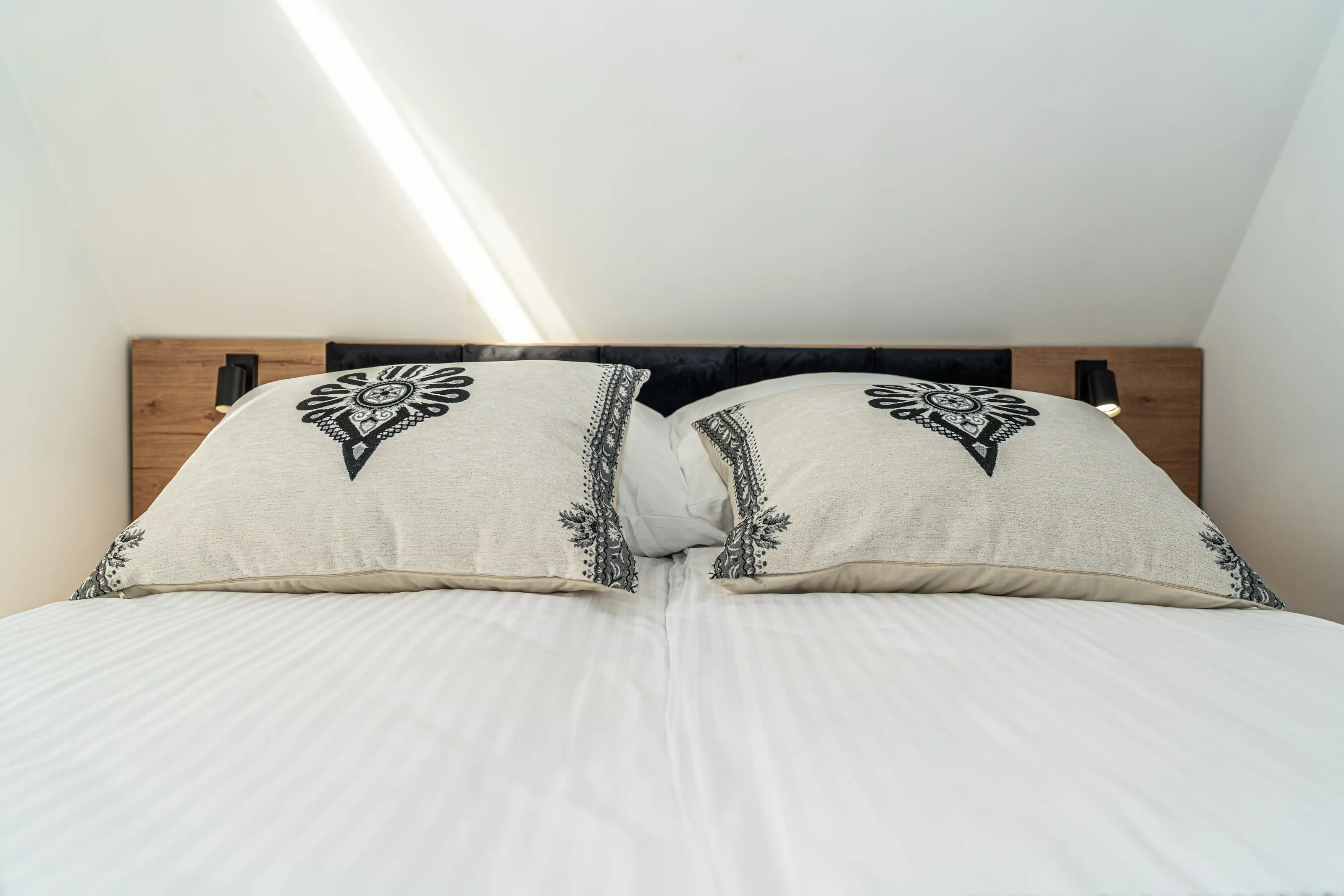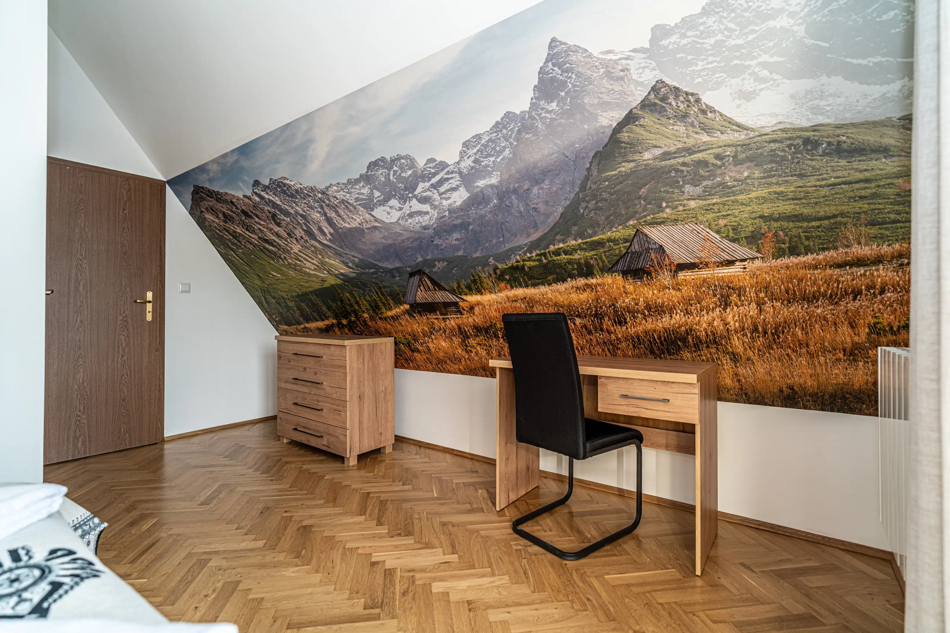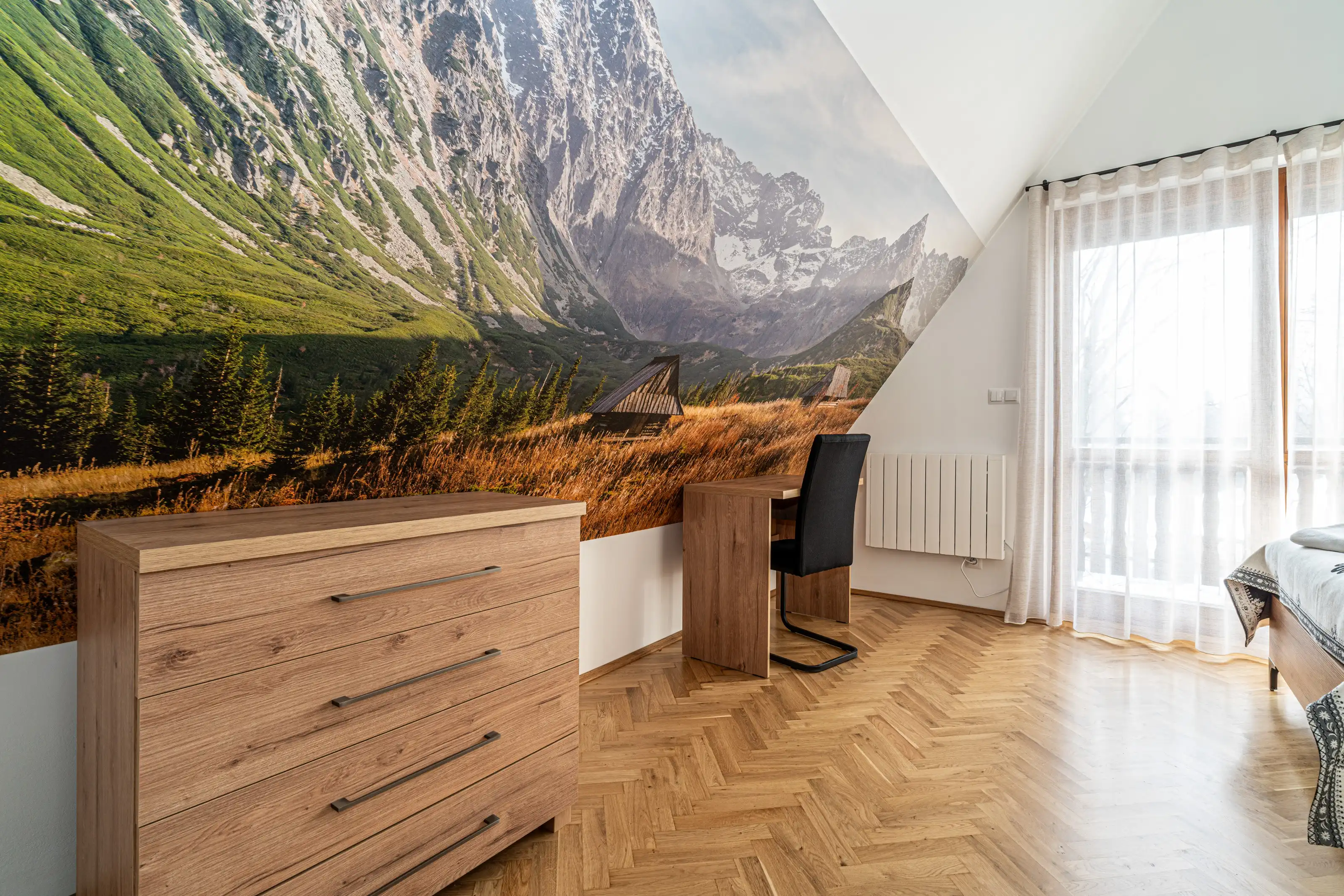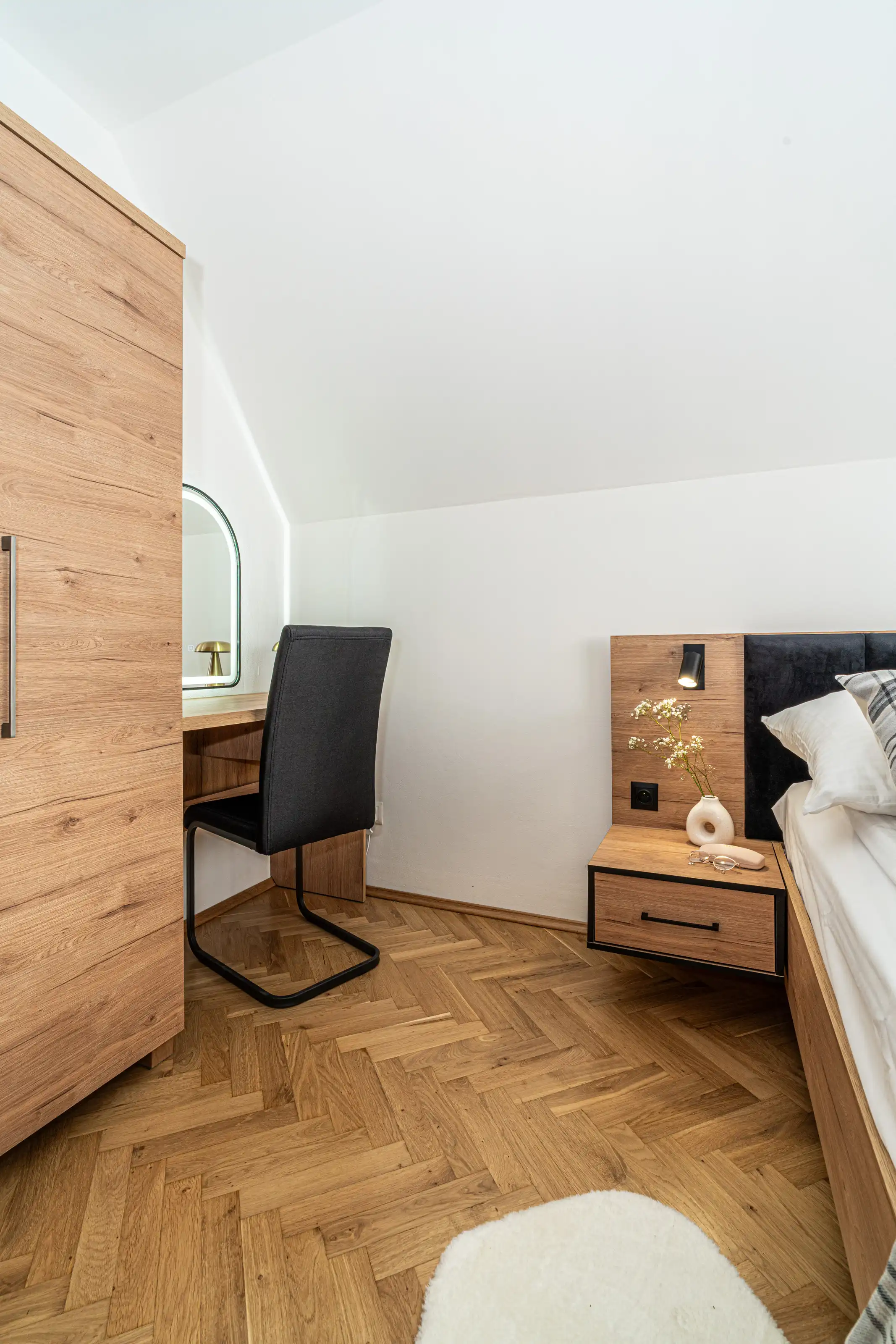 Sypialnia II: łoże małżeńskie, dwa stoliki nocne z oświetleniem, szafa, biurko z krzesłem, wyjście na balkon.