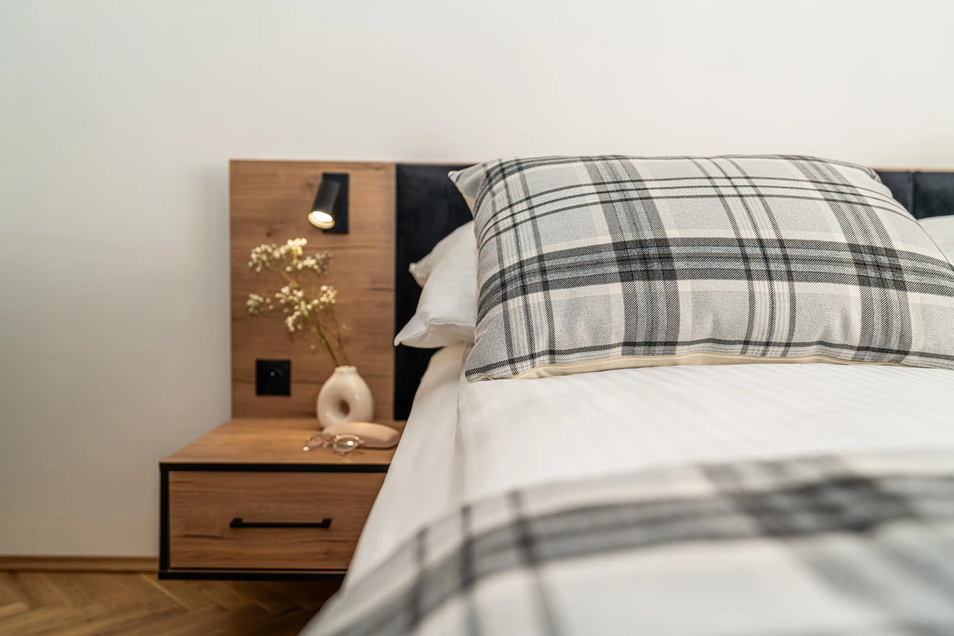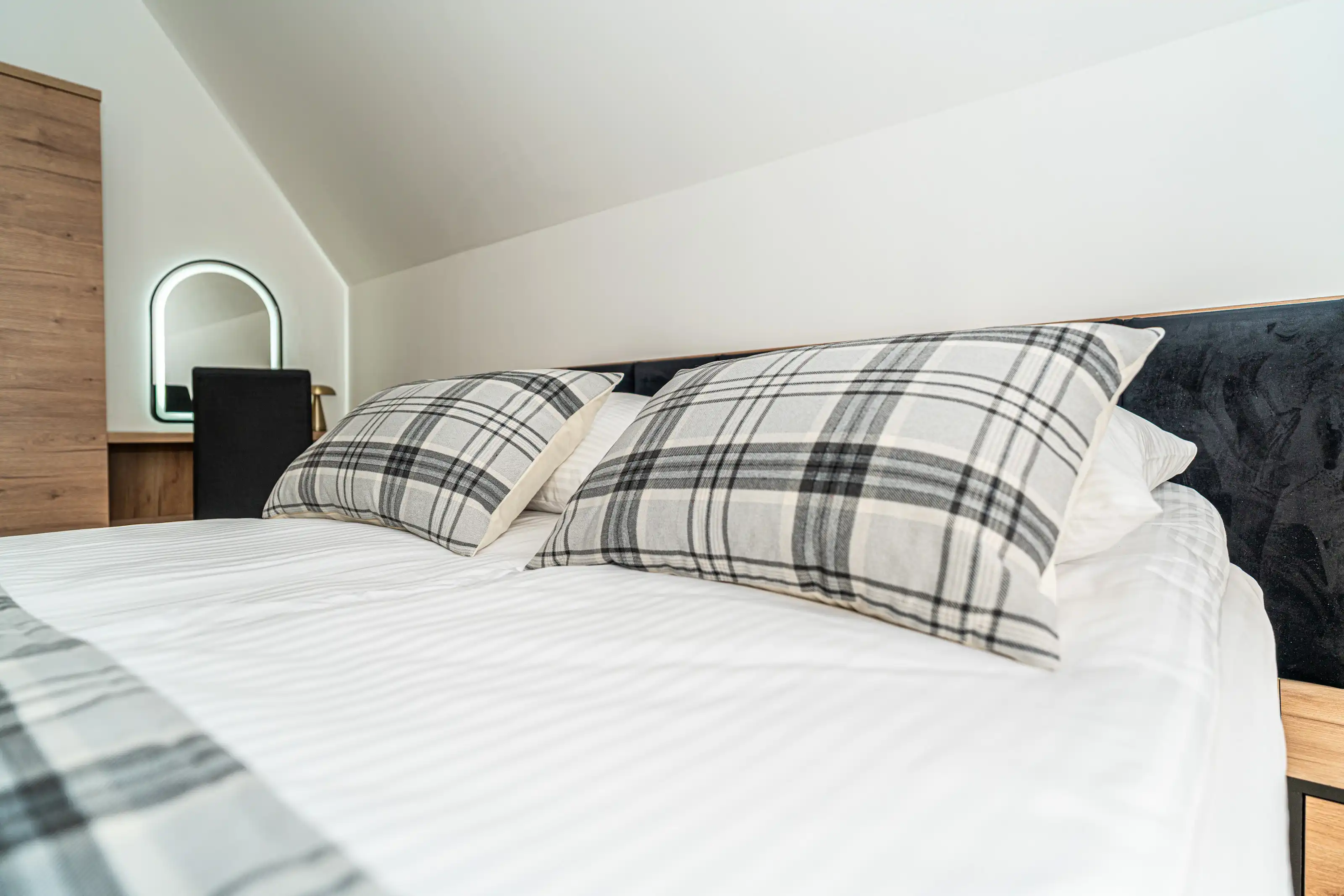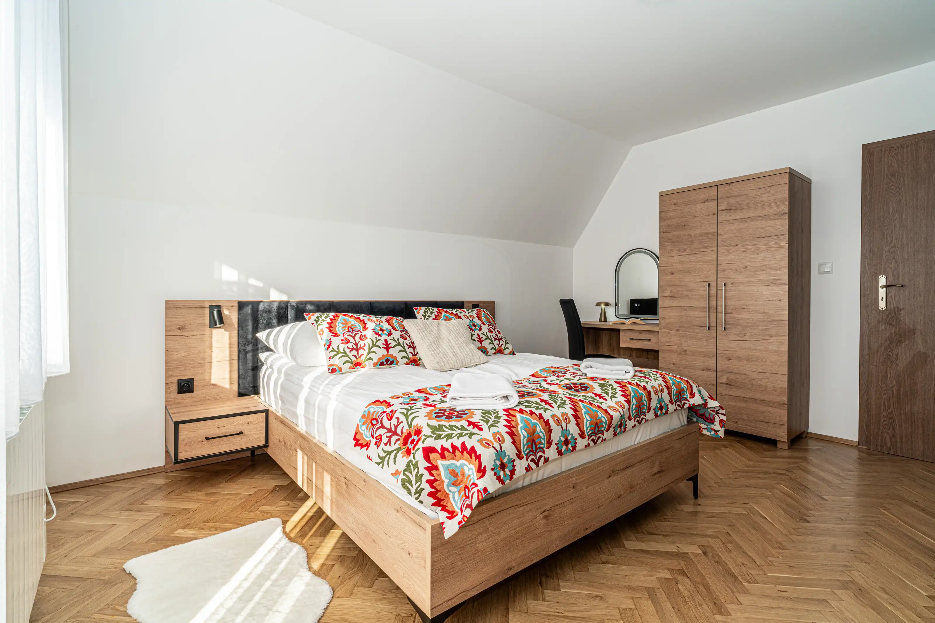 Sypialnia I: łoże małżeńskie 120 cm , dwa stoliki nocne z oświetleniem, szafa, biurko z krzesłem, wyjście na balkon.