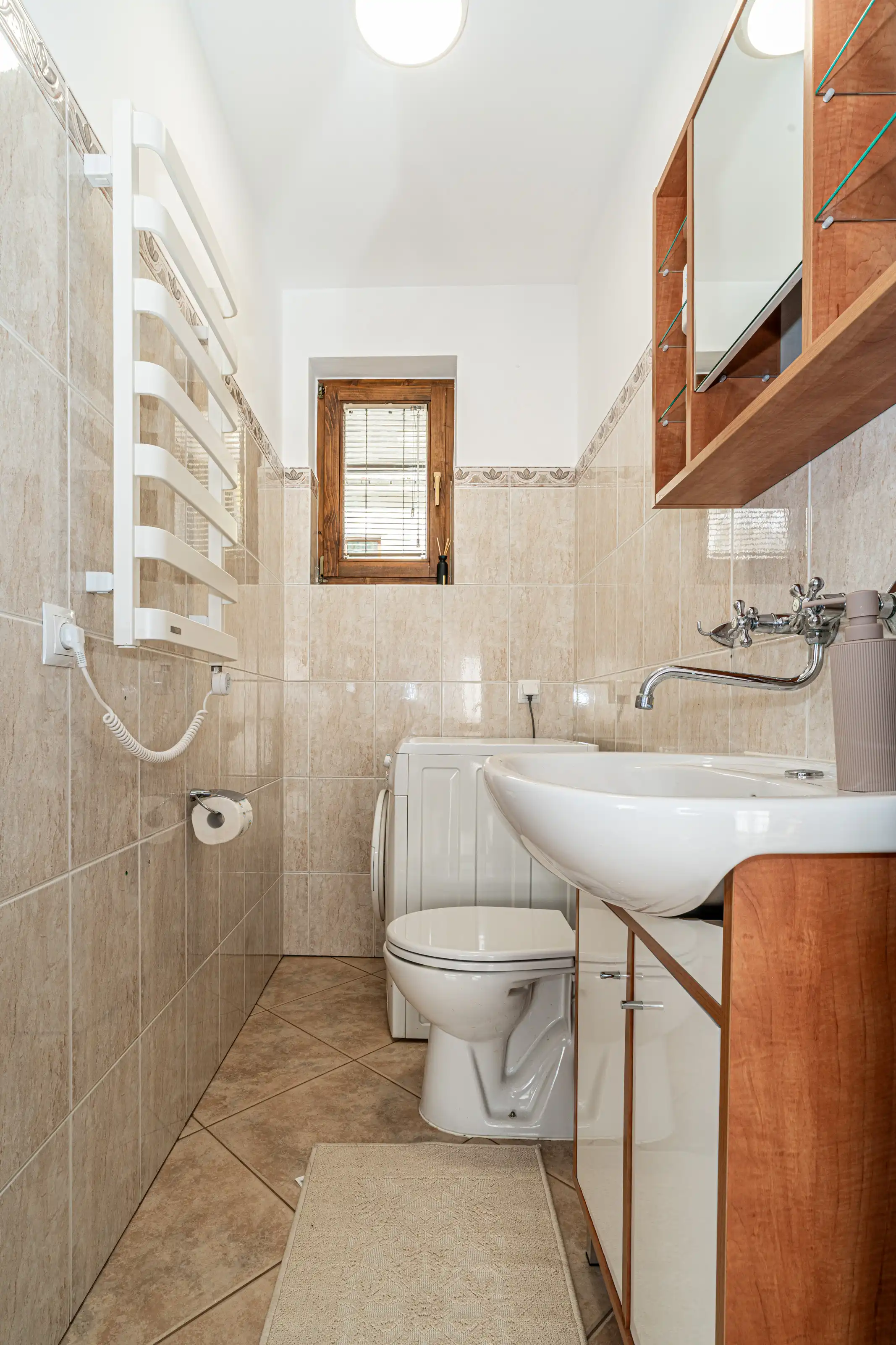 Łazienka I: toaleta, umywalka, szafka, lustro, grzejnik łazienkowy, suszarka, ręczniki, pralka.