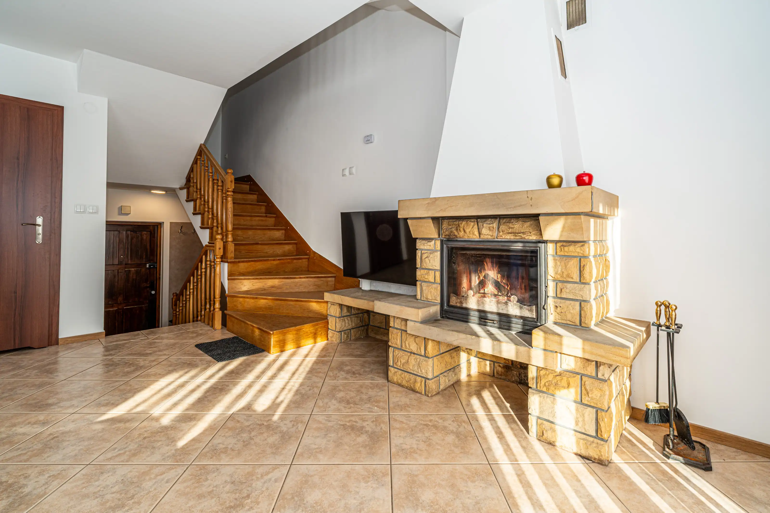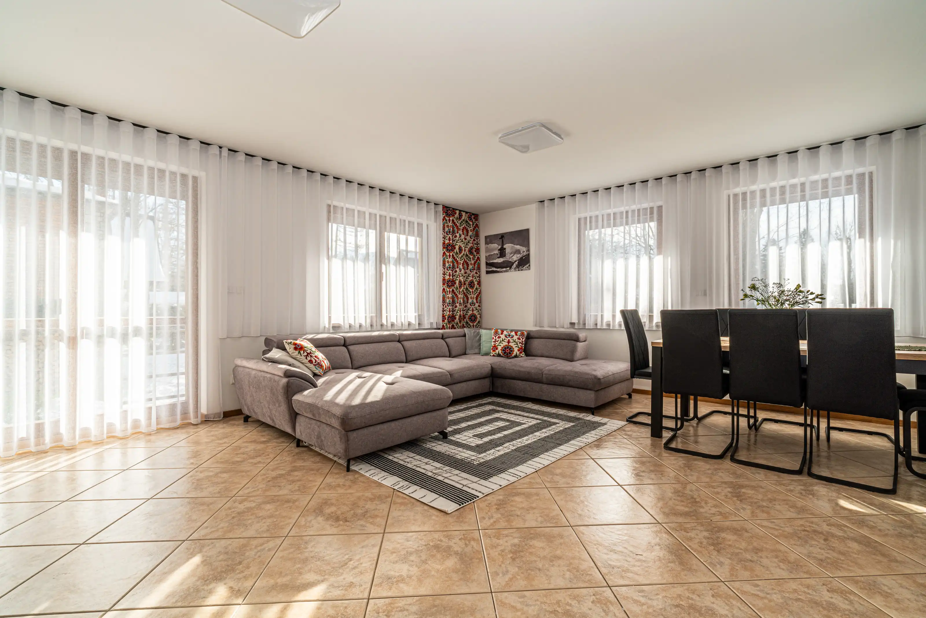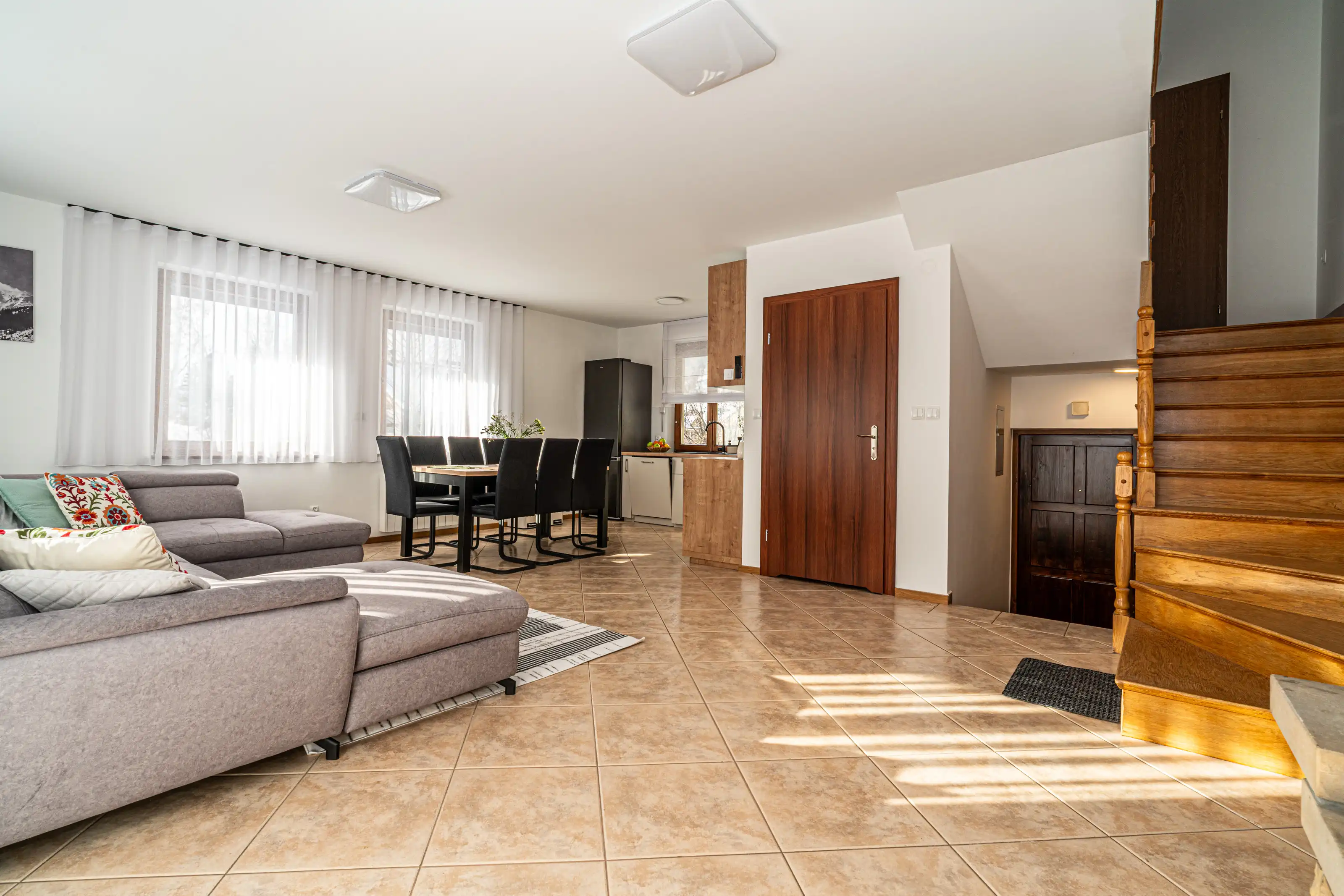 Salon: stół, 8 krzeseł, TV, kominek, rozkładany dwuosobowy narożnik, wyjście na taras z ogrodem.
