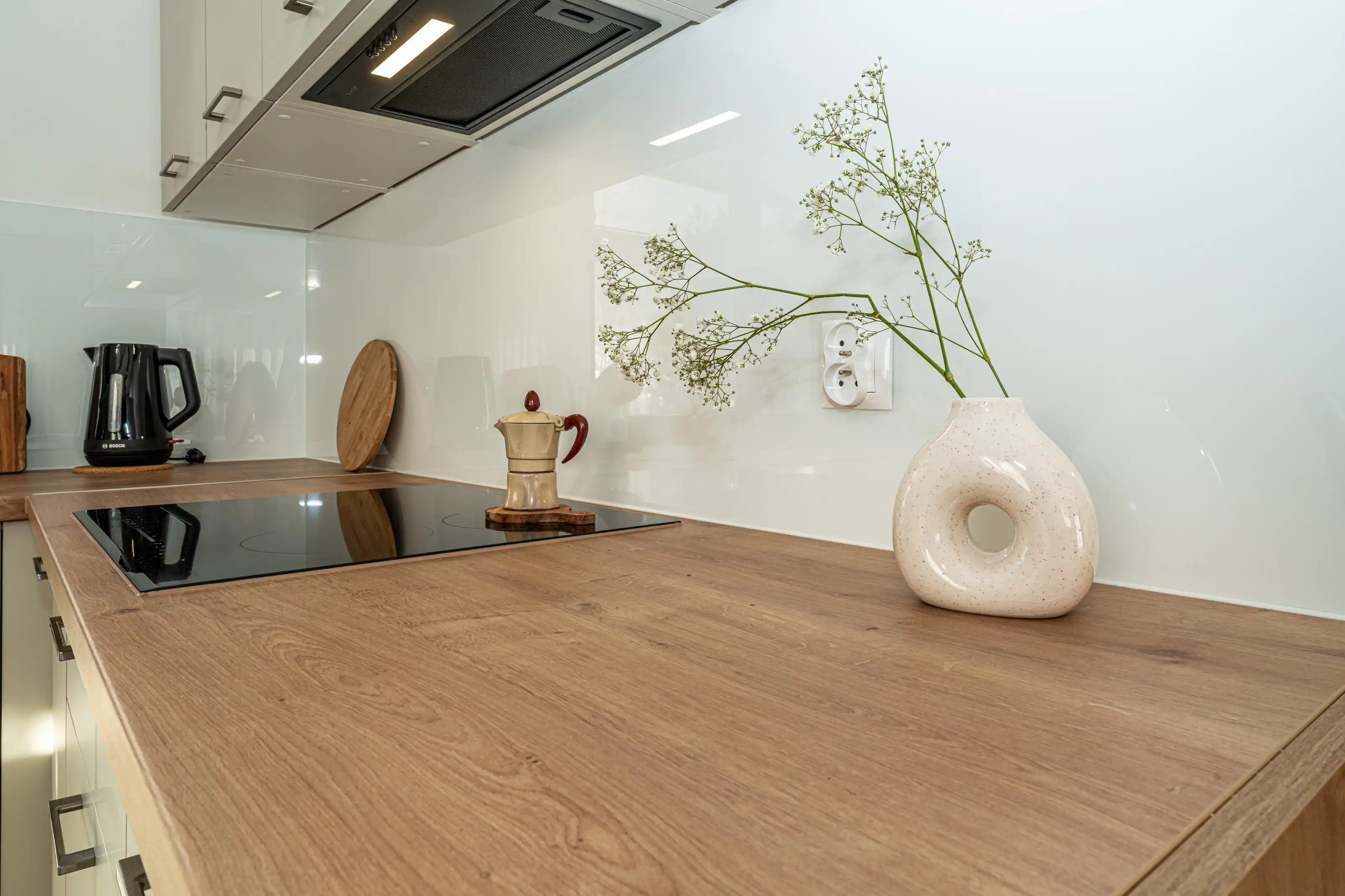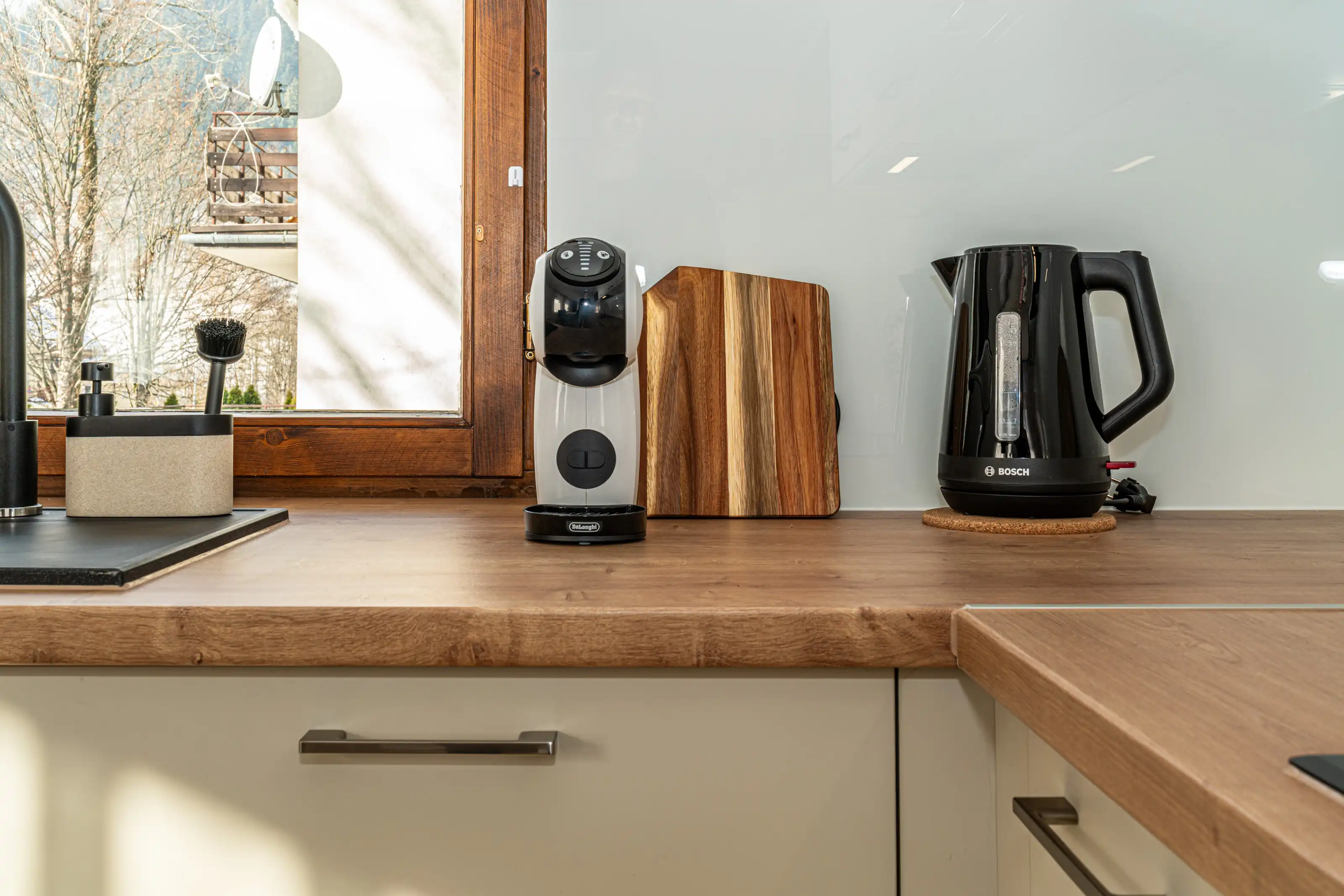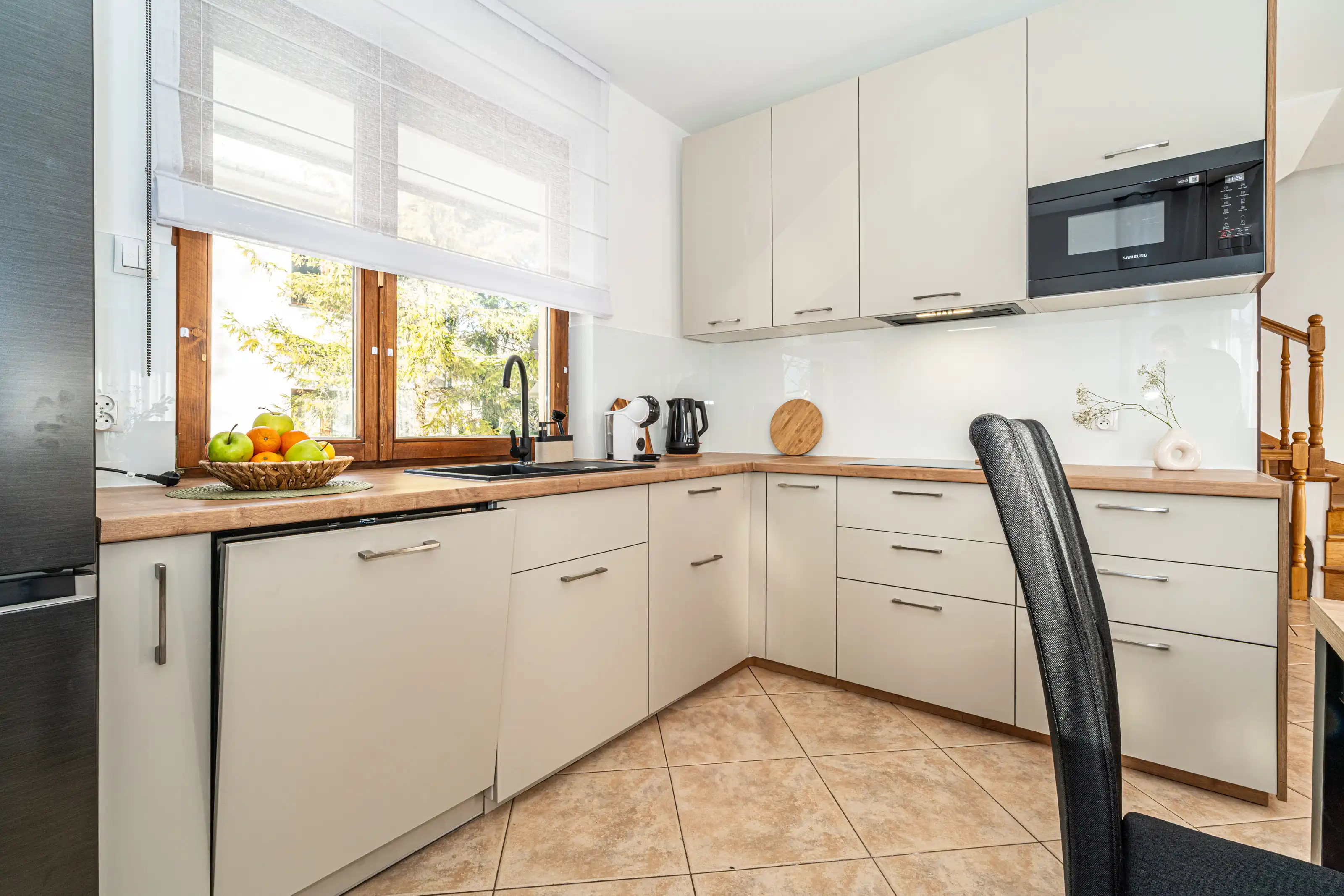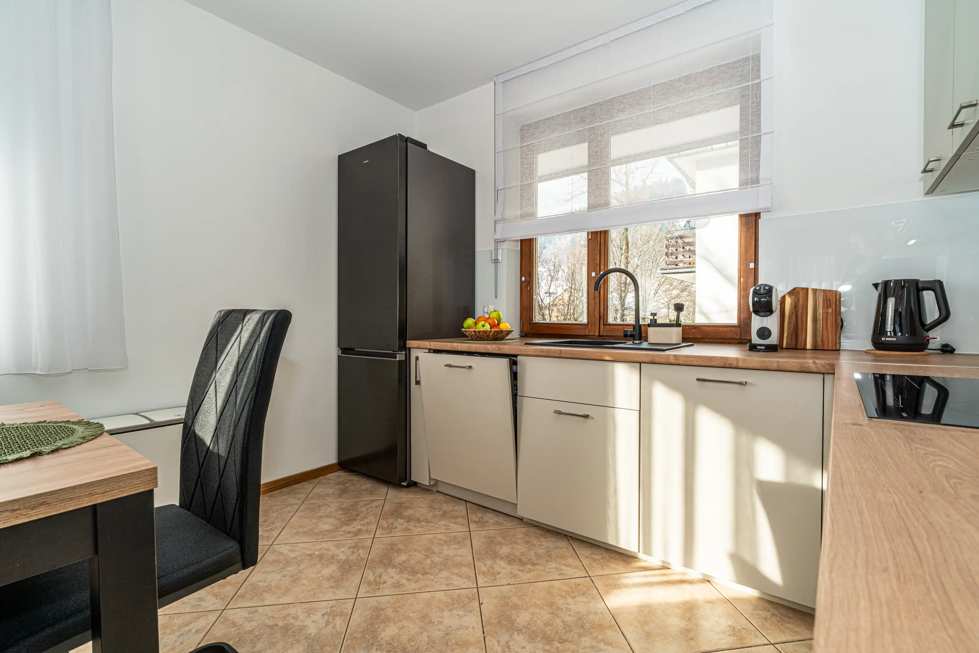 Kuchnia: zabudowa kuchenna, lodówka, płyta indukcyjna, okap, mikrofalówka, zmywarka i zlewozmywak. Wyposażony jest ekspres do kawy, czajnik, garnki i patelnie, oraz zastawę stołową .